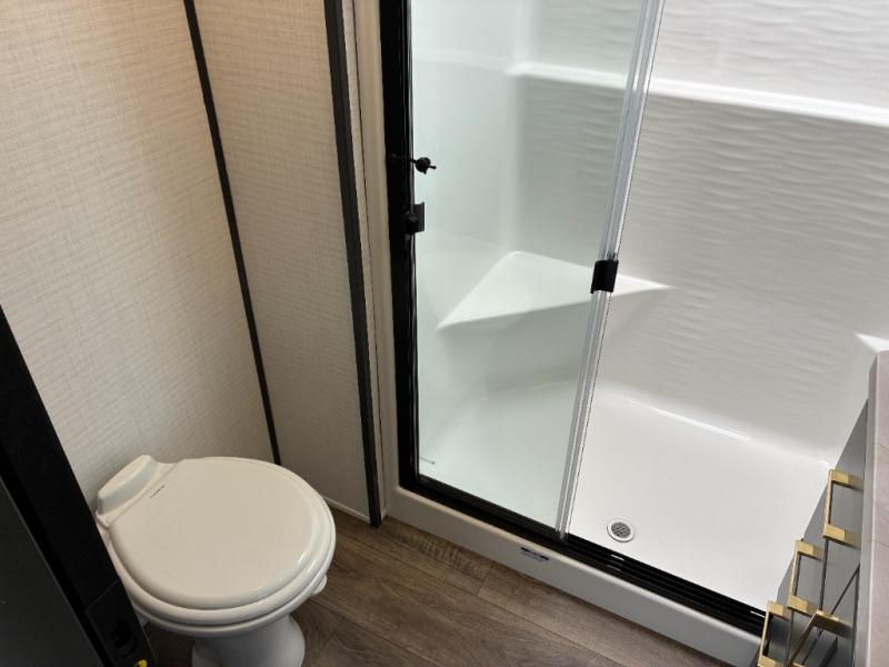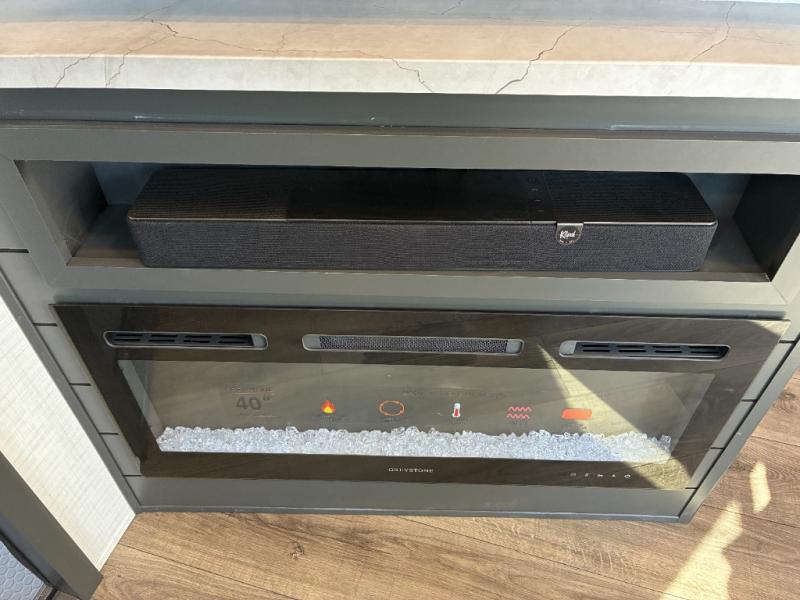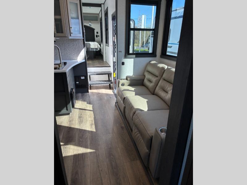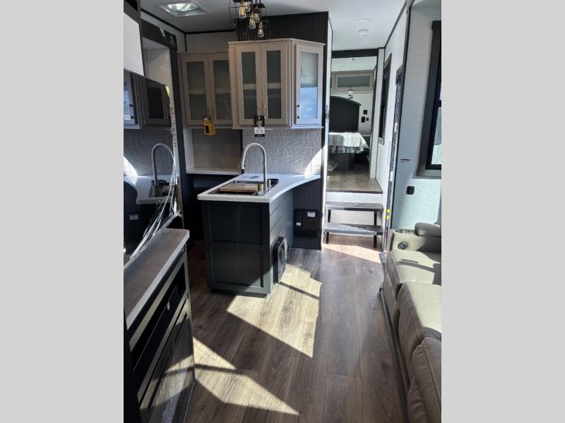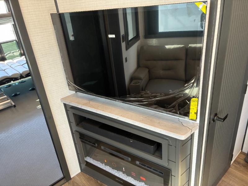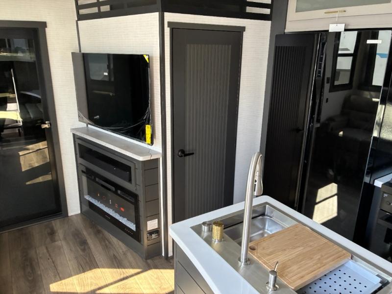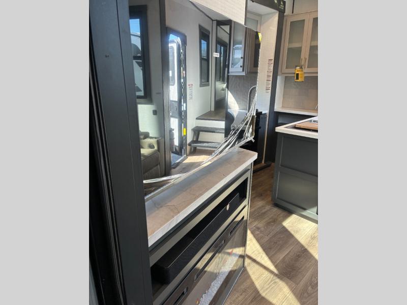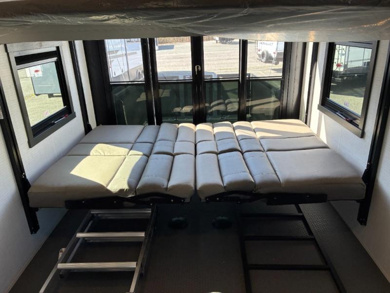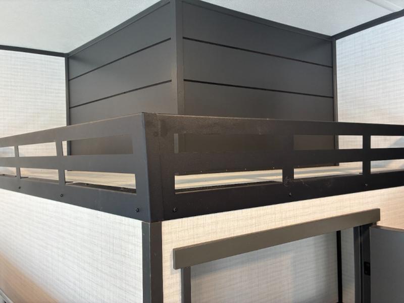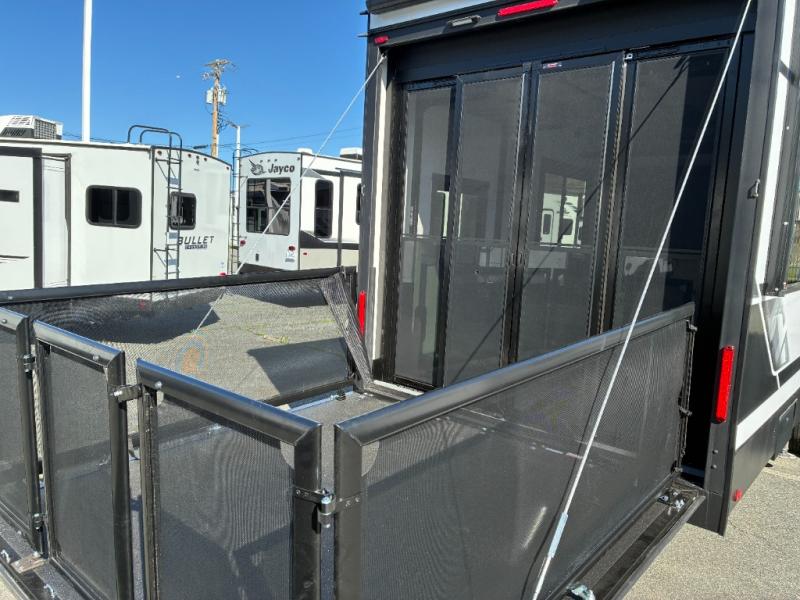 Load up the dirt bikes, grab your helmet, and head out with this toy hauler in tow! Once you arrive at your campsite and have unloaded your toys from the 15' garage, you can set up the gaucho sofas with removable tables or let your guest rest on the Sleep N Store bed above. There is even a half bath here and a loft for more sleeping or storage space. The spacious main living area/kitchen includes a counter peninsula, dual opposing slides, and a sofa across from the fireplace and TV for easy viewing. You'll find the full bath up front close to the front private bedroom, complete with a king bed and wardrobe slide!