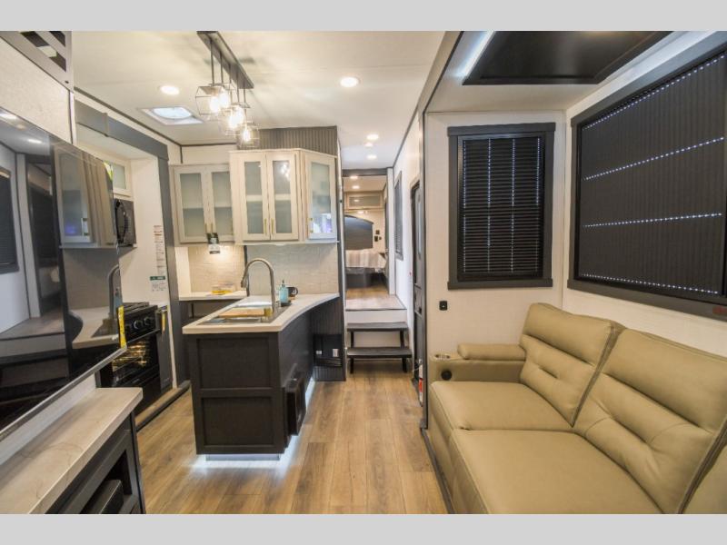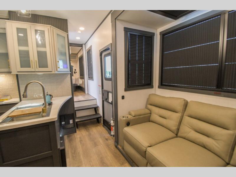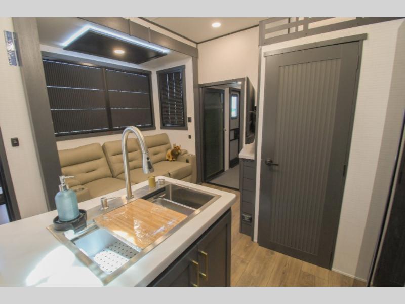 Load up the dirt bikes, grab your helmet, and head out with this toy hauler in tow! Once you arrive at your campsite and have unloaded your toys from the 15' garage, you can set up the gaucho sofas with removable tables or let your guest rest on the Sleep N Store bed above. There is even a half bath here and a loft for more sleeping or storage space. The spacious main living area/kitchen includes a counter peninsula, dual opposing slides, and a sofa across from the fireplace and TV for easy viewing. You'll find the full bath up front close to the front private bedroom, complete with a king bed and wardrobe slide!