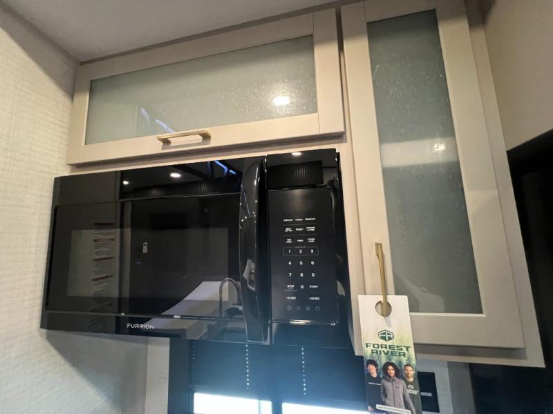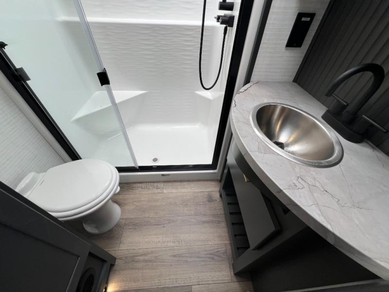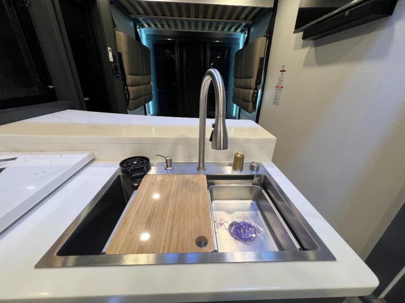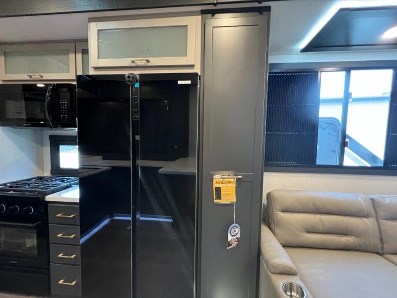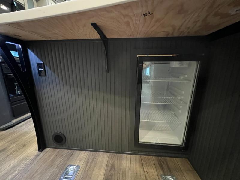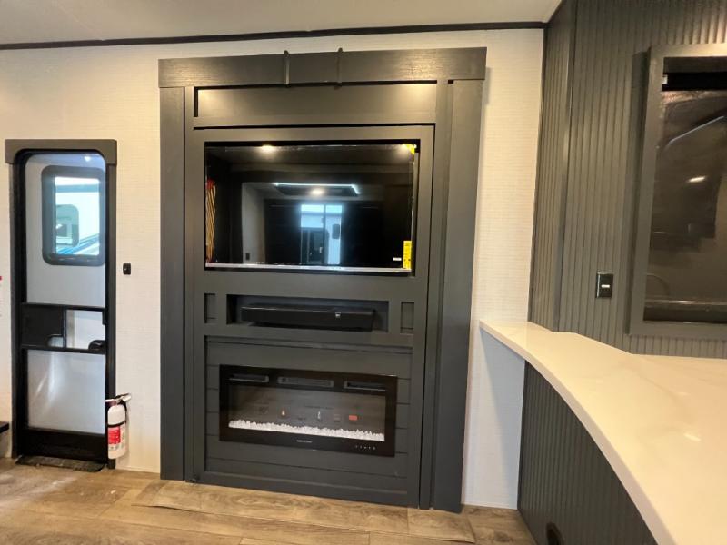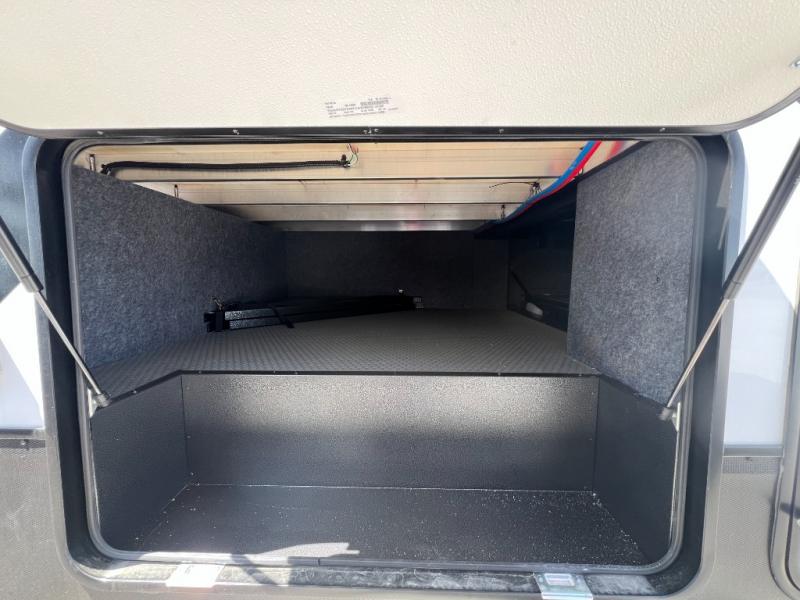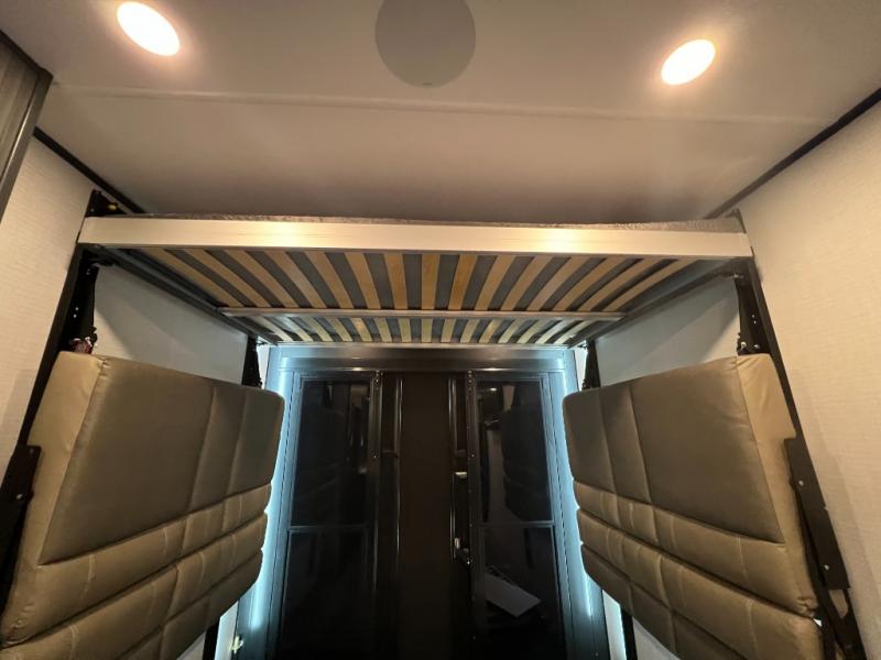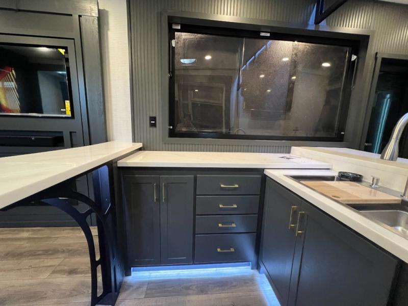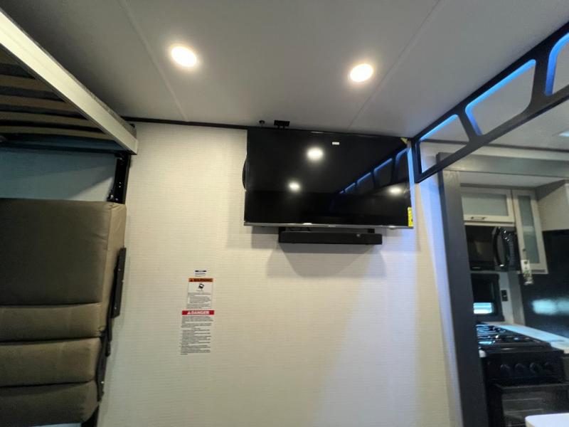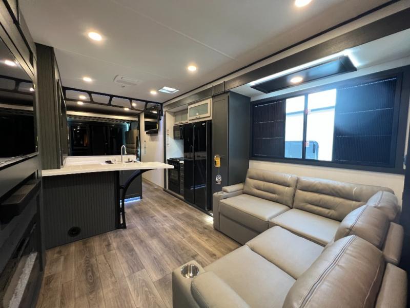 It's easy to see why this model was voted 2025 Top Innovation by RV Business! Once you arrive at your destination, you can unload your toys from the 13' garage, then relax on the dual gaucho sofas with a removable dinette table in between. There is also a queen-size Euro bed above the sofa where guests can sleep. Everyone will love to visit on the side patio that features a flip-down bar top and a window that looks into the kitchen. There are also bar stools here and inside at the counter so everyone has a seat. If the weather isn't cooperating, you can relax on the L-shaped sofa in the main living area, and there is a 55" TV with a hidden pantry behind for snacks! A spacious full bath will let everyone freshen up after trail riding, and you'll love having your own bedroom up front. Here, you'll find a king bed slide out, a wardrobe, dresser, plus washer and dryer prep if you choose to add those appliances!
