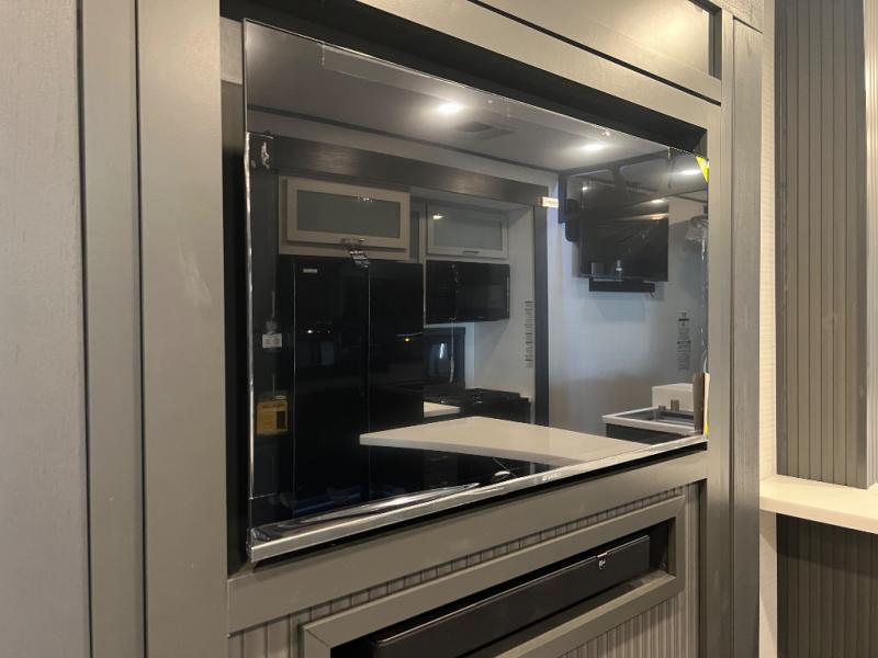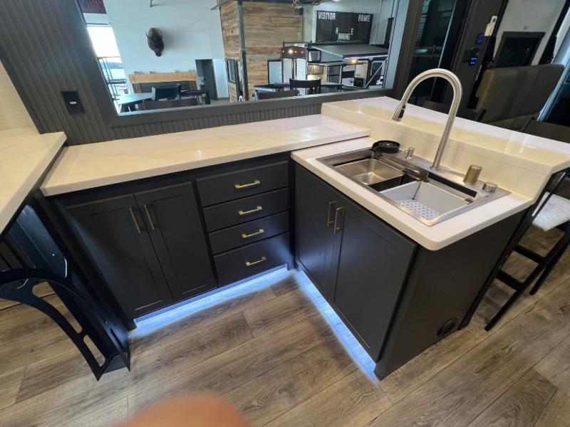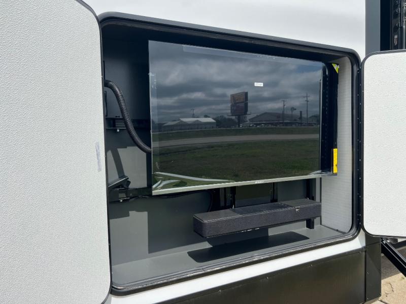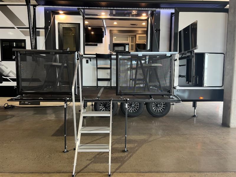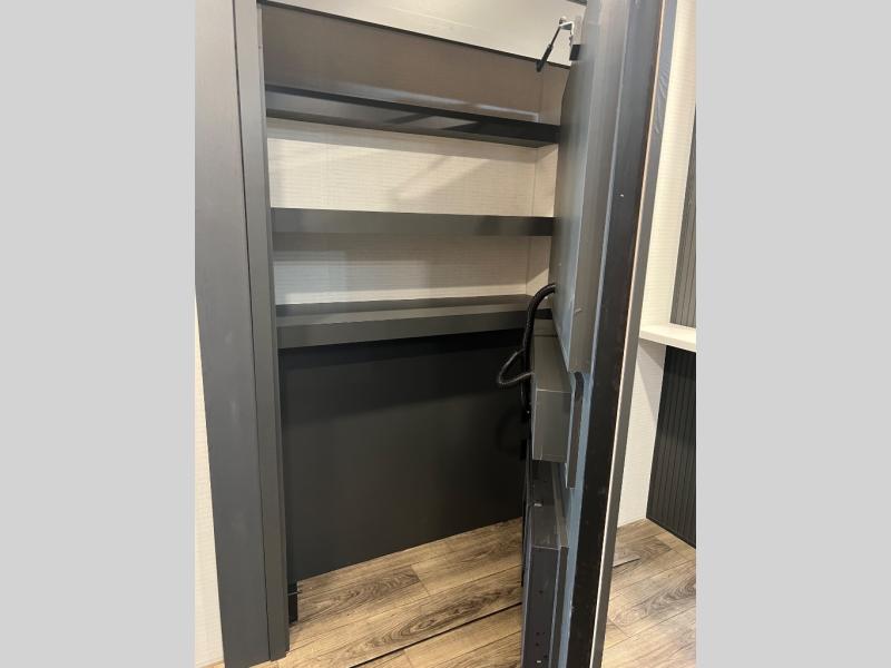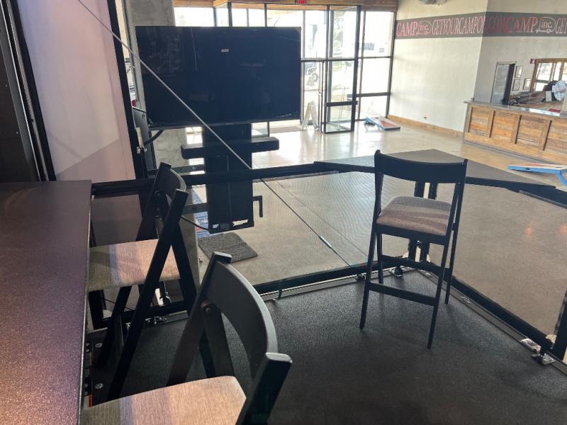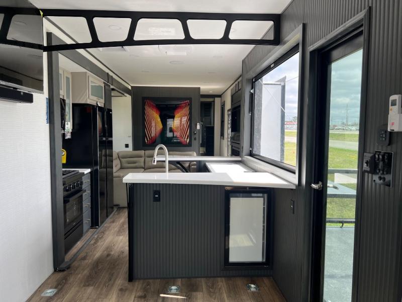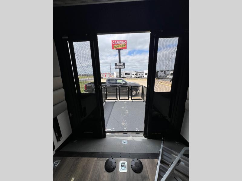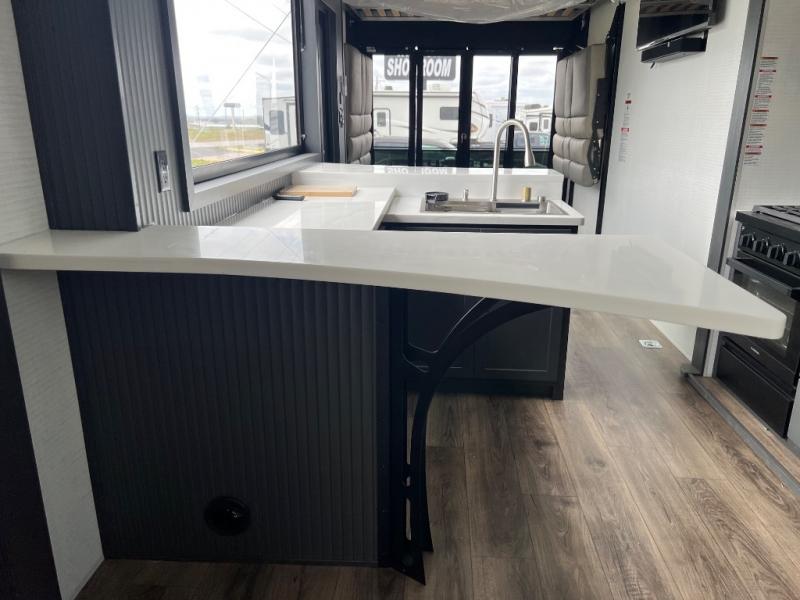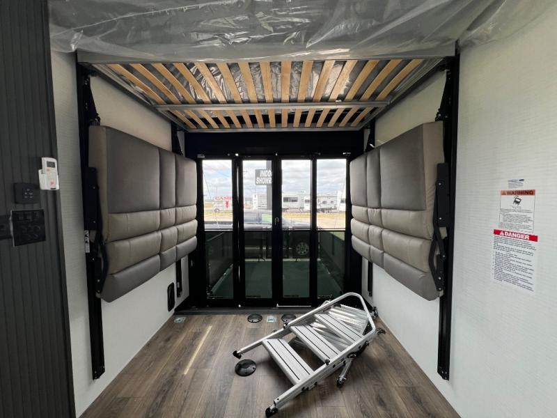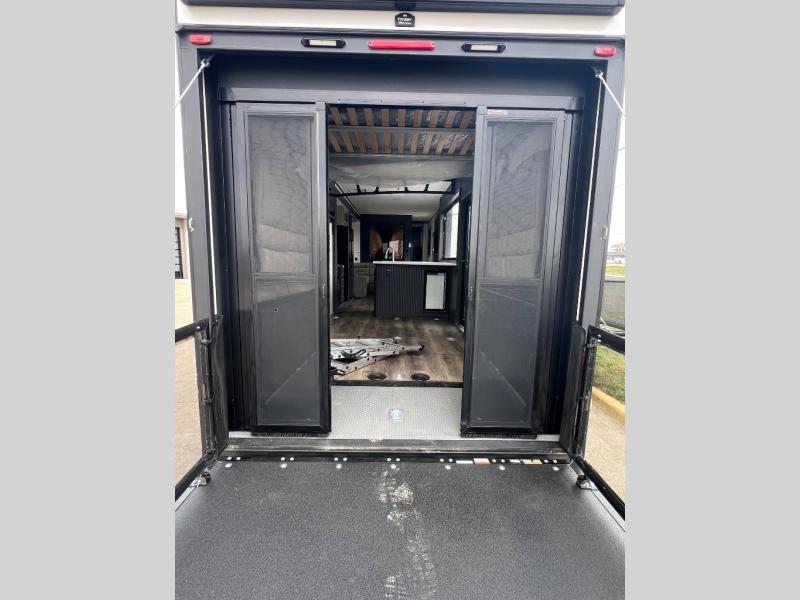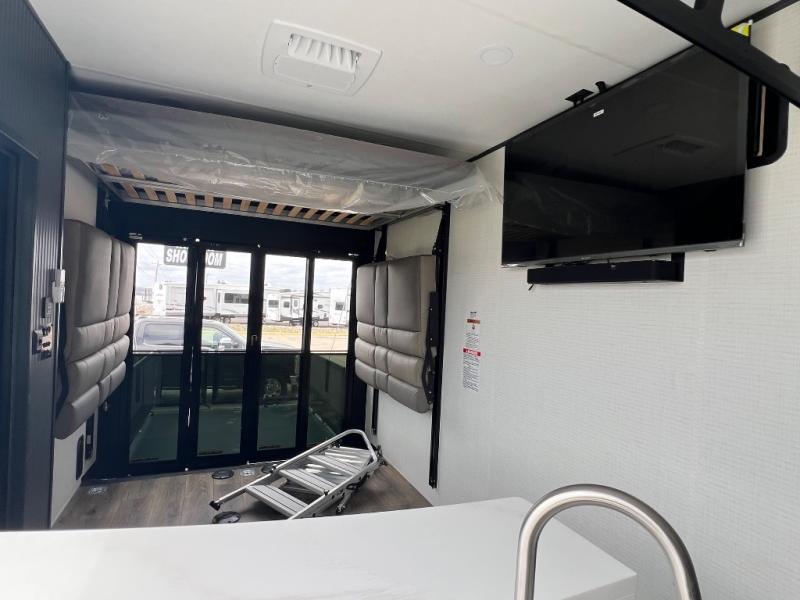 It's easy to see why this model was voted 2025 Top Innovation by RV Business! Once you arrive at your destination, you can unload your toys from the 13' garage, then relax on the dual gaucho sofas with a removable dinette table in between. There is also a queen-size Euro bed above the sofa where guests can sleep. Everyone will love to visit on the side patio that features a flip-down bar top and a window that looks into the kitchen. There are also bar stools here and inside at the counter so everyone has a seat. If the weather isn't cooperating, you can relax on the L-shaped sofa in the main living area, and there is a 55" TV with a hidden pantry behind for snacks! A spacious full bath will let everyone freshen up after trail riding, and you'll love having your own bedroom up front. Here, you'll find a king bed slide out, a wardrobe, dresser, plus washer and dryer prep if you choose to add those appliances!