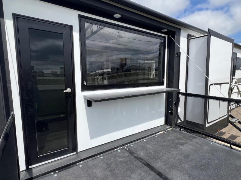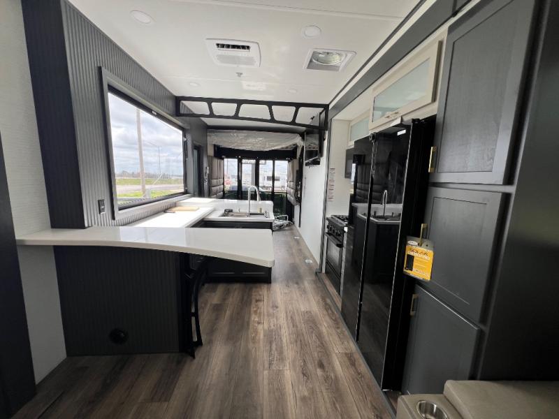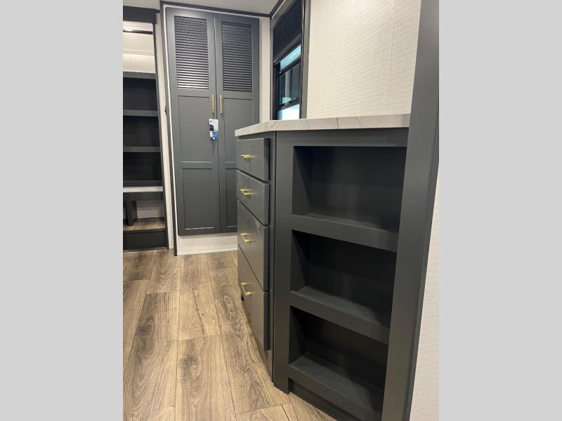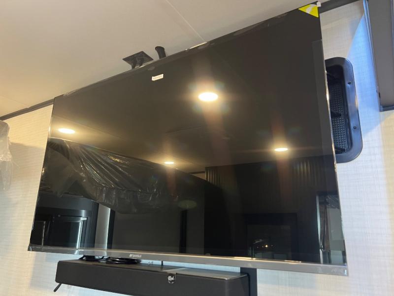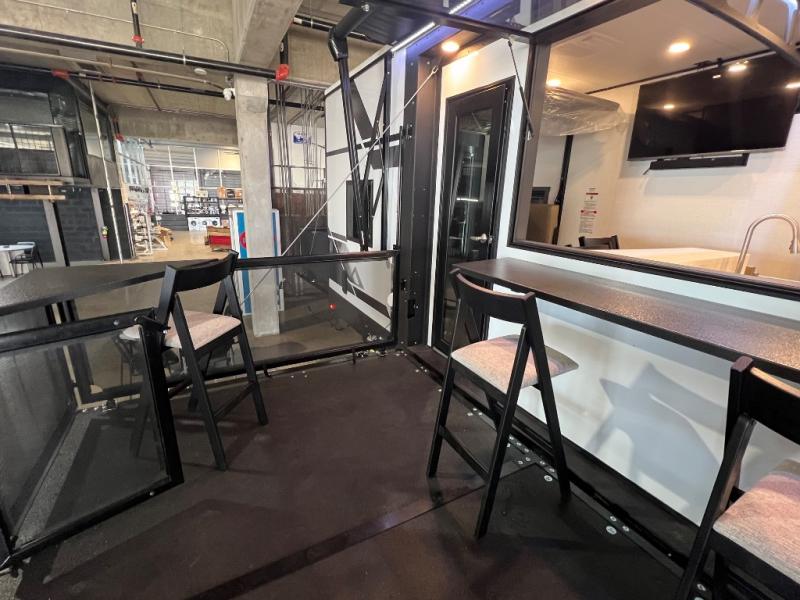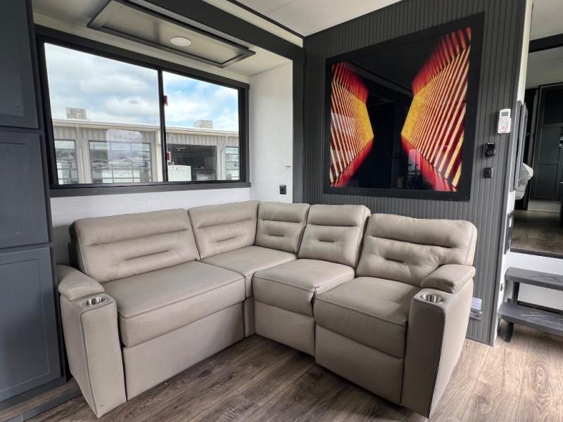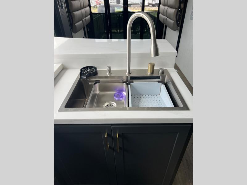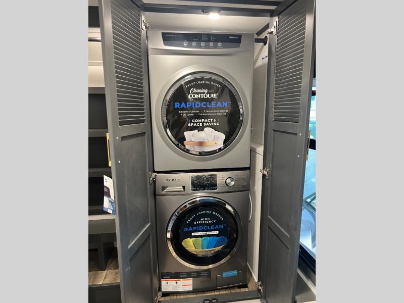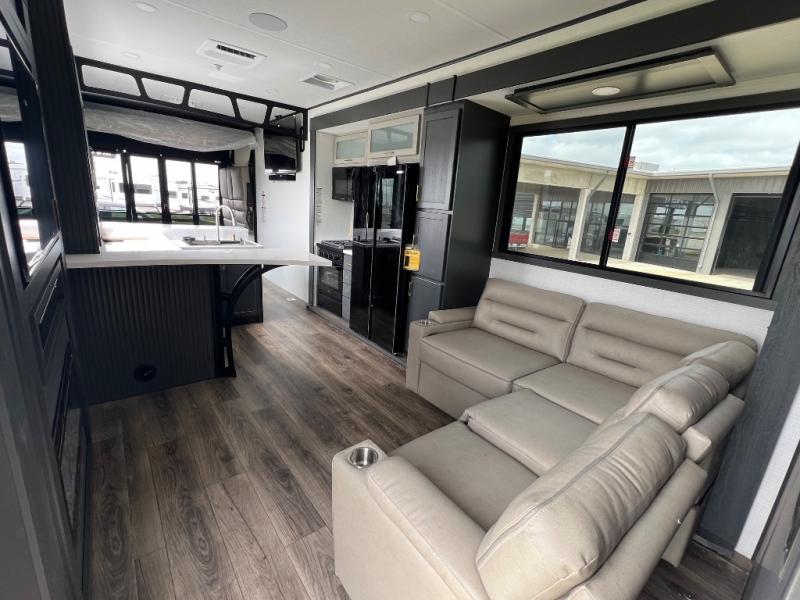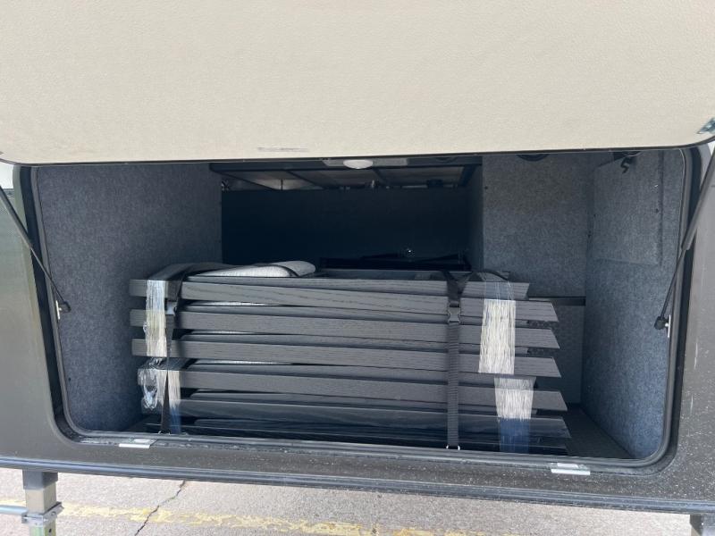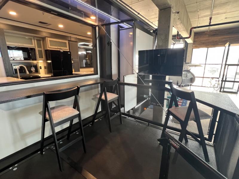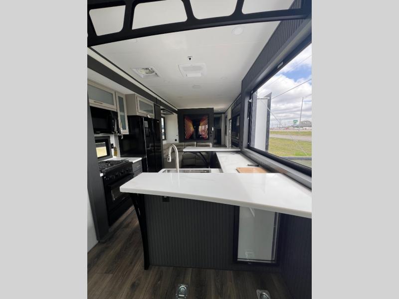 It's easy to see why this model was voted 2025 Top Innovation by RV Business! Once you arrive at your destination, you can unload your toys from the 13' garage, then relax on the dual gaucho sofas with a removable dinette table in between. There is also a queen-size Euro bed above the sofa where guests can sleep. Everyone will love to visit on the side patio that features a flip-down bar top and a window that looks into the kitchen. There are also bar stools here and inside at the counter so everyone has a seat. If the weather isn't cooperating, you can relax on the L-shaped sofa in the main living area, and there is a 55" TV with a hidden pantry behind for snacks! A spacious full bath will let everyone freshen up after trail riding, and you'll love having your own bedroom up front. Here, you'll find a king bed slide out, a wardrobe, dresser, plus washer and dryer prep if you choose to add those appliances!