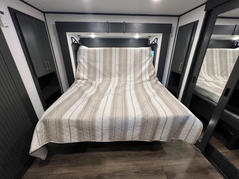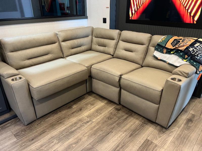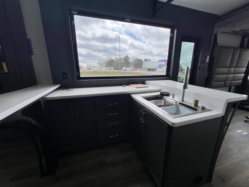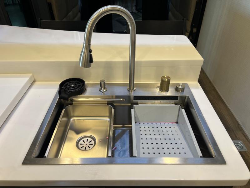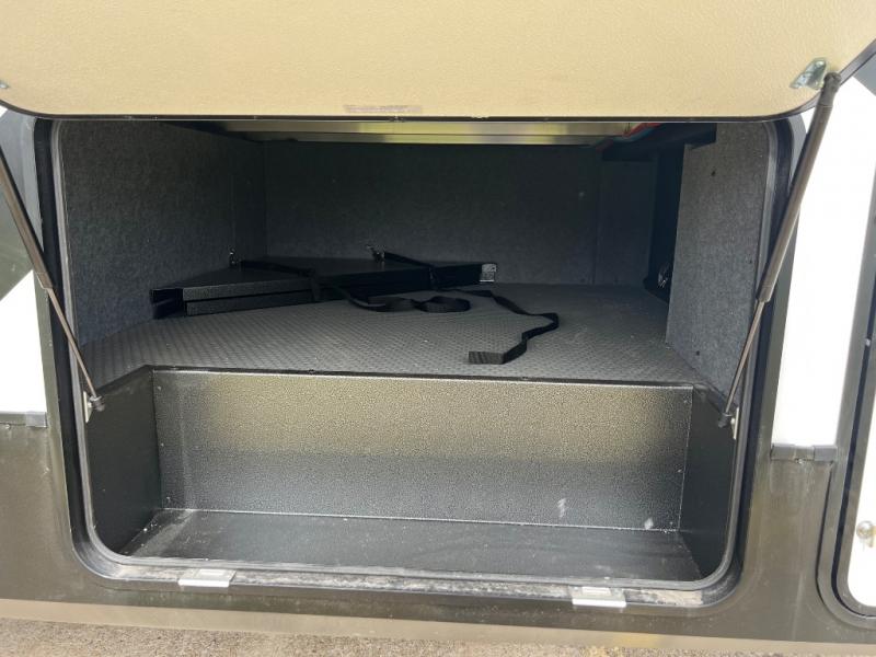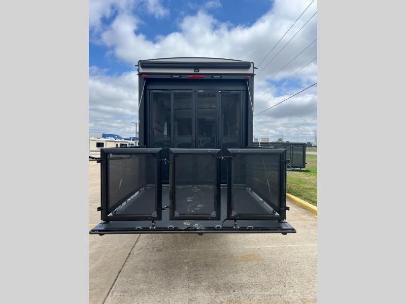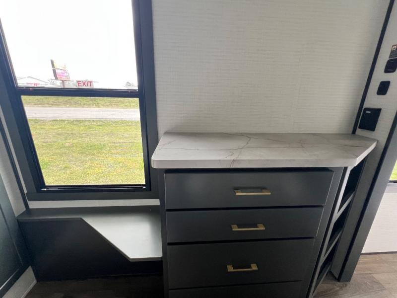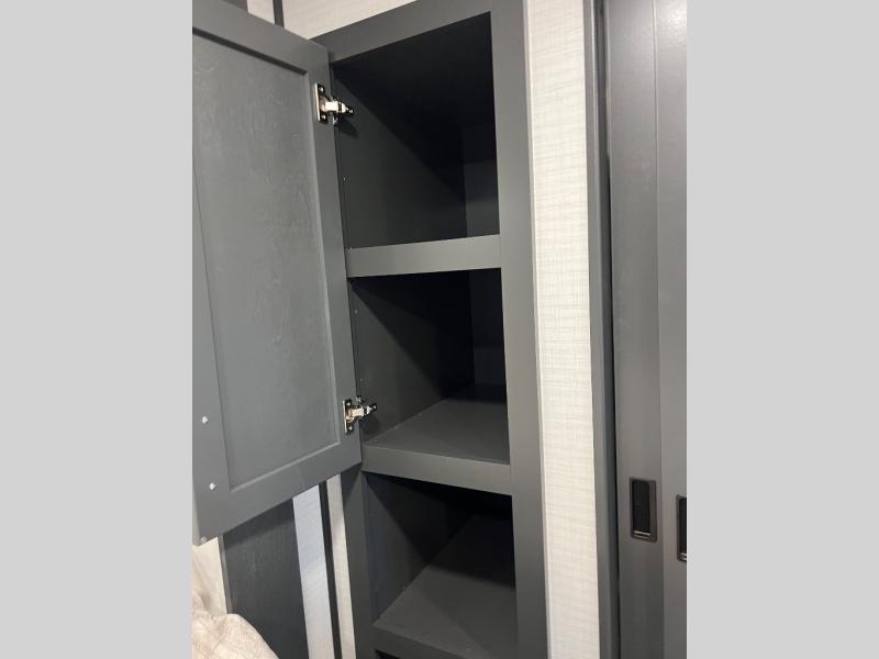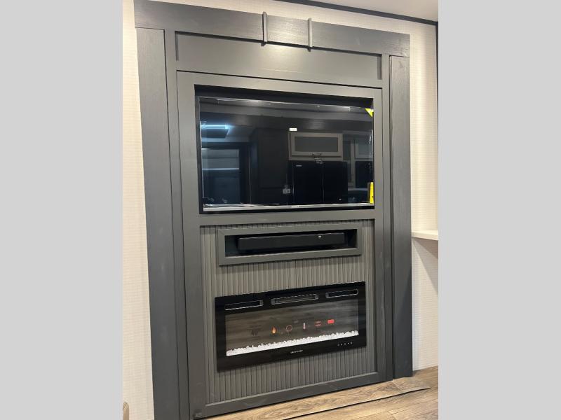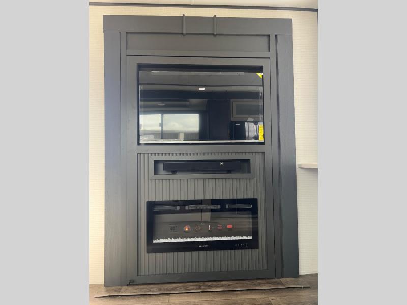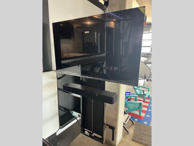 It's easy to see why this model was voted 2025 Top Innovation by RV Business! Once you arrive at your destination, you can unload your toys from the 13' garage, then relax on the dual gaucho sofas with a removable dinette table in between. There is also a queen-size Euro bed above the sofa where guests can sleep. Everyone will love to visit on the side patio that features a flip-down bar top and a window that looks into the kitchen. There are also bar stools here and inside at the counter so everyone has a seat. If the weather isn't cooperating, you can relax on the L-shaped sofa in the main living area, and there is a 55" TV with a hidden pantry behind for snacks! A spacious full bath will let everyone freshen up after trail riding, and you'll love having your own bedroom up front. Here, you'll find a king bed slide out, a wardrobe, dresser, plus washer and dryer prep if you choose to add those appliances!