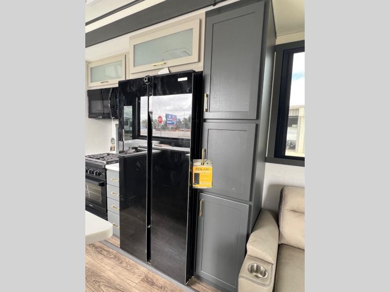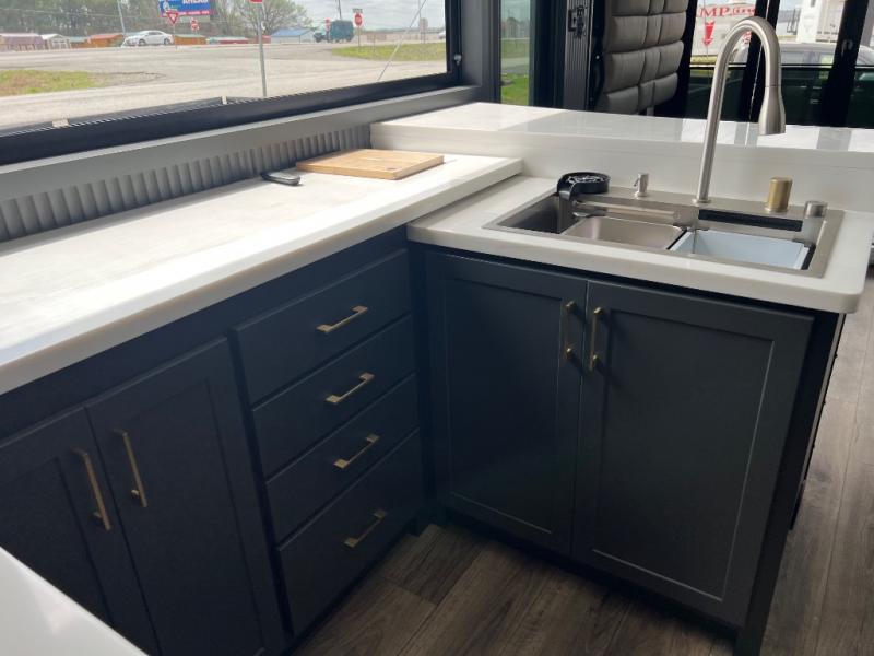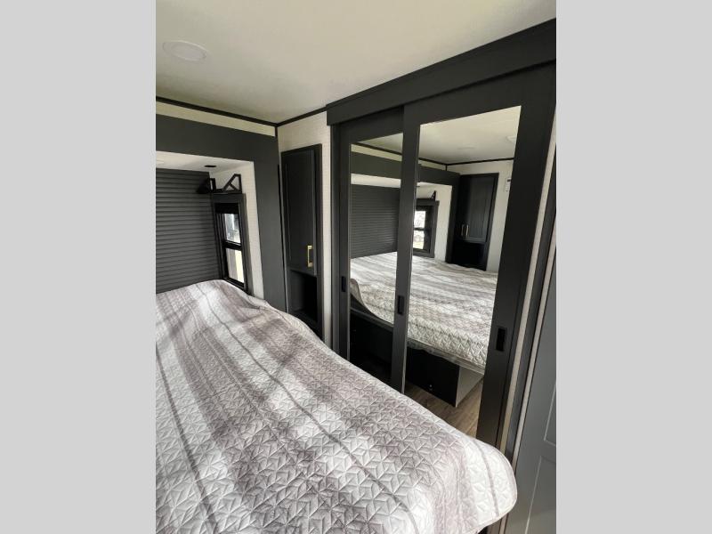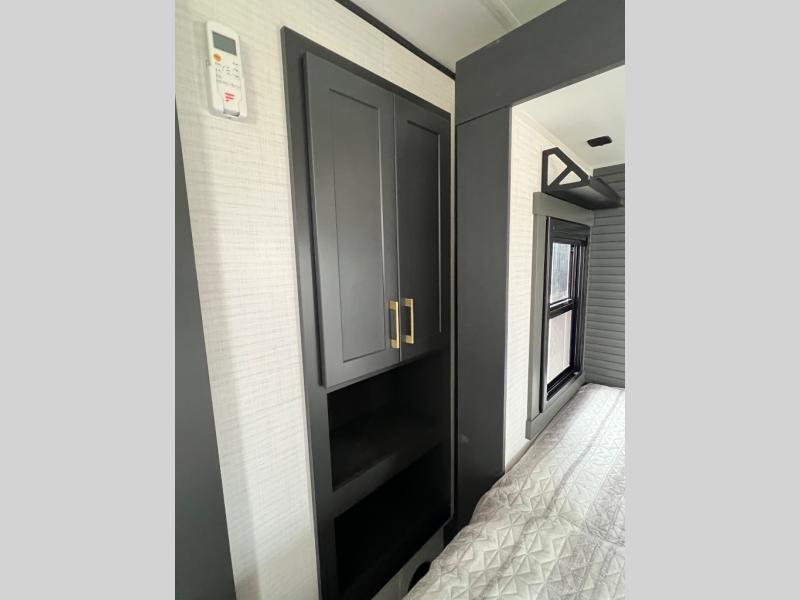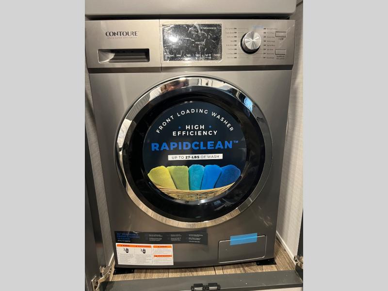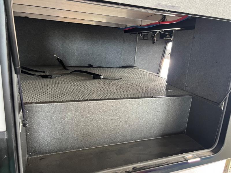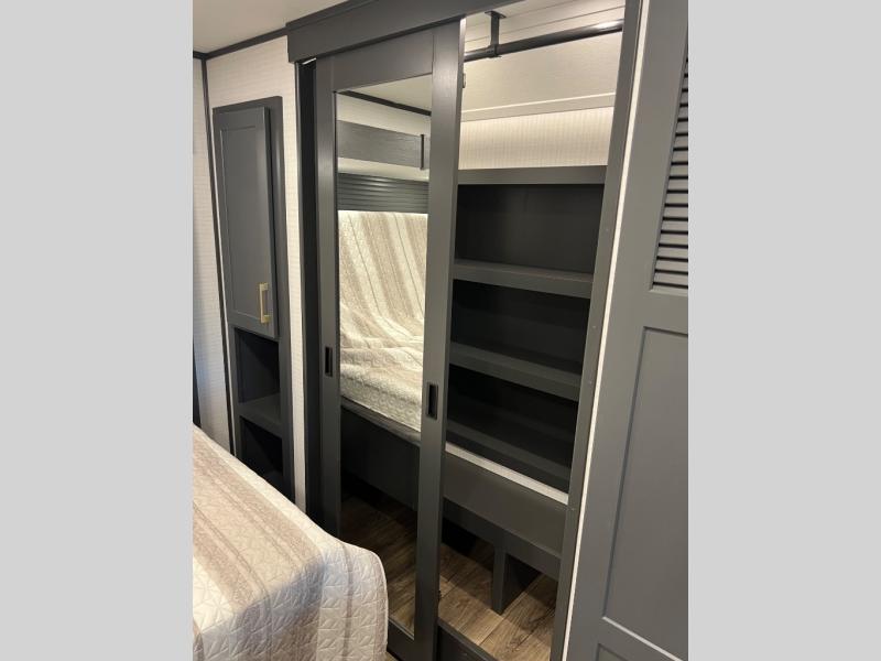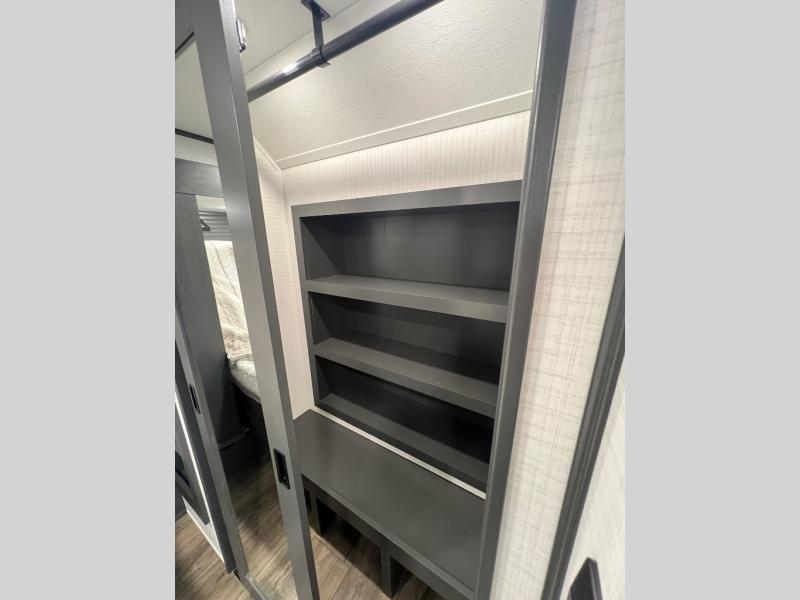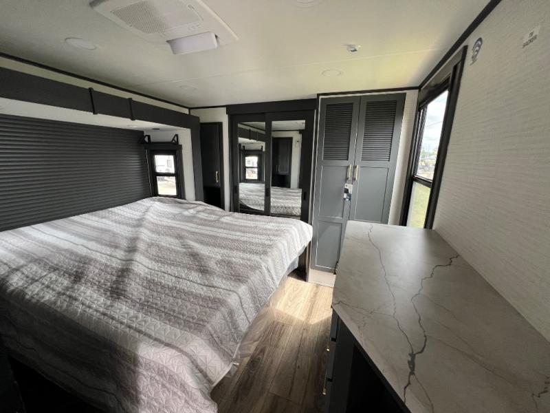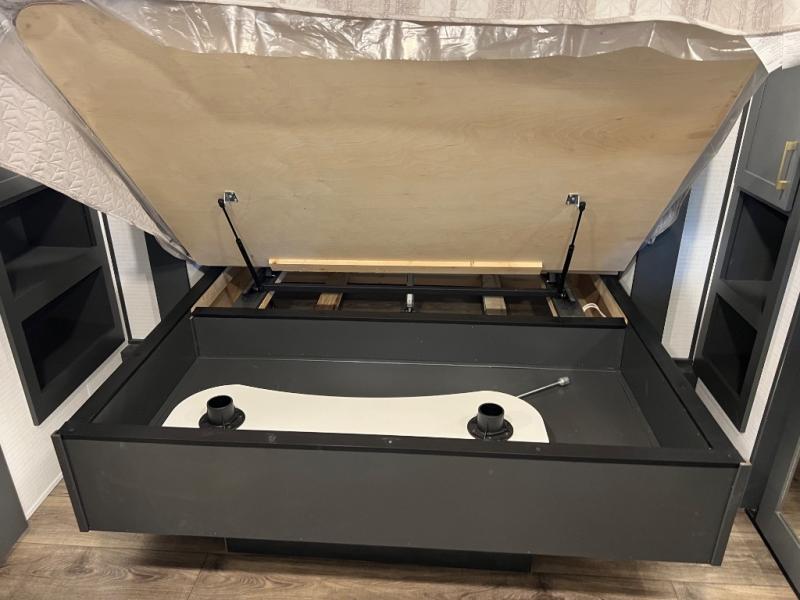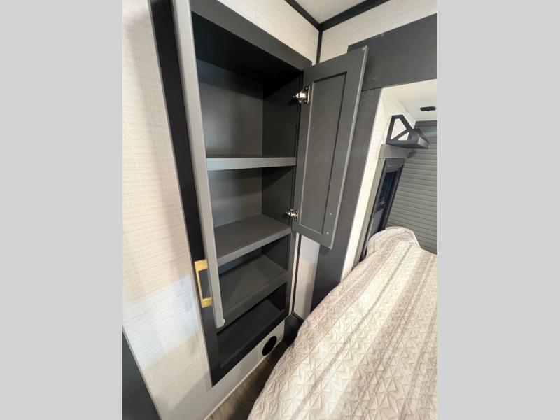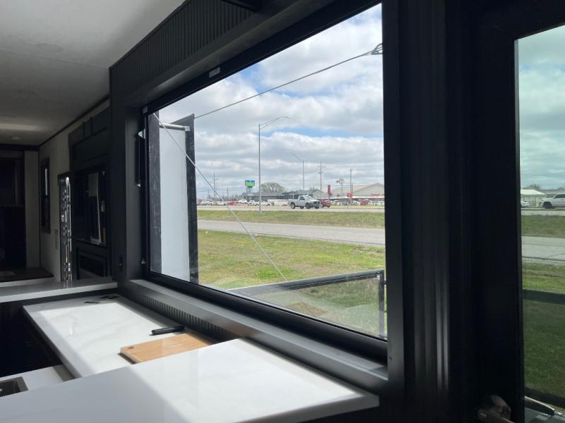 It's easy to see why this model was voted 2025 Top Innovation by RV Business! Once you arrive at your destination, you can unload your toys from the 13' garage, then relax on the dual gaucho sofas with a removable dinette table in between. There is also a queen-size Euro bed above the sofa where guests can sleep. Everyone will love to visit on the side patio that features a flip-down bar top and a window that looks into the kitchen. There are also bar stools here and inside at the counter so everyone has a seat. If the weather isn't cooperating, you can relax on the L-shaped sofa in the main living area, and there is a 55" TV with a hidden pantry behind for snacks! A spacious full bath will let everyone freshen up after trail riding, and you'll love having your own bedroom up front. Here, you'll find a king bed slide out, a wardrobe, dresser, plus washer and dryer prep if you choose to add those appliances!