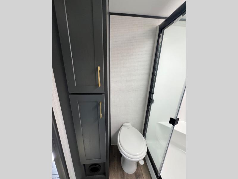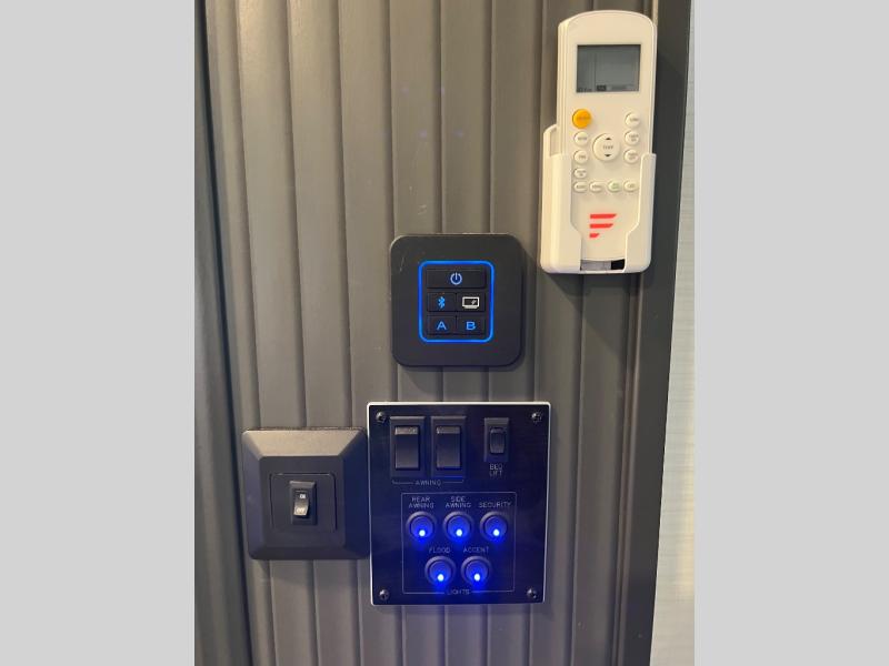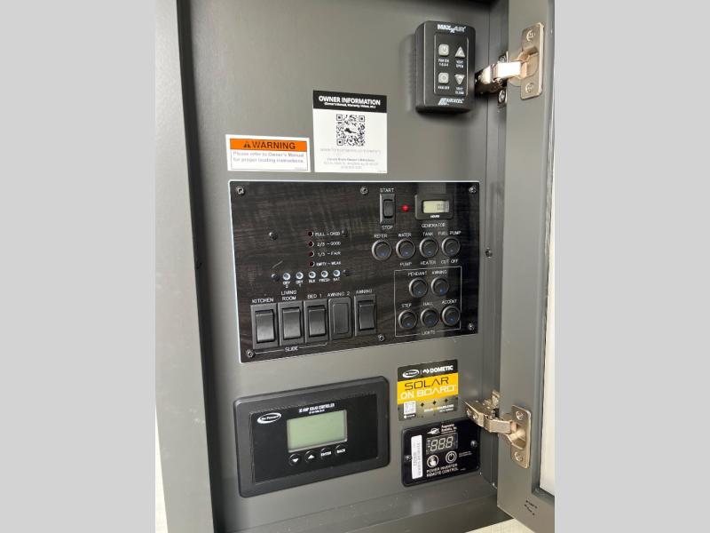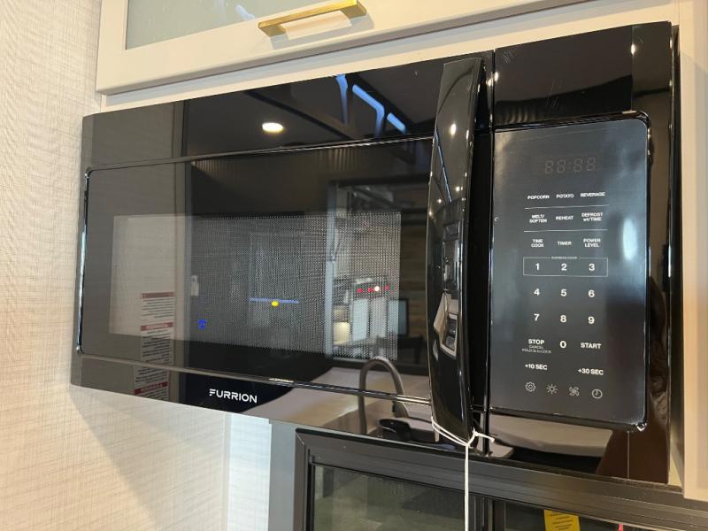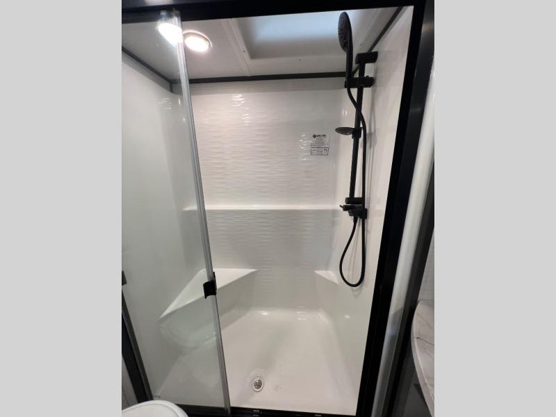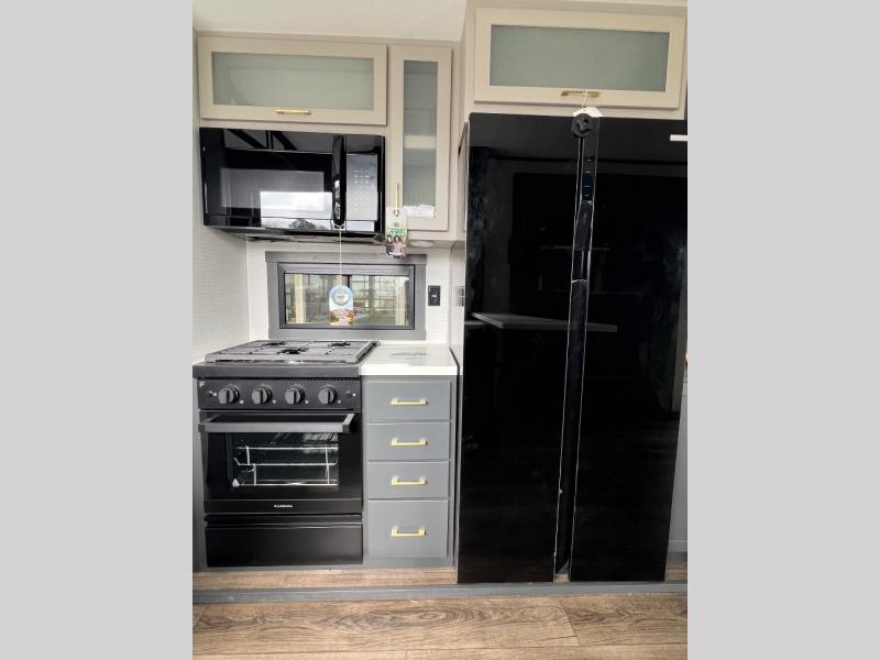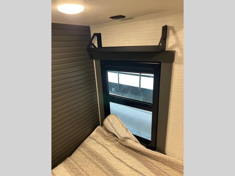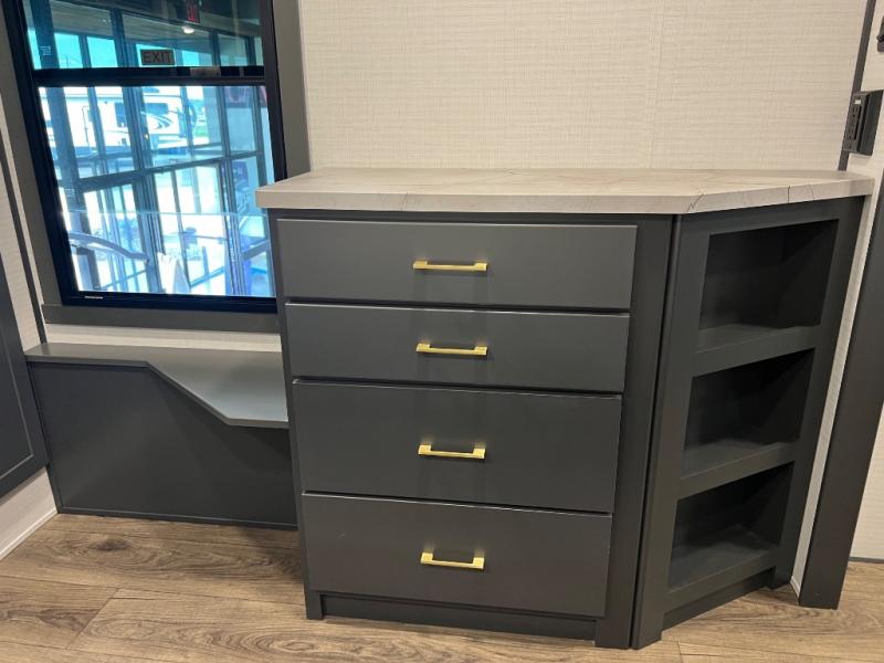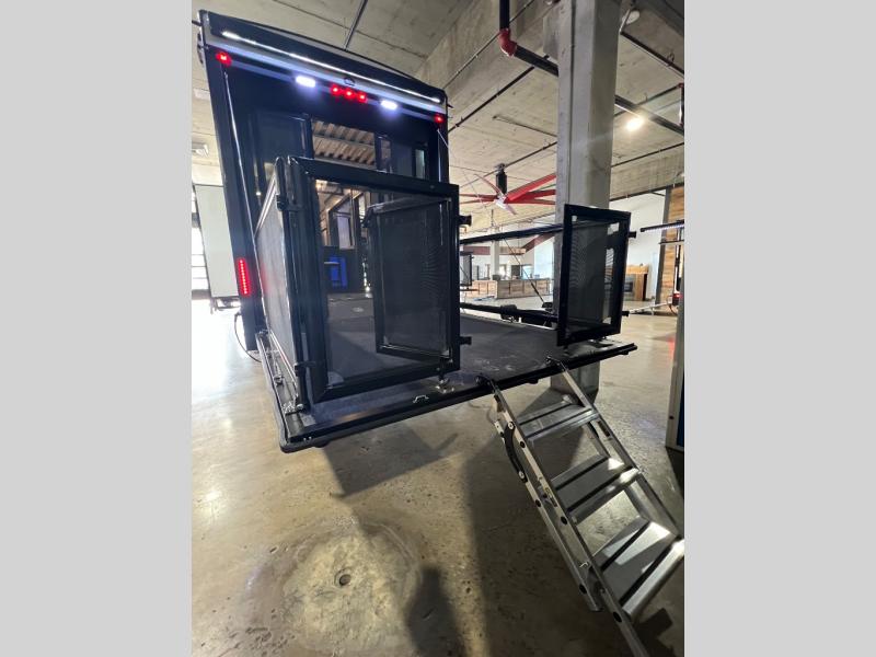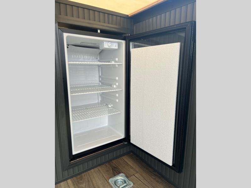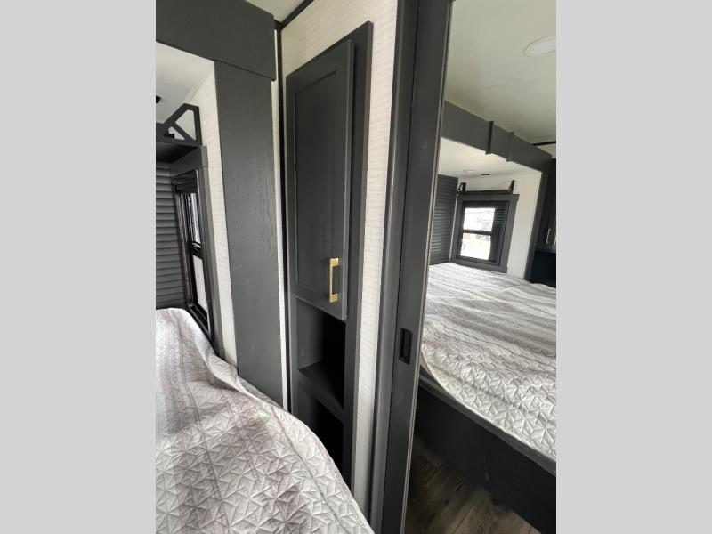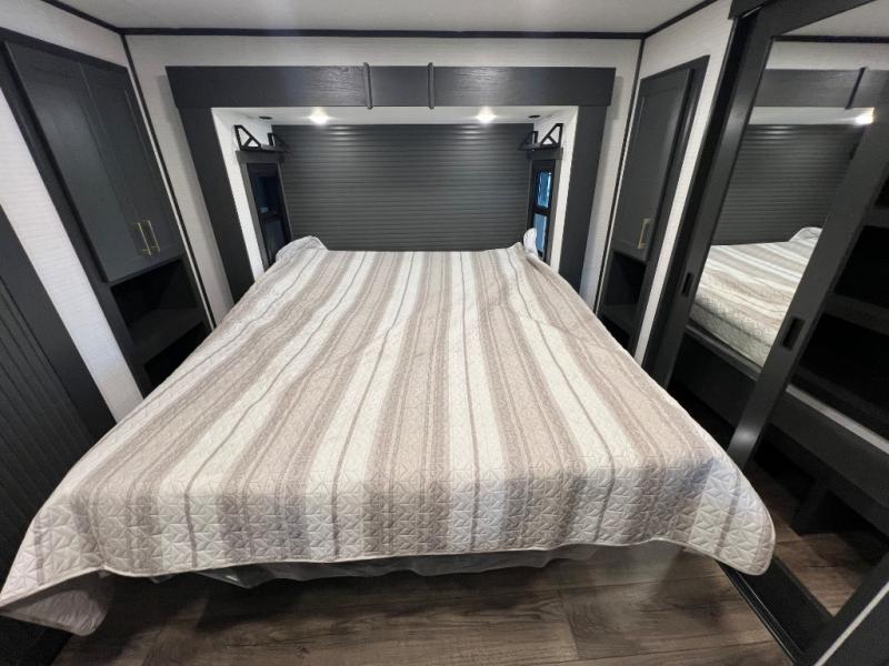 It's easy to see why this model was voted 2025 Top Innovation by RV Business! Once you arrive at your destination, you can unload your toys from the 13' garage, then relax on the dual gaucho sofas with a removable dinette table in between. There is also a queen-size Euro bed above the sofa where guests can sleep. Everyone will love to visit on the side patio that features a flip-down bar top and a window that looks into the kitchen. There are also bar stools here and inside at the counter so everyone has a seat. If the weather isn't cooperating, you can relax on the L-shaped sofa in the main living area, and there is a 55" TV with a hidden pantry behind for snacks! A spacious full bath will let everyone freshen up after trail riding, and you'll love having your own bedroom up front. Here, you'll find a king bed slide out, a wardrobe, dresser, plus washer and dryer prep if you choose to add those appliances!
