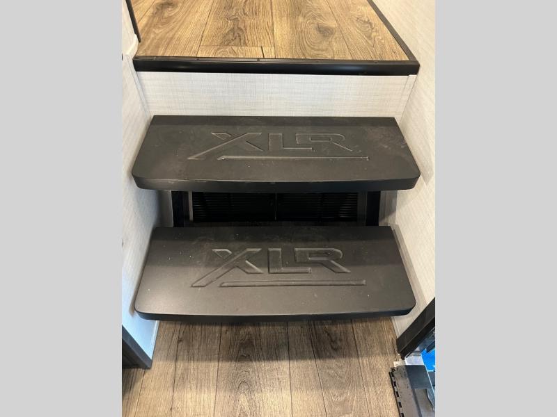 The outdoor enthusiasts has met their match with the XLR Nitro toy haulers by Forest River. The vacuum-bonded aluminum framed sidewalls, gel-coat fiberglass exterior, and singular roof membrane are just a few durable construction materials you will find on these models. There is a weatherproof insulated ramp door, 5,000 lb. cargo tie-downs, a 40 gallon fuel station, and more convenient garage features that will make camping with toys easier than ever. You'll appreciate smooth towing thanks to the MORryde CRE3000 suspension enhancement and 16" Goodyear Endurance tires. A 200 watt roof-mounted solar panel also comes standard, along with electric awning(s) with LED lights, undercarriage lighting, and friction hinge entry door(s). Some of the innovative technology features include a Winegard Air 360 antenna with WiFi prep and 4G LTE, convenient USB charging stations, and a Gear Guardian wireless camera for inside the garage to help keep your gear secure. You will also find diamonds solid surface kitchen countertops, Luna Quartz bathroom countertops, hardwood cabinet doors, stylish window trim package, and many more interior comforts.