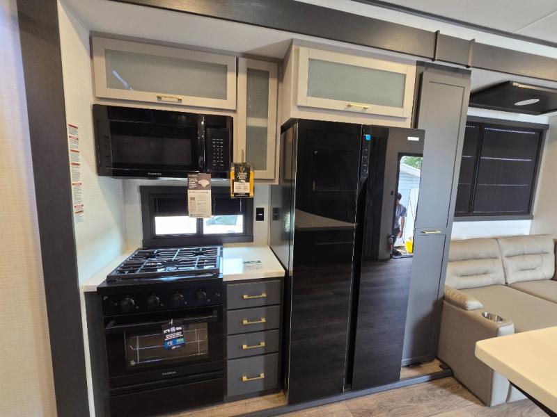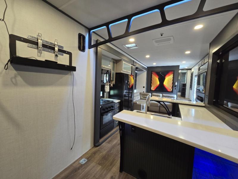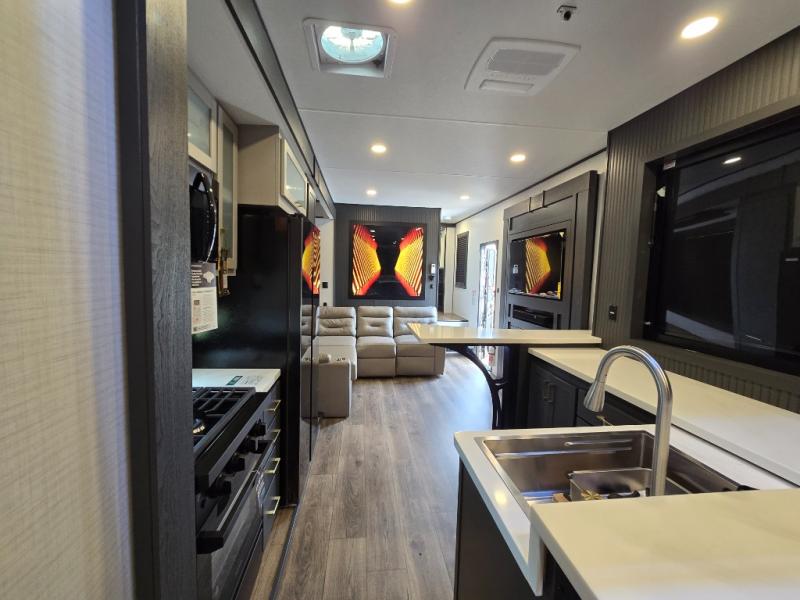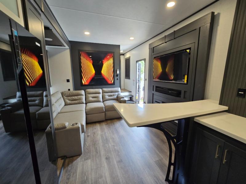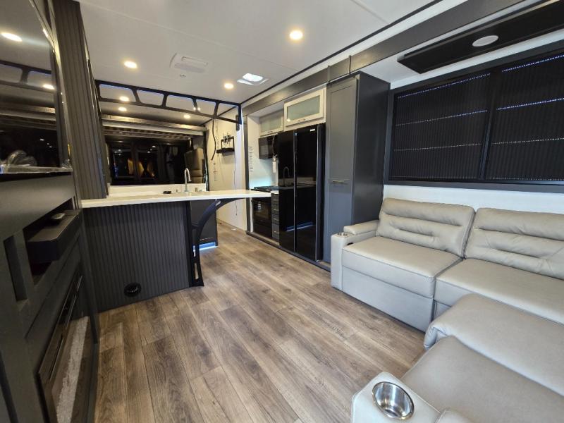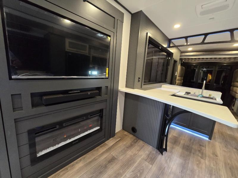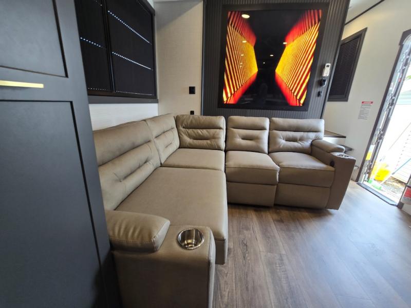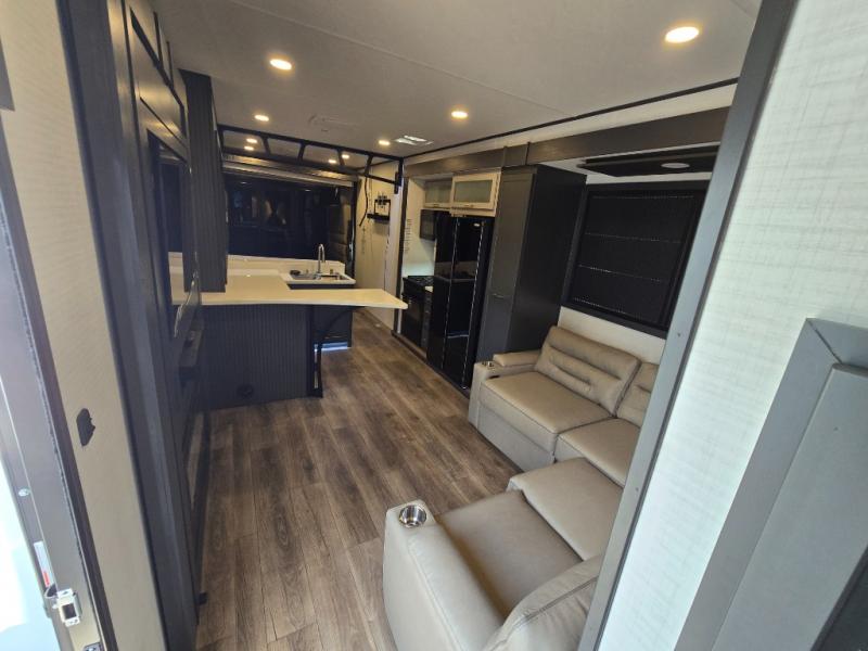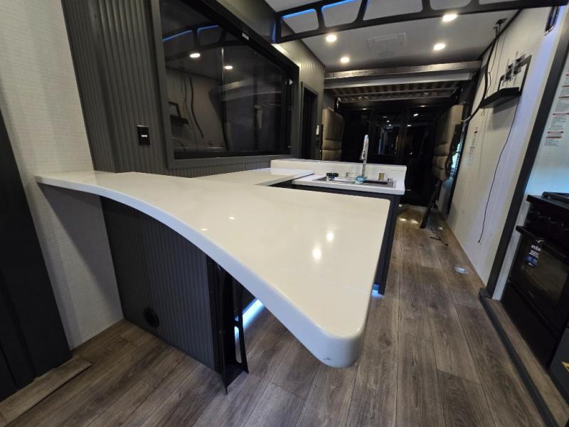 It's easy to see why this model was voted 2025 Top Innovation by RV Business! Once you arrive at your destination, you can unload your toys from the 13' garage, then relax on the dual gaucho sofas with a removable dinette table in between. There is also a queen-size Euro bed above the sofa where guests can sleep. Everyone will love to visit on the side patio that features a flip-down bar top and a window that looks into the kitchen. There are also bar stools here and inside at the counter so everyone has a seat. If the weather isn't cooperating, you can relax on the L-shaped sofa in the main living area, and there is a 55" TV with a hidden pantry behind for snacks! A spacious full bath will let everyone freshen up after trail riding, and you'll love having your own bedroom up front. Here, you'll find a king bed slide out, a wardrobe, dresser, plus washer and dryer prep if you choose to add those appliances!