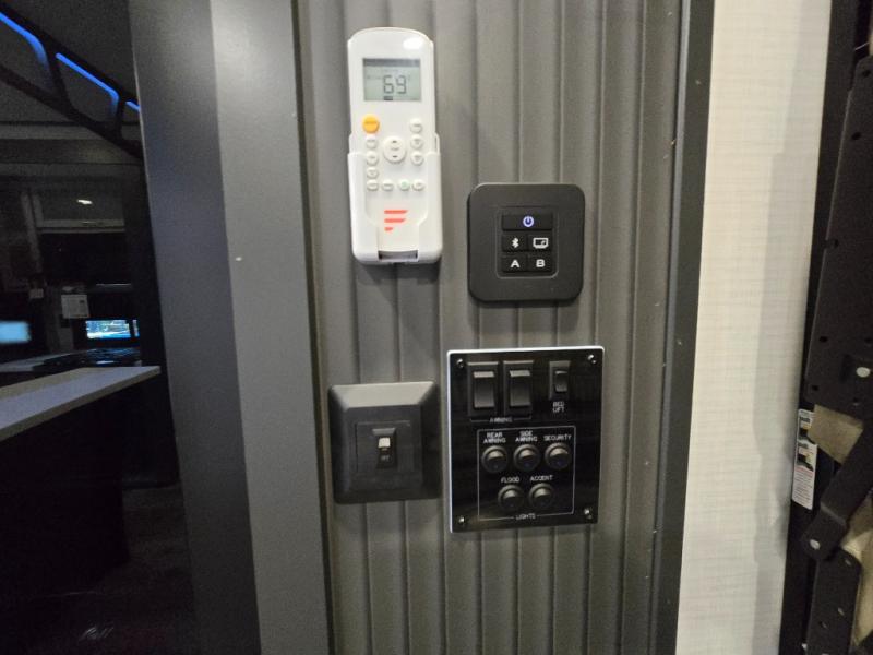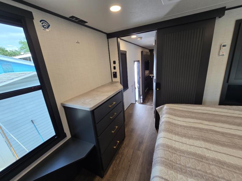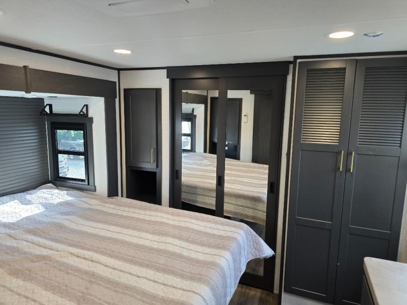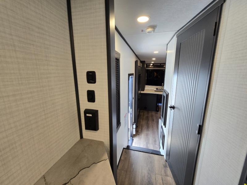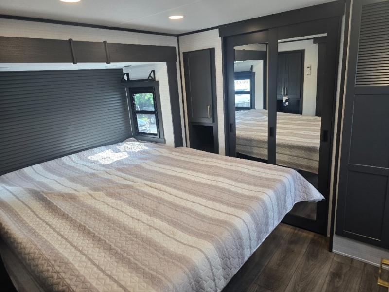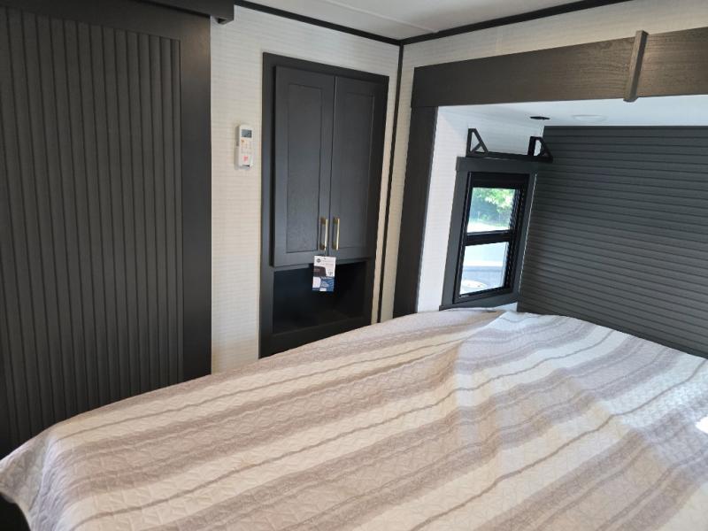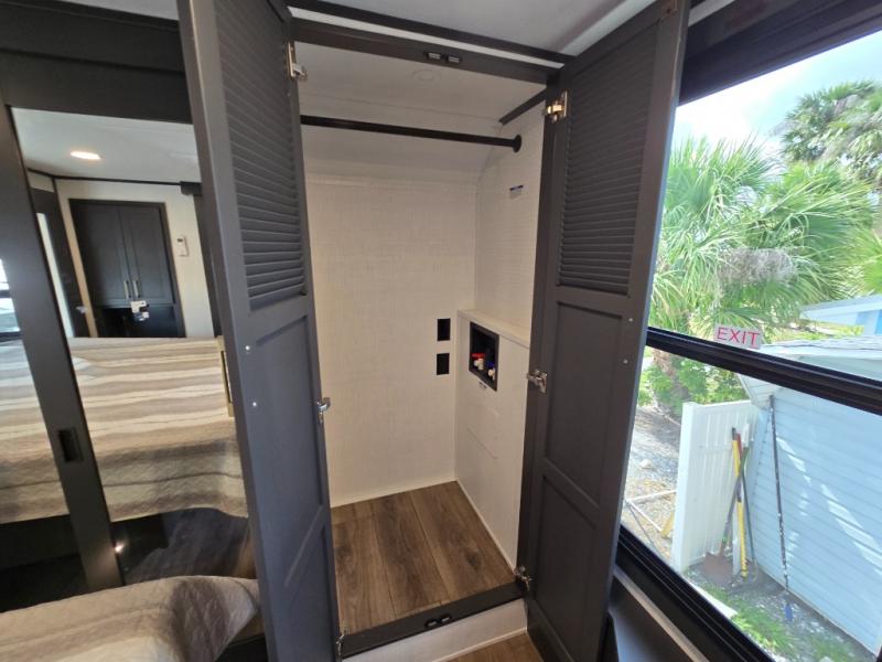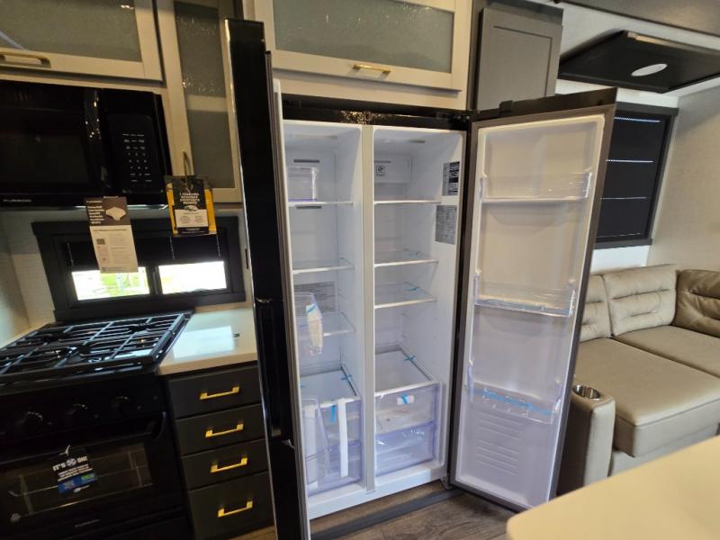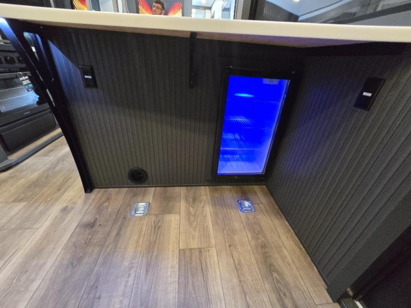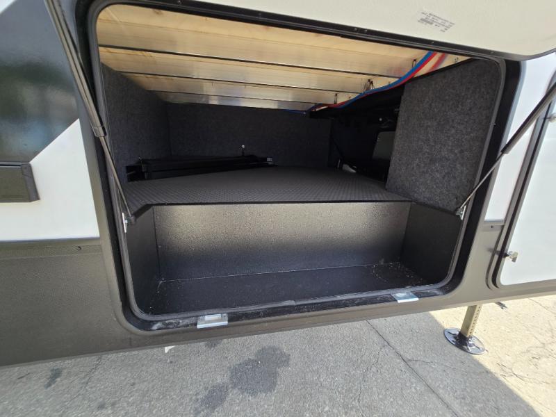 It's easy to see why this model was voted 2025 Top Innovation by RV Business! Once you arrive at your destination, you can unload your toys from the 13' garage, then relax on the dual gaucho sofas with a removable dinette table in between. There is also a queen-size Euro bed above the sofa where guests can sleep. Everyone will love to visit on the side patio that features a flip-down bar top and a window that looks into the kitchen. There are also bar stools here and inside at the counter so everyone has a seat. If the weather isn't cooperating, you can relax on the L-shaped sofa in the main living area, and there is a 55" TV with a hidden pantry behind for snacks! A spacious full bath will let everyone freshen up after trail riding, and you'll love having your own bedroom up front. Here, you'll find a king bed slide out, a wardrobe, dresser, plus washer and dryer prep if you choose to add those appliances!