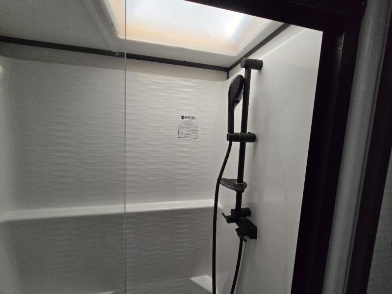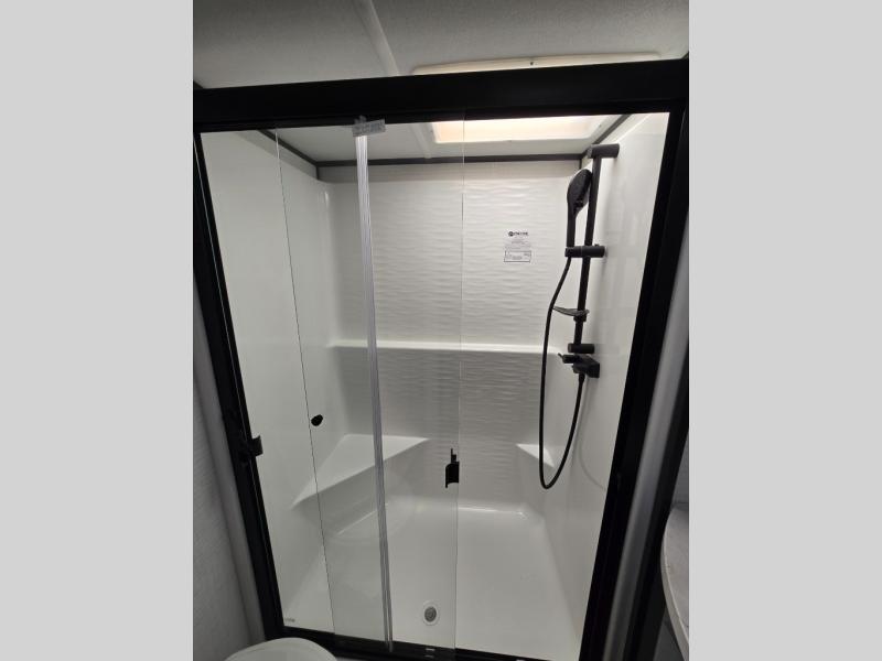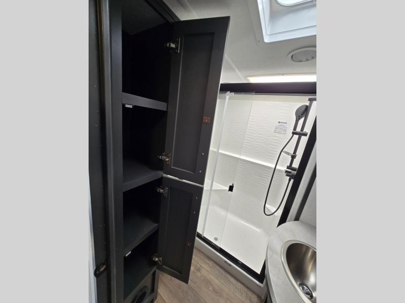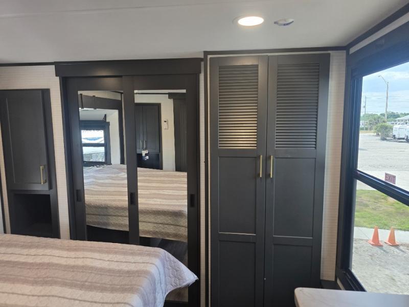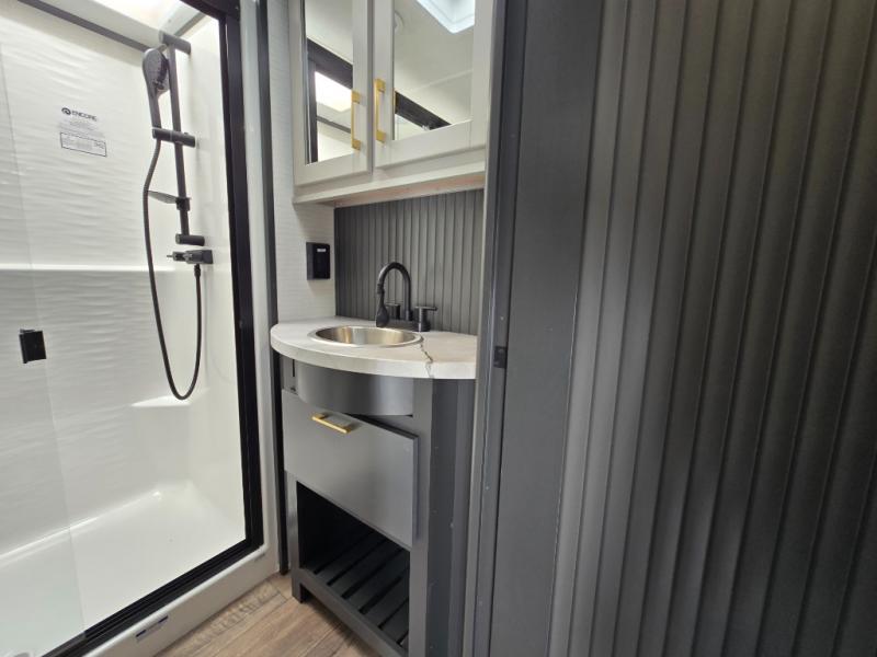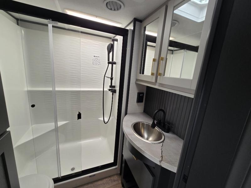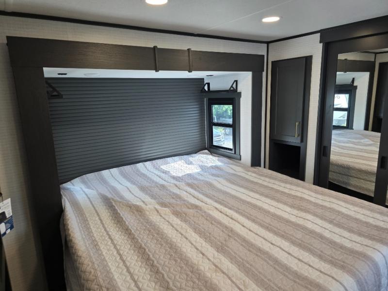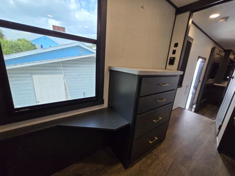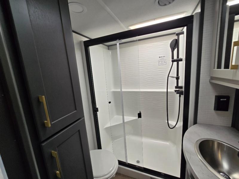 It's easy to see why this model was voted 2025 Top Innovation by RV Business! Once you arrive at your destination, you can unload your toys from the 13' garage, then relax on the dual gaucho sofas with a removable dinette table in between. There is also a queen-size Euro bed above the sofa where guests can sleep. Everyone will love to visit on the side patio that features a flip-down bar top and a window that looks into the kitchen. There are also bar stools here and inside at the counter so everyone has a seat. If the weather isn't cooperating, you can relax on the L-shaped sofa in the main living area, and there is a 55" TV with a hidden pantry behind for snacks! A spacious full bath will let everyone freshen up after trail riding, and you'll love having your own bedroom up front. Here, you'll find a king bed slide out, a wardrobe, dresser, plus washer and dryer prep if you choose to add those appliances!