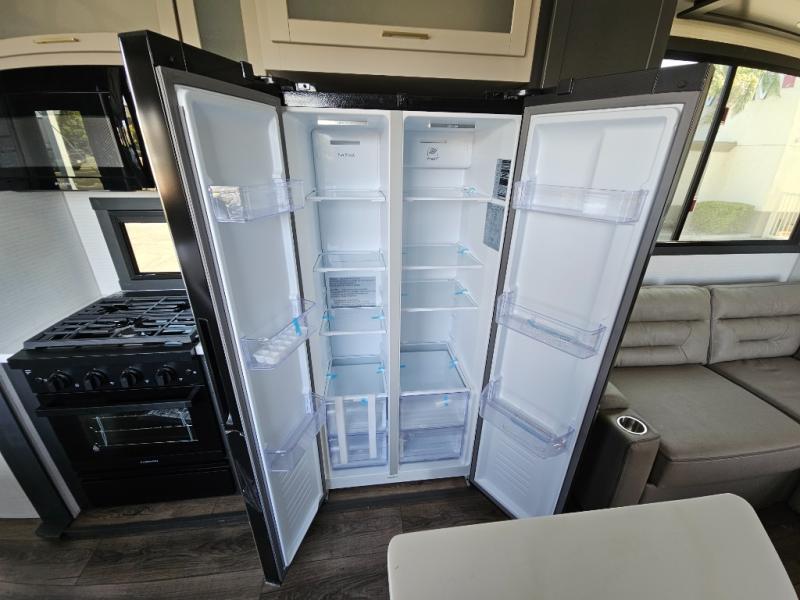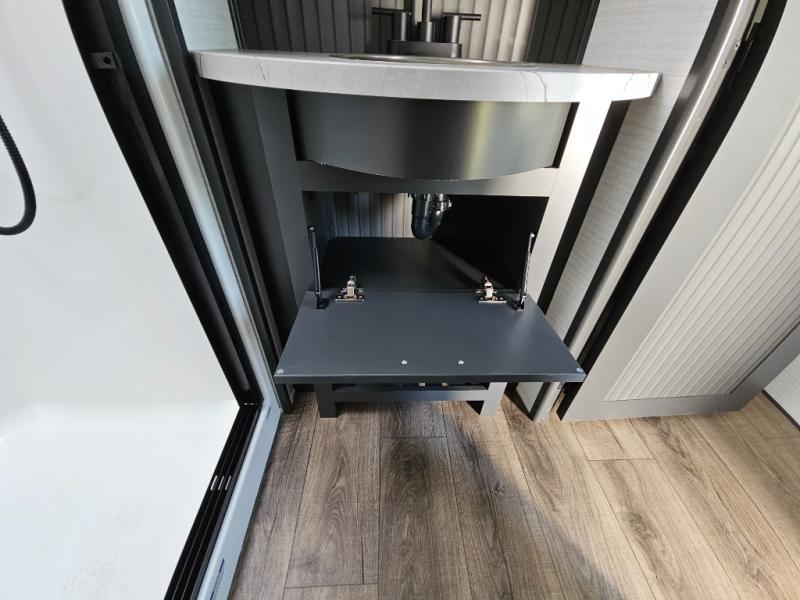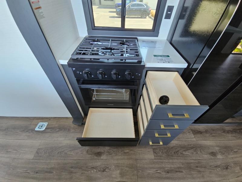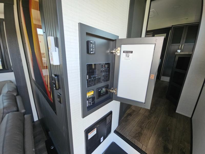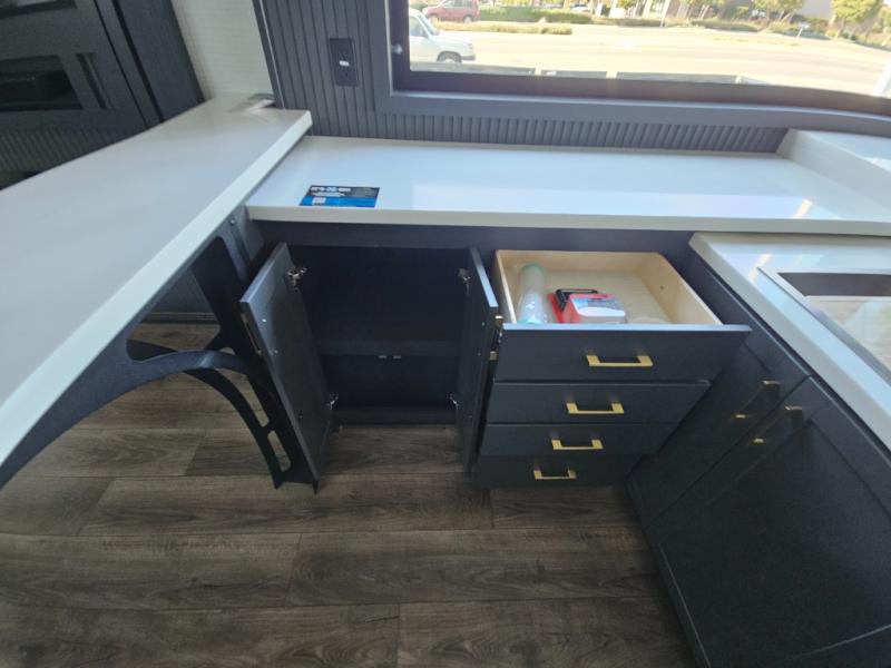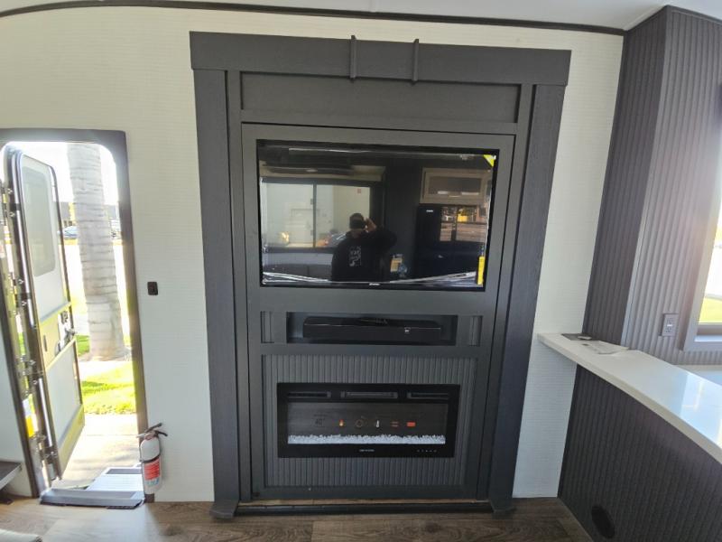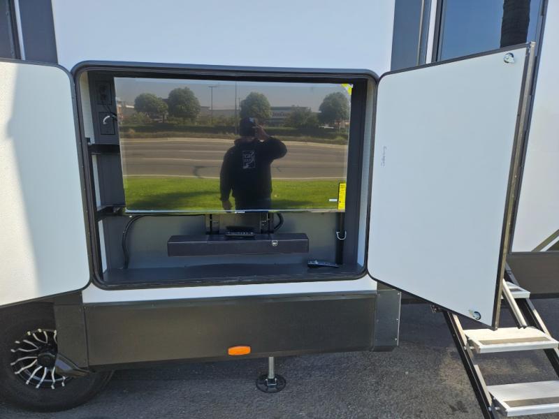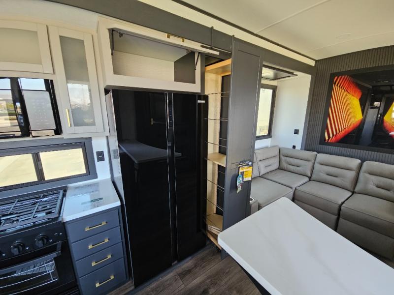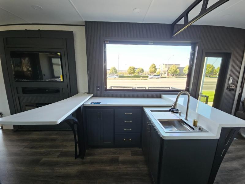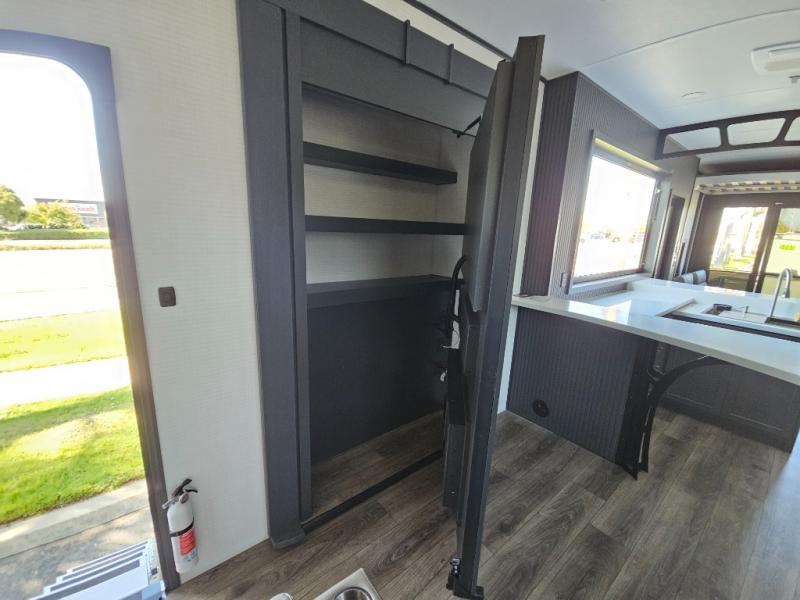 It's easy to see why this model was voted 2025 Top Innovation by RV Business! Once you arrive at your destination, you can unload your toys from the 13' garage, then relax on the dual gaucho sofas with a removable dinette table in between. There is also a queen-size Euro bed above the sofa where guests can sleep. Everyone will love to visit on the side patio that features a flip-down bar top and a window that looks into the kitchen. There are also bar stools here and inside at the counter so everyone has a seat. If the weather isn't cooperating, you can relax on the L-shaped sofa in the main living area, and there is a 55" TV with a hidden pantry behind for snacks! A spacious full bath will let everyone freshen up after trail riding, and you'll love having your own bedroom up front. Here, you'll find a king bed slide out, a wardrobe, dresser, plus washer and dryer prep if you choose to add those appliances!