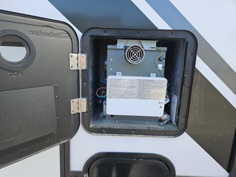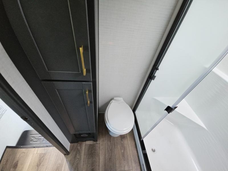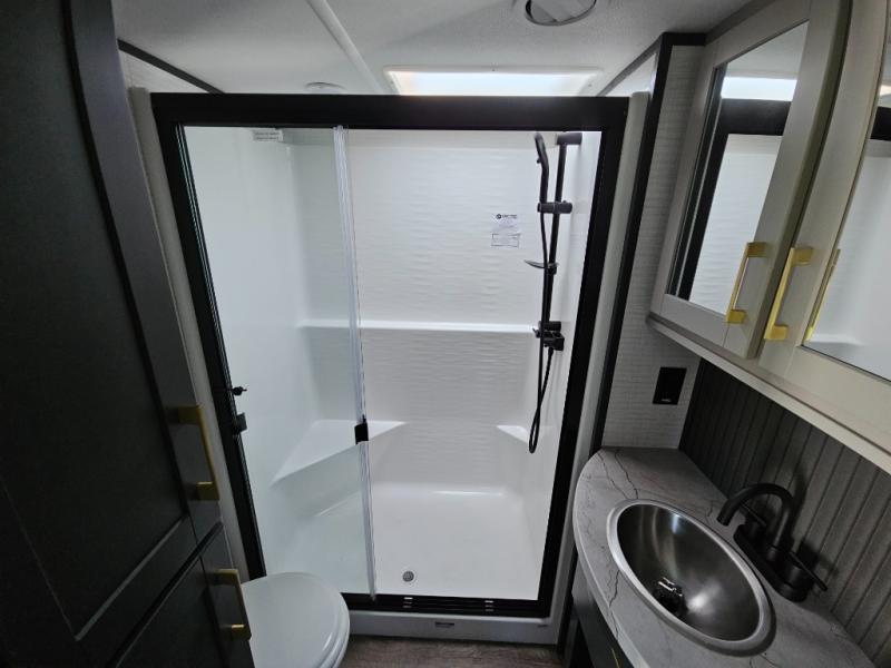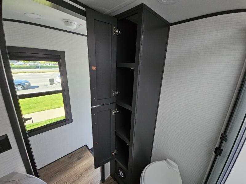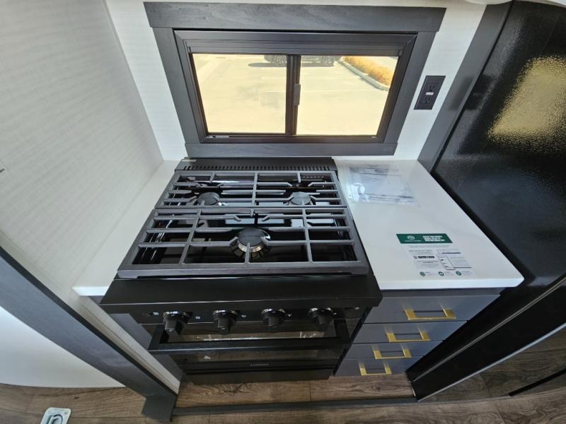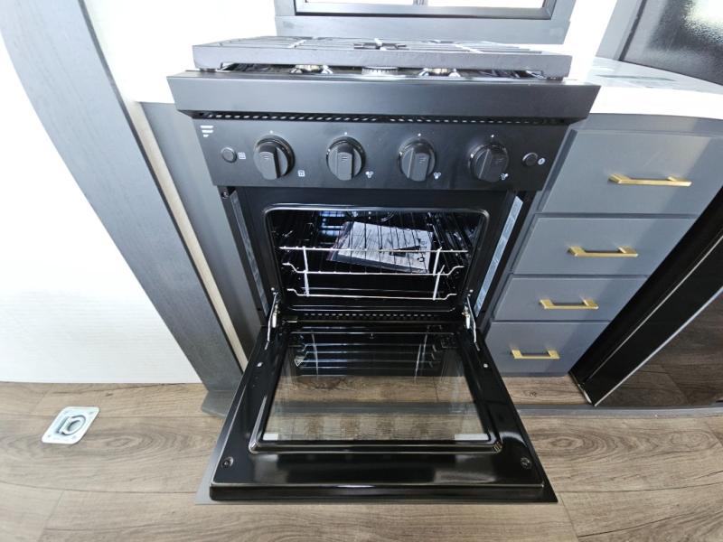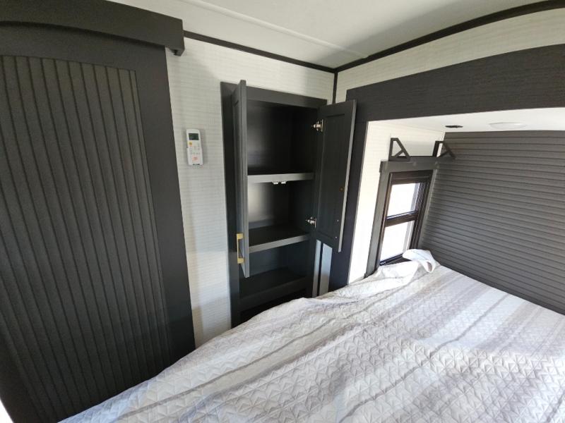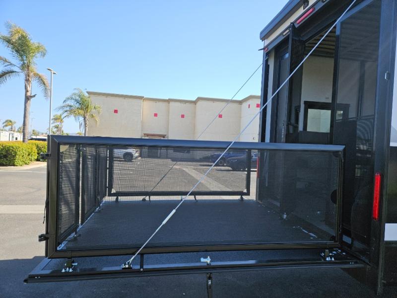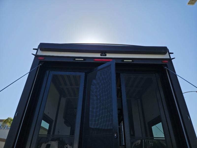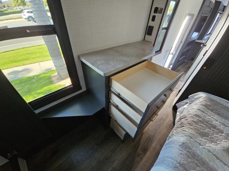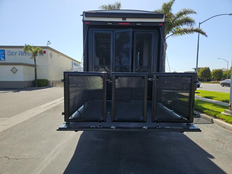 It's easy to see why this model was voted 2025 Top Innovation by RV Business! Once you arrive at your destination, you can unload your toys from the 13' garage, then relax on the dual gaucho sofas with a removable dinette table in between. There is also a queen-size Euro bed above the sofa where guests can sleep. Everyone will love to visit on the side patio that features a flip-down bar top and a window that looks into the kitchen. There are also bar stools here and inside at the counter so everyone has a seat. If the weather isn't cooperating, you can relax on the L-shaped sofa in the main living area, and there is a 55" TV with a hidden pantry behind for snacks! A spacious full bath will let everyone freshen up after trail riding, and you'll love having your own bedroom up front. Here, you'll find a king bed slide out, a wardrobe, dresser, plus washer and dryer prep if you choose to add those appliances!