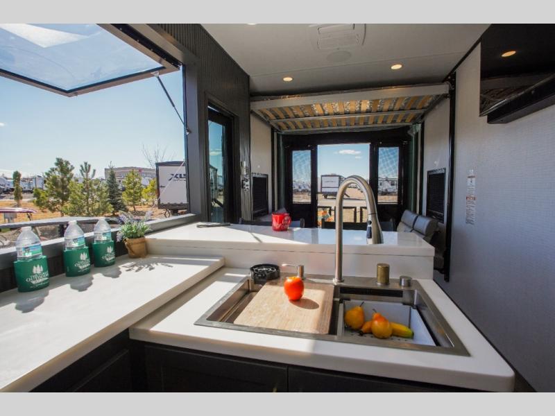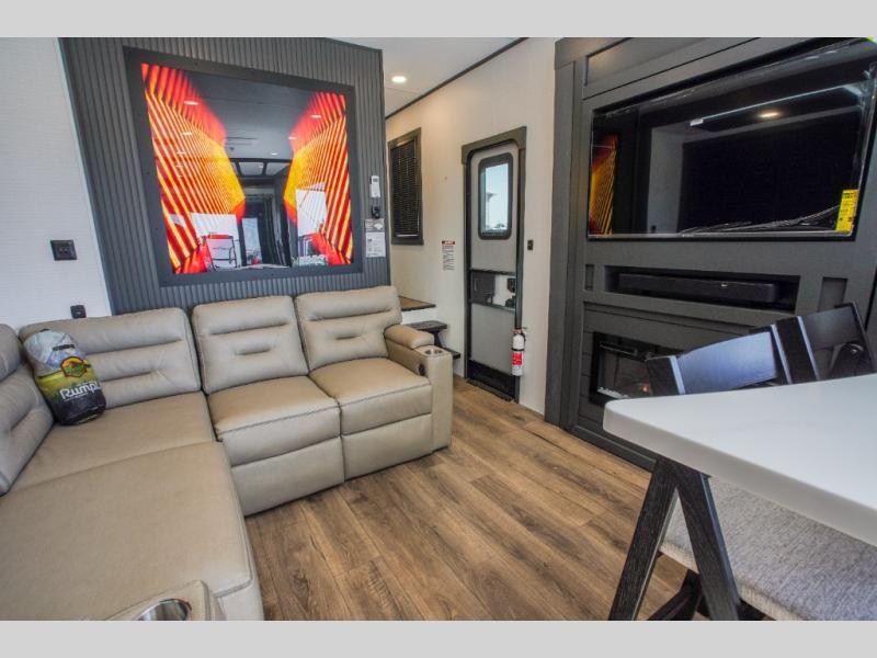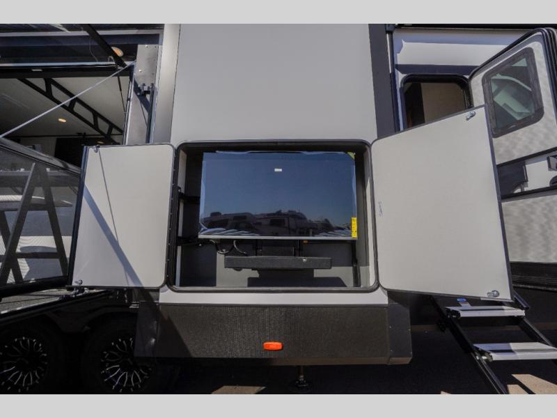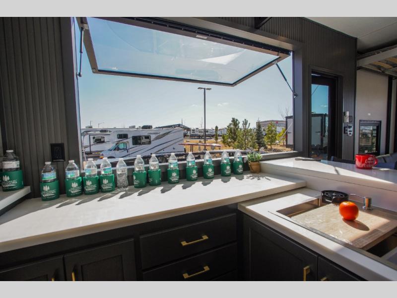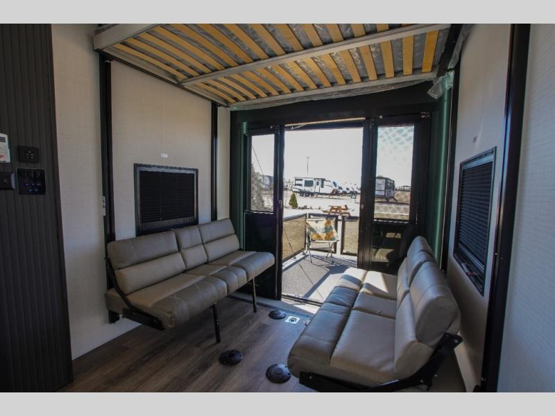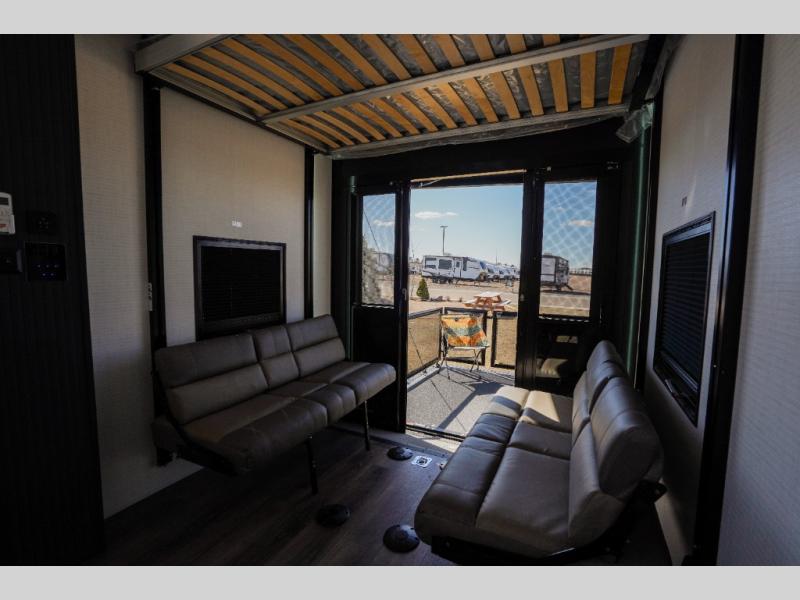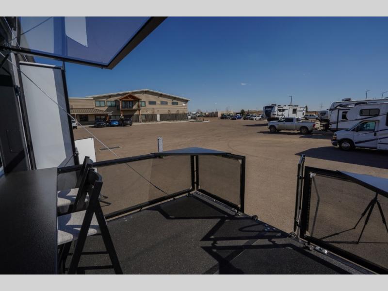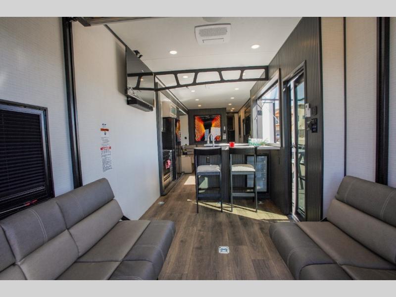 It's easy to see why this model was voted 2025 Top Innovation by RV Business! Once you arrive at your destination, you can unload your toys from the 13' garage, then relax on the dual gaucho sofas with a removable dinette table in between. There is also a queen-size Euro bed above the sofa where guests can sleep. Everyone will love to visit on the side patio that features a flip-down bar top and a window that looks into the kitchen. There are also bar stools here and inside at the counter so everyone has a seat. If the weather isn't cooperating, you can relax on the L-shaped sofa in the main living area, and there is a 55" TV with a hidden pantry behind for snacks! A spacious full bath will let everyone freshen up after trail riding, and you'll love having your own bedroom up front. Here, you'll find a king bed slide out, a wardrobe, dresser, plus washer and dryer prep if you choose to add those appliances!