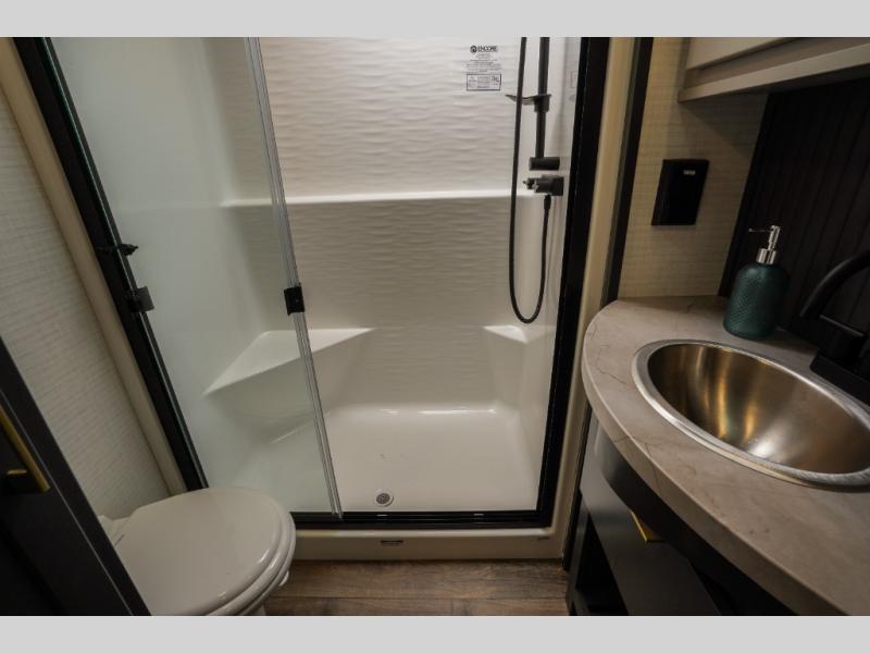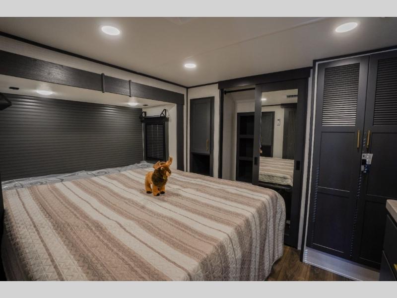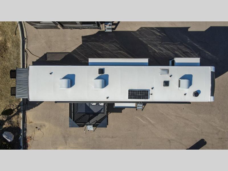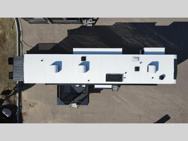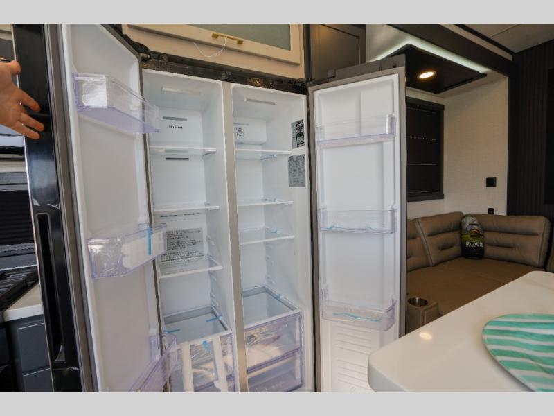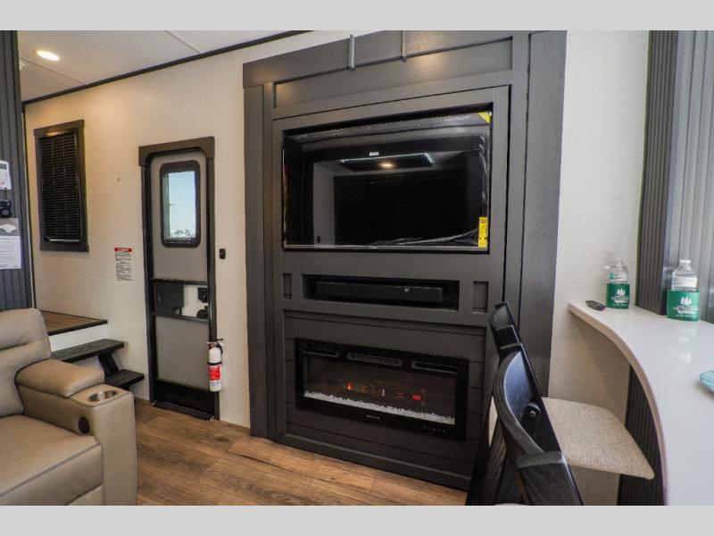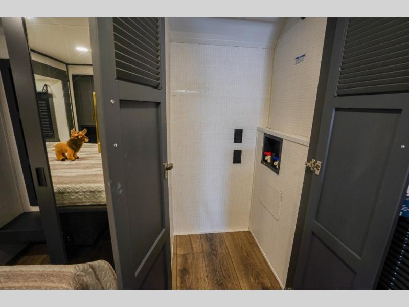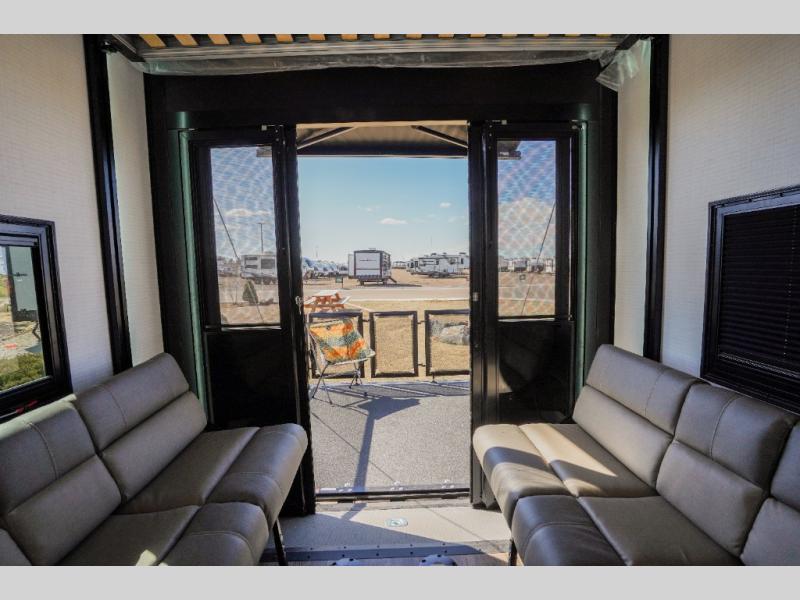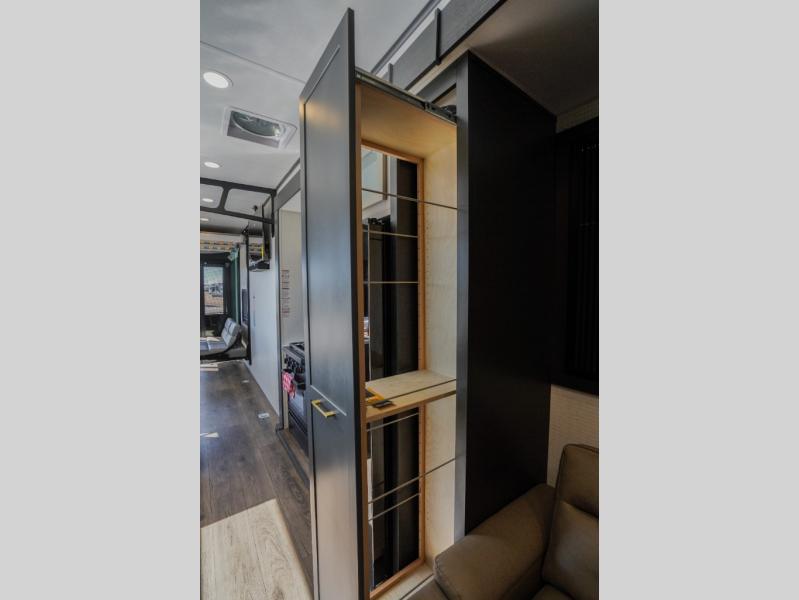 It's easy to see why this model was voted 2025 Top Innovation by RV Business! Once you arrive at your destination, you can unload your toys from the 13' garage, then relax on the dual gaucho sofas with a removable dinette table in between. There is also a queen-size Euro bed above the sofa where guests can sleep. Everyone will love to visit on the side patio that features a flip-down bar top and a window that looks into the kitchen. There are also bar stools here and inside at the counter so everyone has a seat. If the weather isn't cooperating, you can relax on the L-shaped sofa in the main living area, and there is a 55" TV with a hidden pantry behind for snacks! A spacious full bath will let everyone freshen up after trail riding, and you'll love having your own bedroom up front. Here, you'll find a king bed slide out, a wardrobe, dresser, plus washer and dryer prep if you choose to add those appliances!