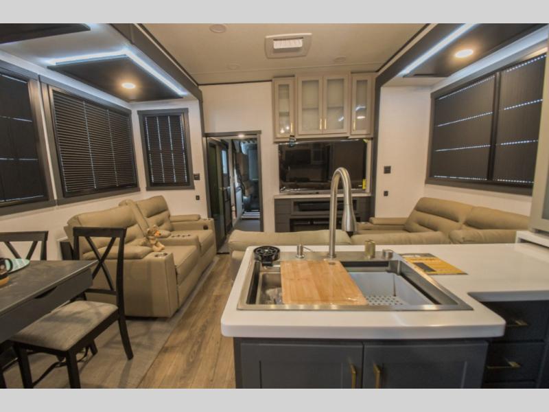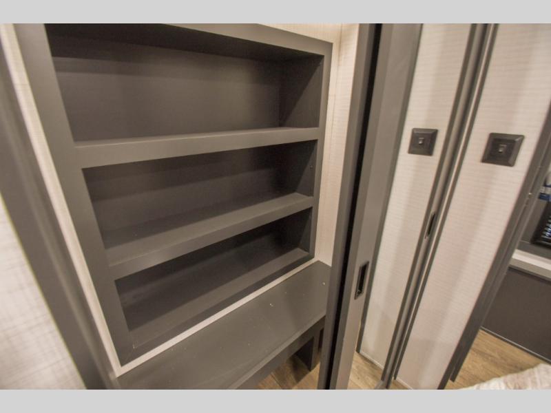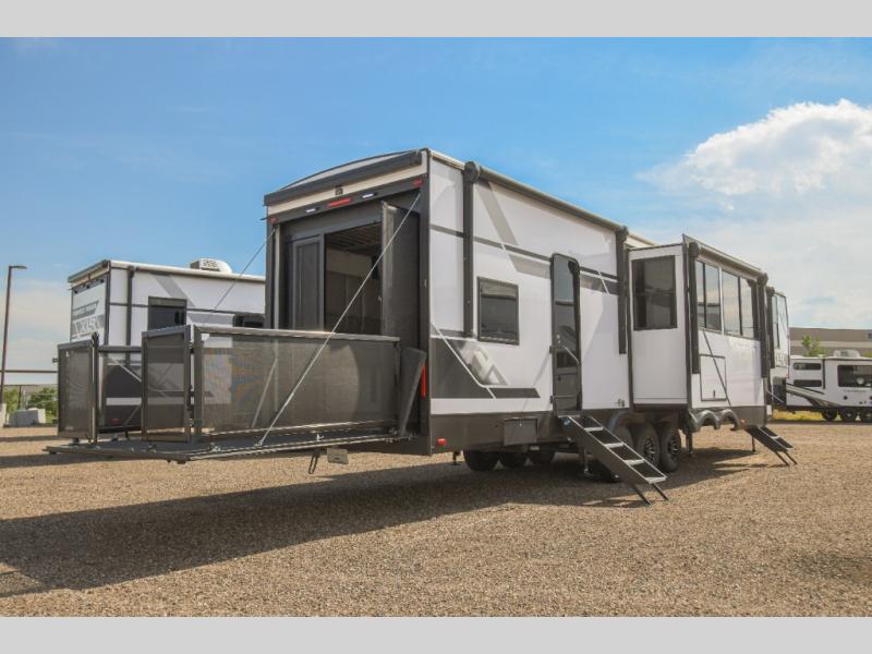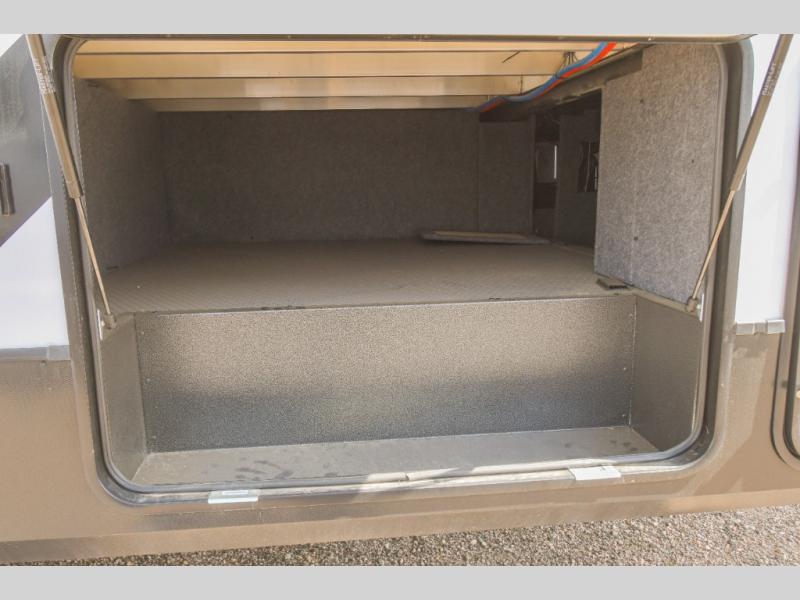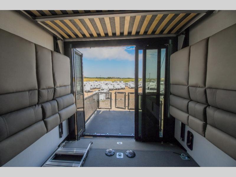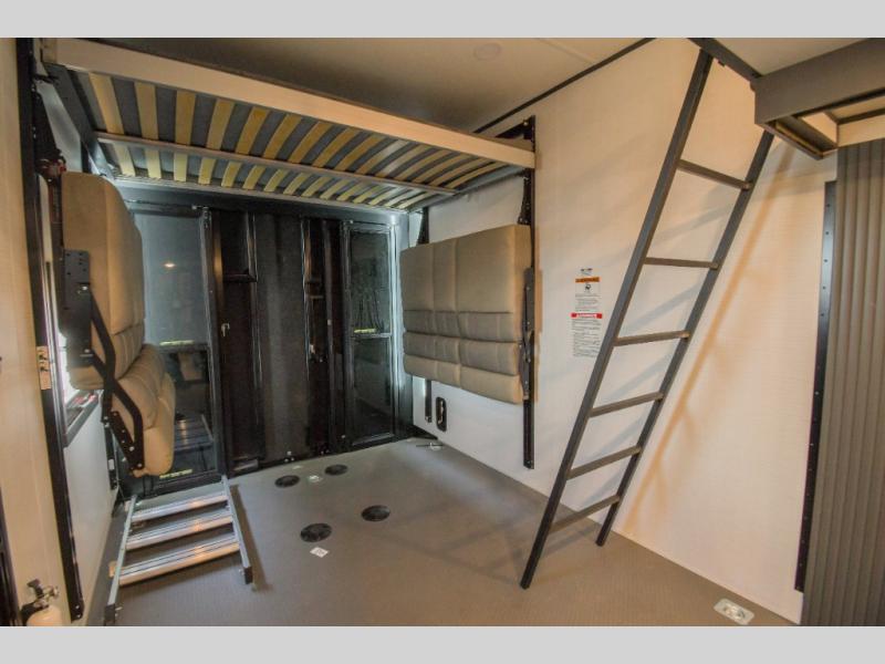 When you're ready to kick up some mud, hitch this toy hauler up and head out! You can set up the patio deck once your toys are removed from the 14' separate garage and relax with a cold drink. You'll find seating space on the Sit N Sleep roll-over sofas with a removable dinette table in between, and the Sleep N Store electric queen bed will provide sleeping space for your guests. There is also a loft and a half bath for even more convenience. Head through the garage glass sliding doors to the living area with an L-shaped sofa and theater seating, or start lunch in the shared middle kitchen with ample counter space. There is even a free-standing table and chairs like you would find at home. The full bath up front lets you clean up after a trail ride and the front private bedroom will have you feeling right at home. A king bed slide out comes standard, along with a large front wardrobe with washer and dryer prep, plus a dresser and TV backer if you want to add your own TV.