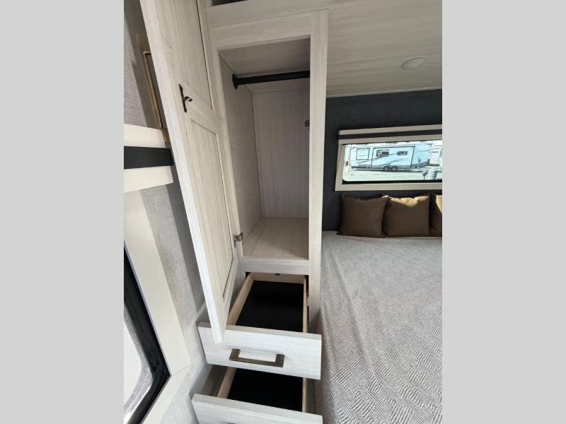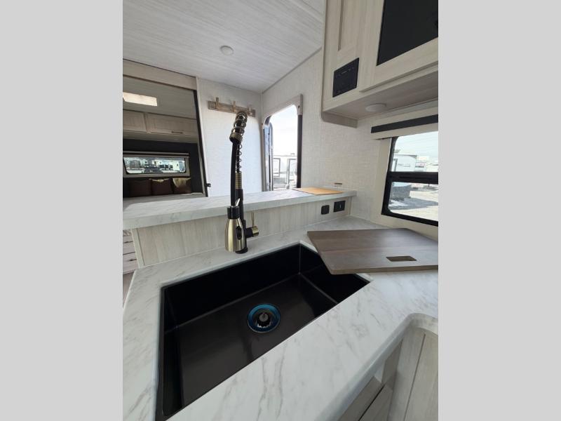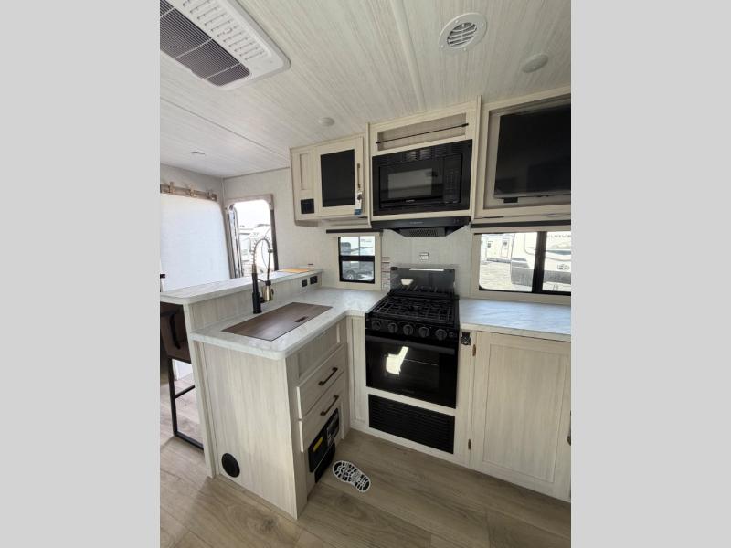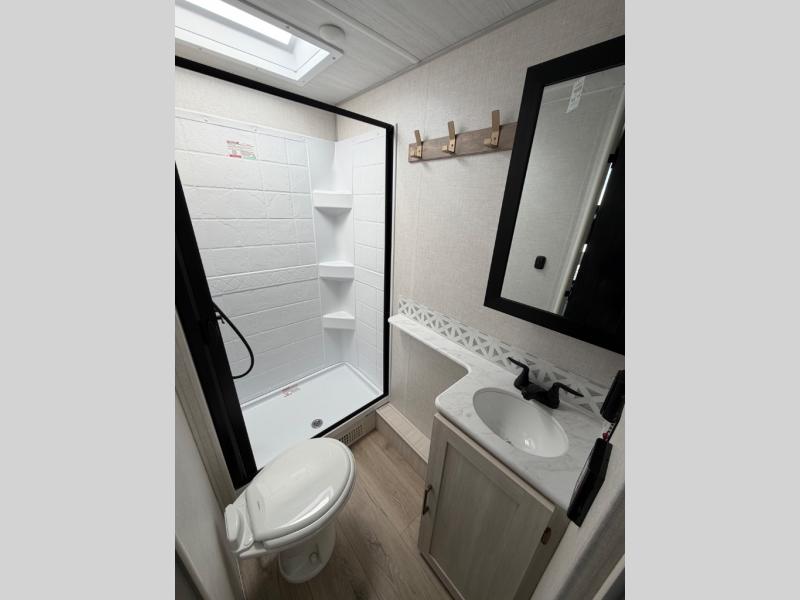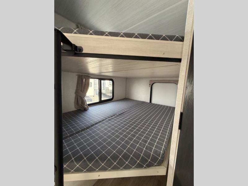 Enjoy cooking indoors or out thanks to the fully equipped kitchen and exterior cook station. The spacious bathroom includes a walk-in shower and direct access from the rear — ideal for busy campgrounds or muddy kids. Quality construction, aluminum framing, and a sleek, aerodynamic profile make this Surveyor 260BHLE a great option for adventurous families.