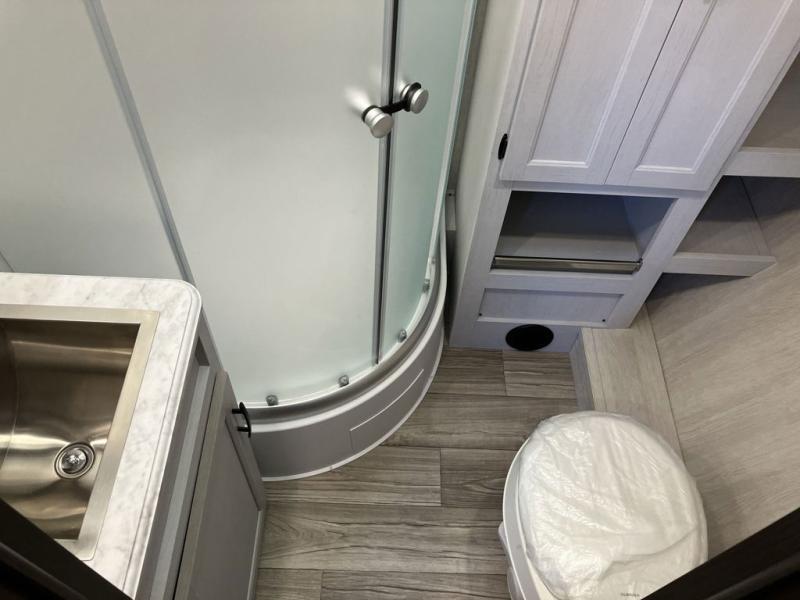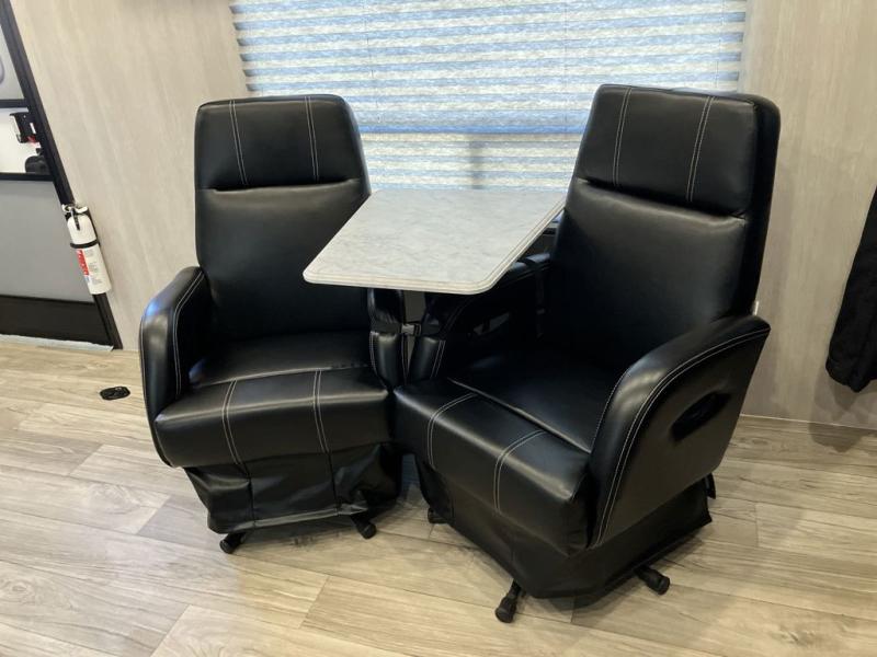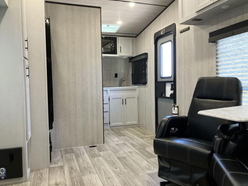 This toy hauler with 16' 1" cargo space will be perfect for trail riding fun! Once you've unloaded your toys, you can relax on the dual sofas with a table in between or enjoy a cold drink on the dual lounge chairs with a table. The entertainment center is across from the chairs for added convenience, and the kitchen pantry is nearby so you can grab a snack. A two burner cooktop, refrigerator, and sink also comes standard so you can prepare meals each day. And don't overlook the full bath with a toilet, sink, neo-angled shower, and bath wardrobe for clean towels.