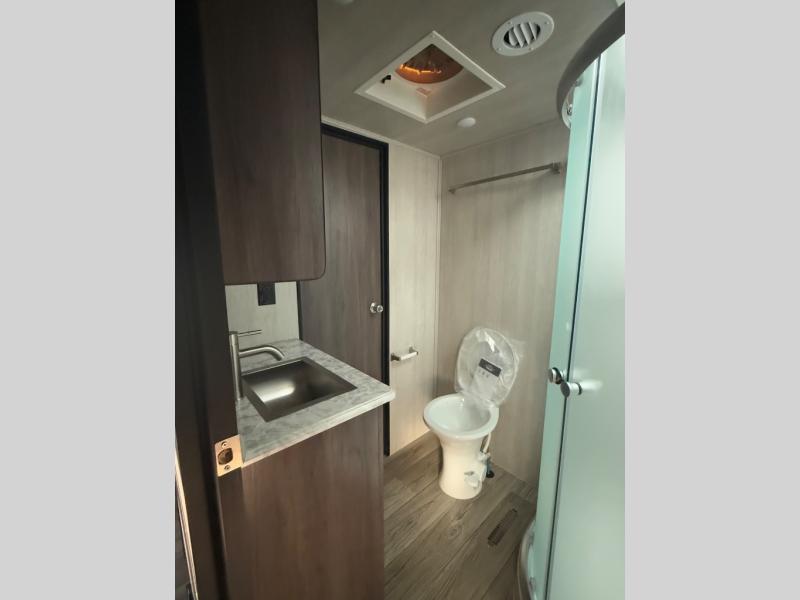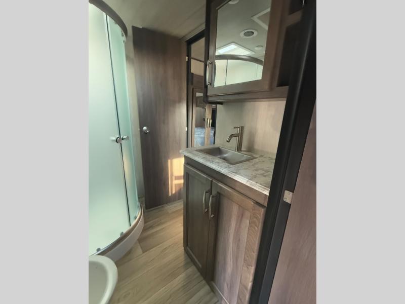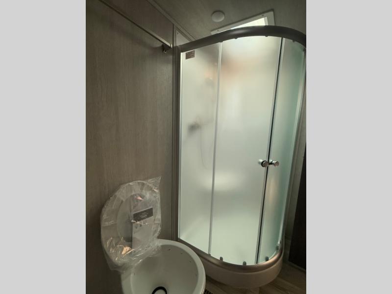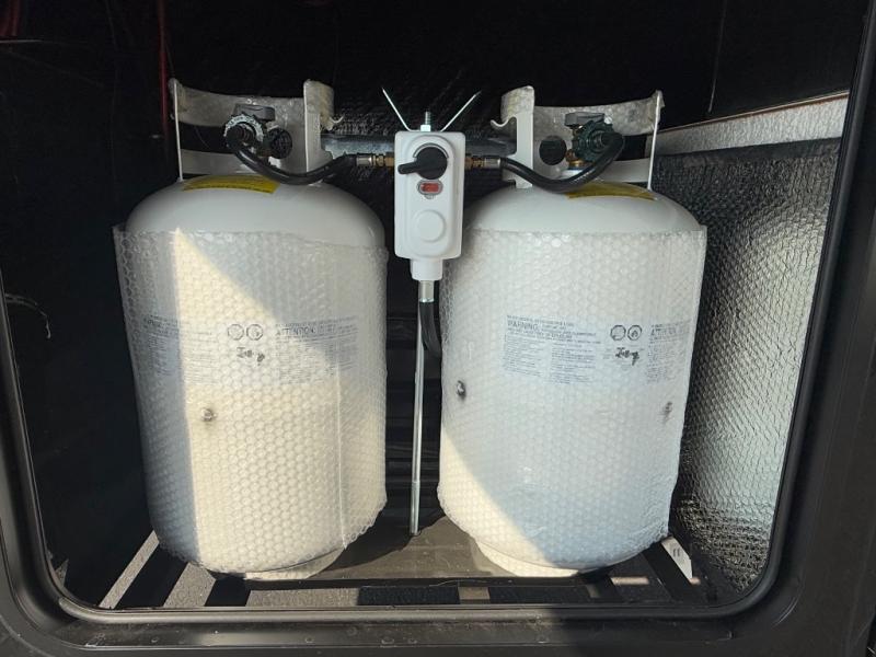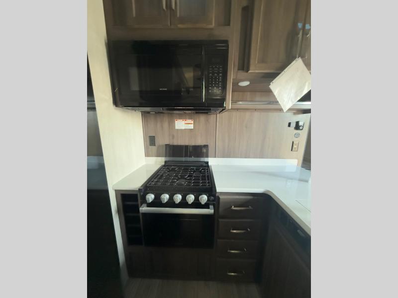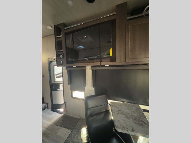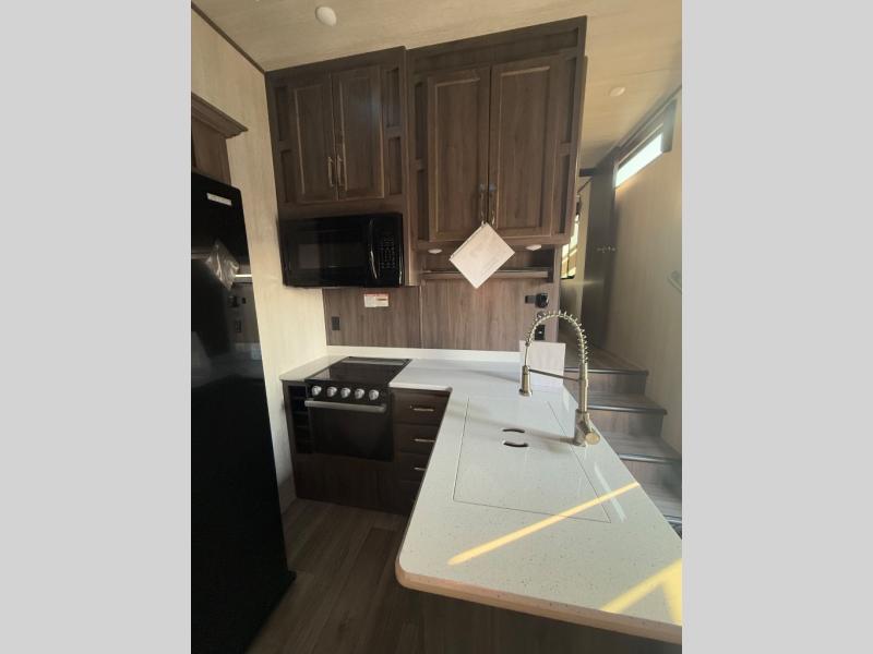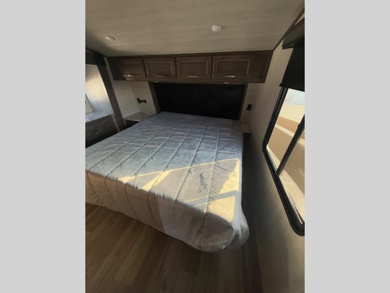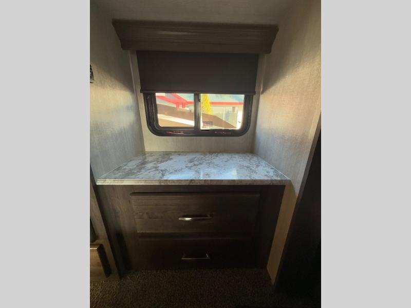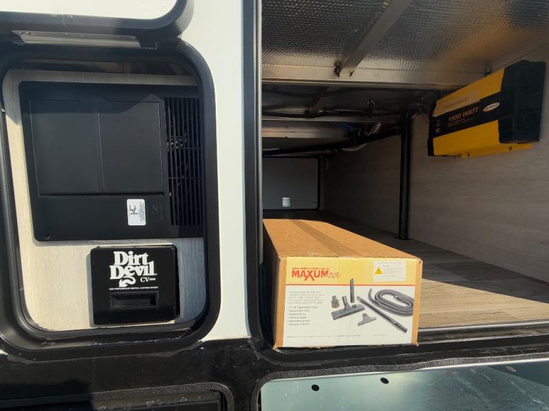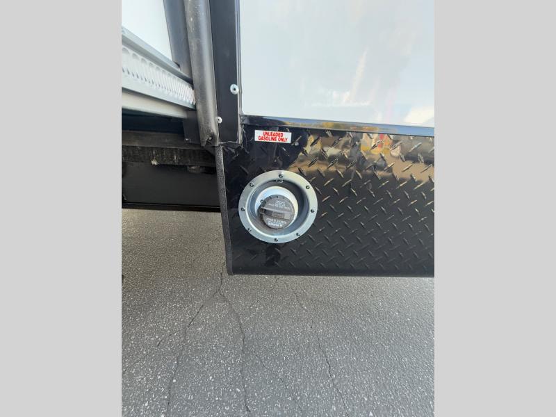 Imagine you, your family and your toys at competitions or fun events or weeklong trips with this fifth wheel and all the comforts inside. The cargo area becomes the main living and kitchen area with a slide out sofa, and an L-shaped countertop for more prep space, plus two chairs and dual opposing sofas with tables. The power queen bed in the rear stays up and away during the day then can easily be dropped down to sleep on. The front master bedroom is spacious as well with a slide out vanity/wardrobe and the second entry into the bathroom which is super convenient.