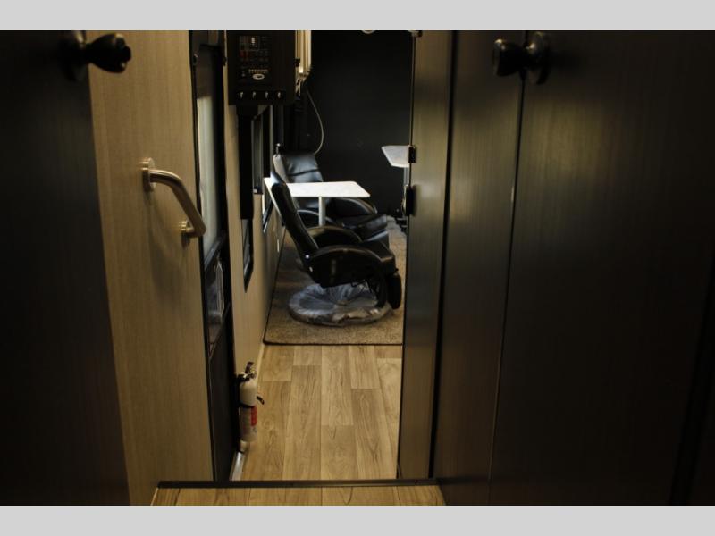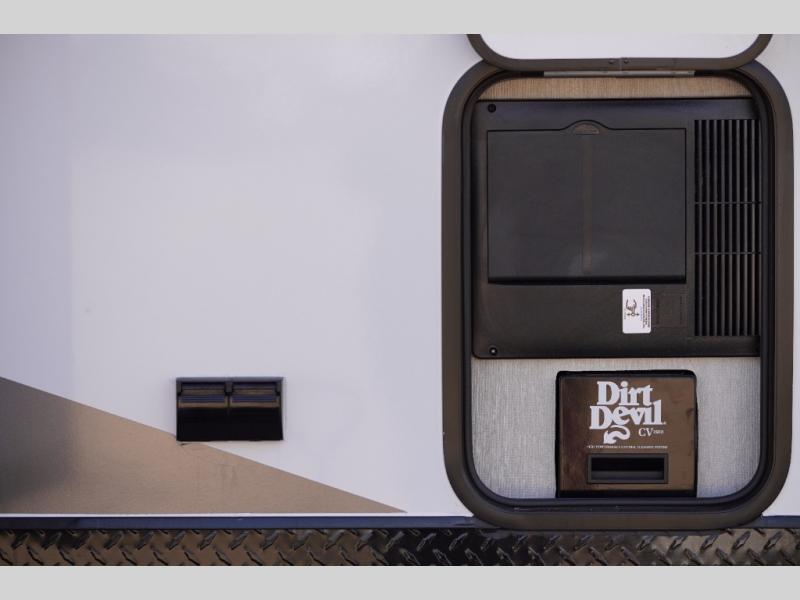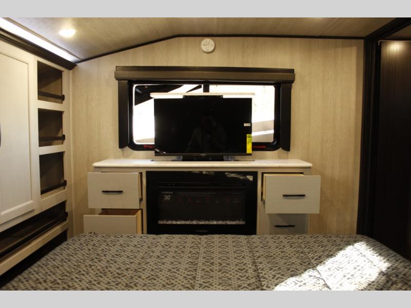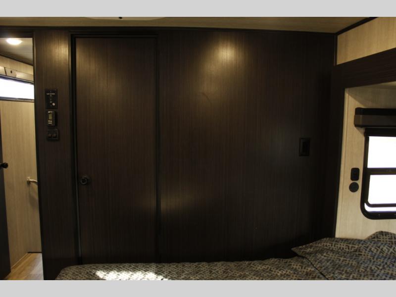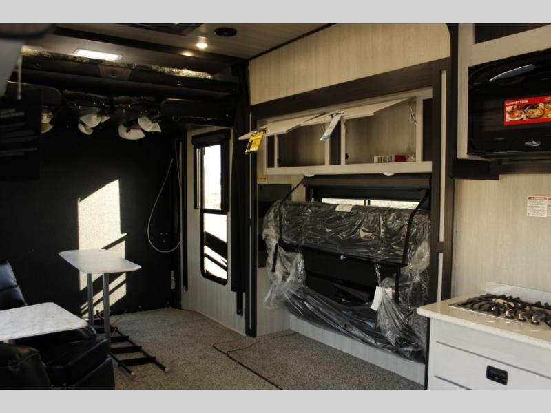 Wherever you decide to kick up some mud, you can be sure to have a great time in this spacious toy hauler! Once you unload your bikes from the 8' laminated ramp door with a beaver tail, you can relax in the garage on the dual swivel/rocker chairs with a table or on the sofa bed slide out. There is also a power sofa bed and a powered upper bunk so guests have comfortable places to sleep. The living room 32" TV and bedroom 32" TV will ensure you'll never go bored, but you may just find yourselves outdoors under the power awning with an LED light strip. When you're ready to hit the hay, the front private bedroom with an RV T king bed is sure to provide a great night's rest, and the wall-to-wall wardrobe will keep all your items organized!