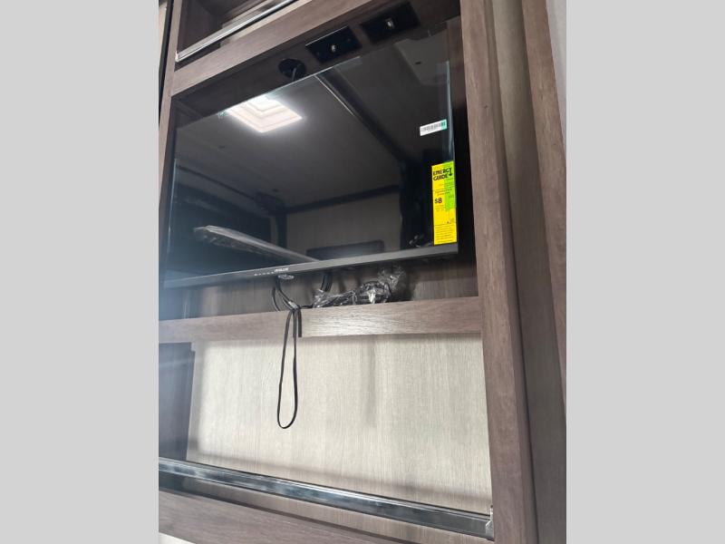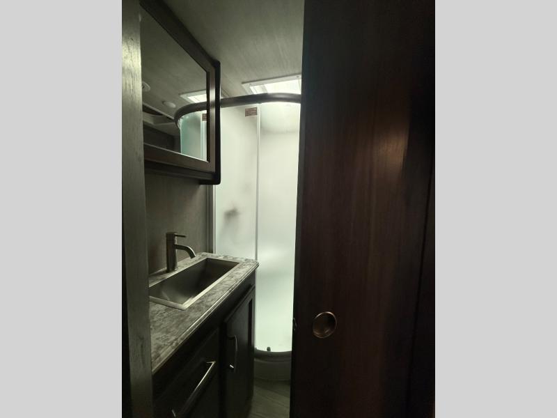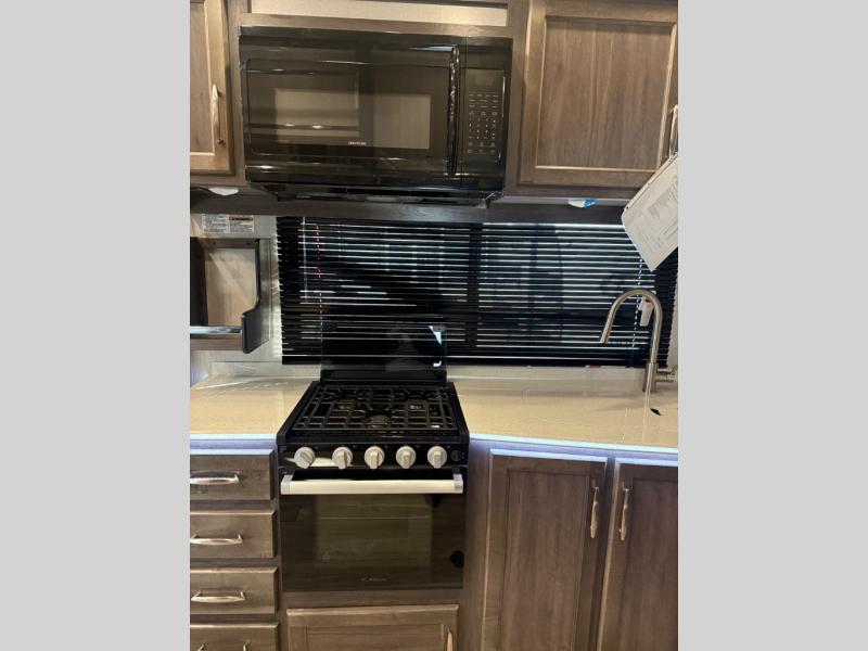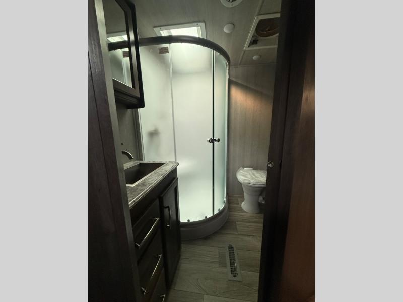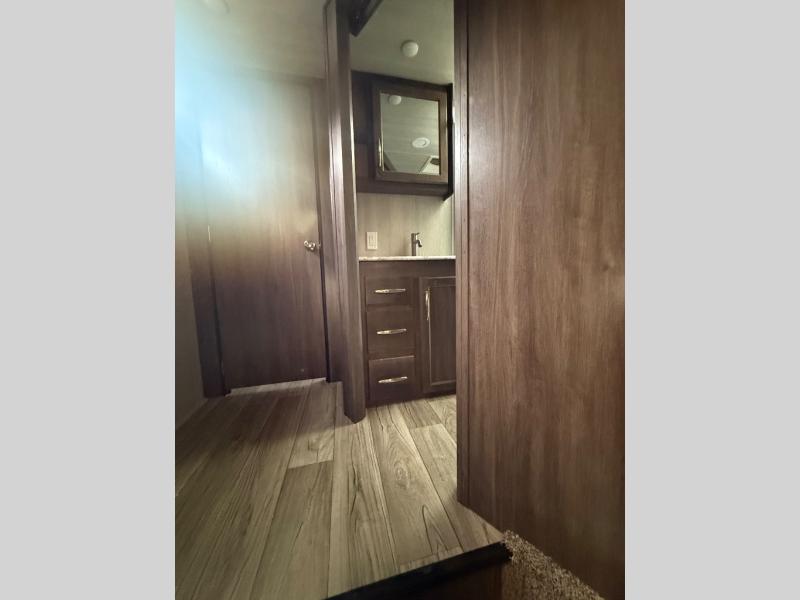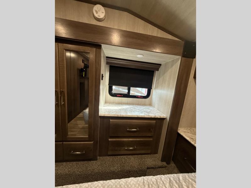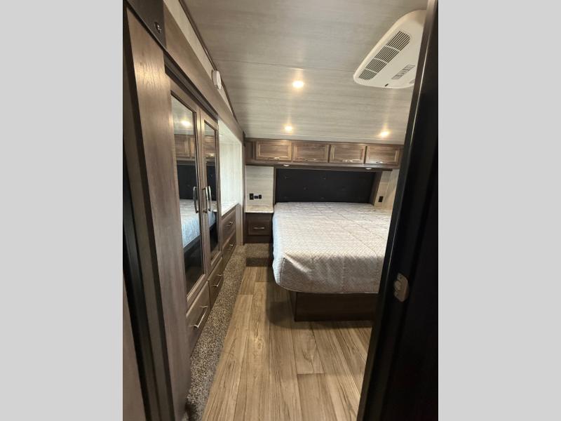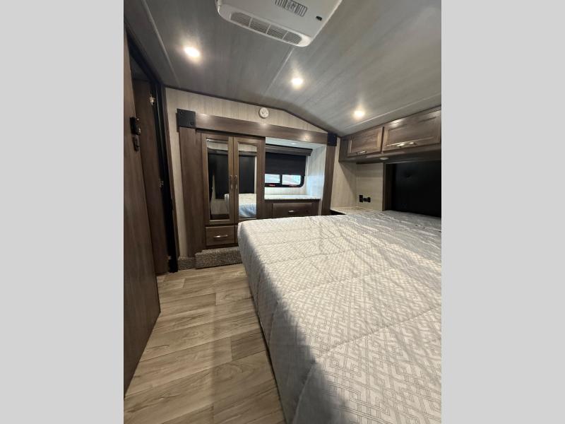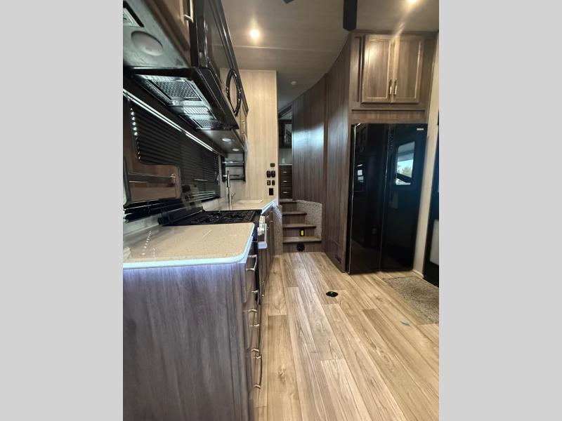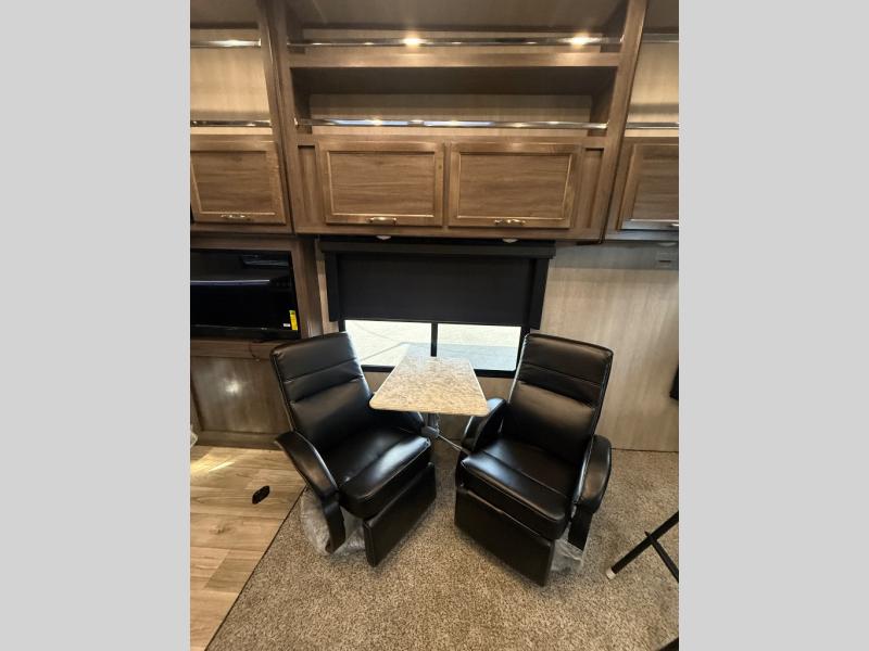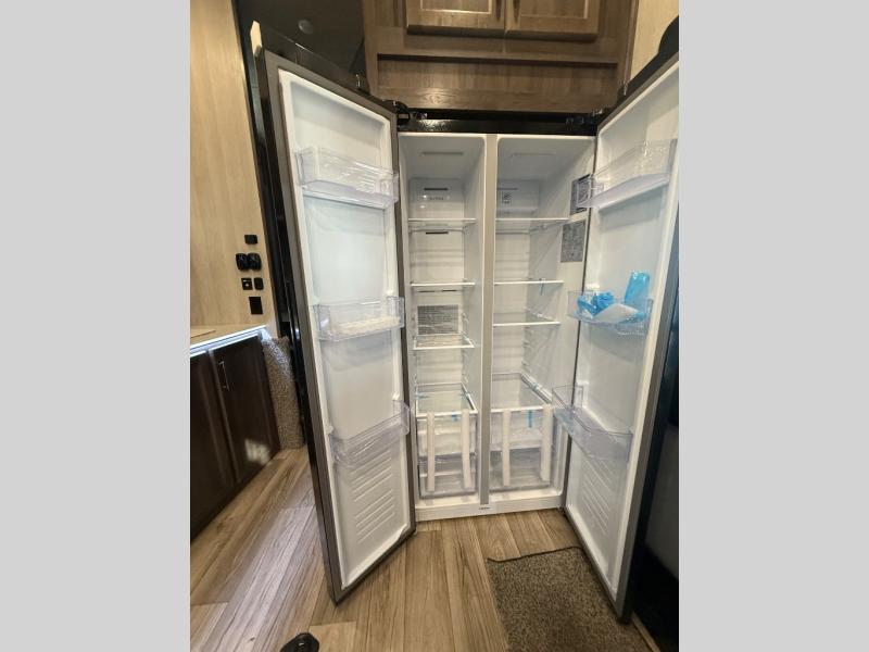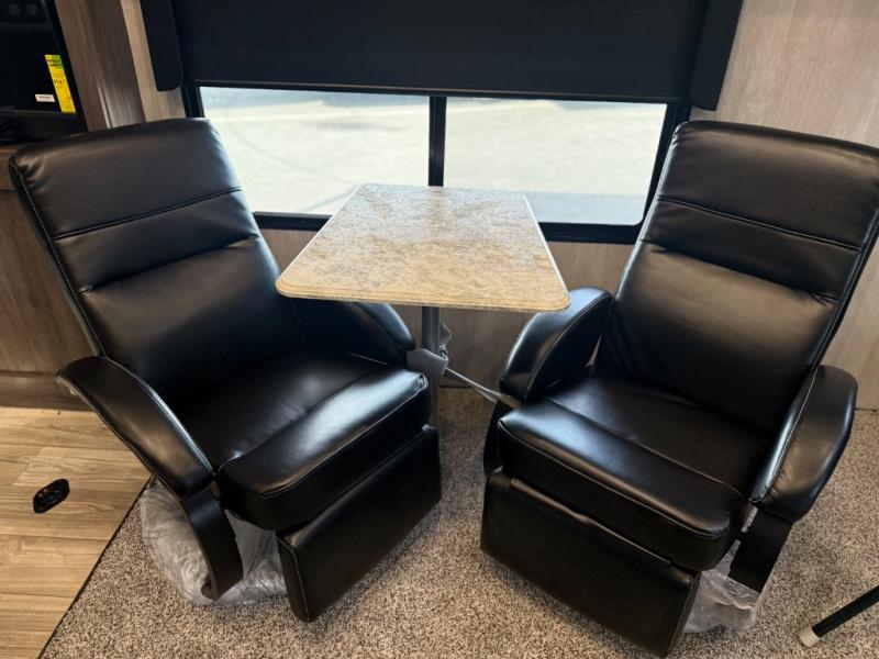 This dual axle fifth wheel offers a load of fun with 19' 5" of cargo space for your toys plus additional floor space in the front private bedroom thanks to the slide out duo vanity/wardrobe that comes standard. You might like to add the optional sofa slide out in the main cargo/living area for even more room for everyone. You can make warm meals in the kitchen with full amenities including an 8 cu. ft. extra large double door refrigerator, a pantry and an XL residential microwave. The two swivel/rocker chairs provide a great inside area to relax as you wait your turn on the toys.