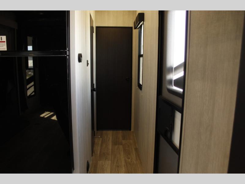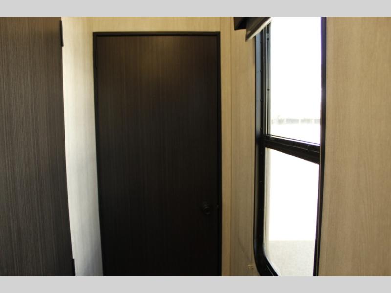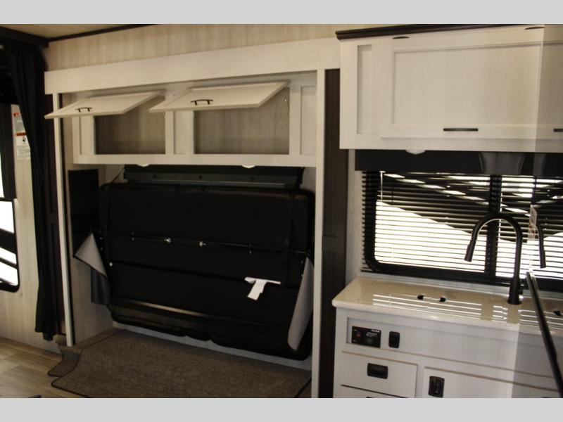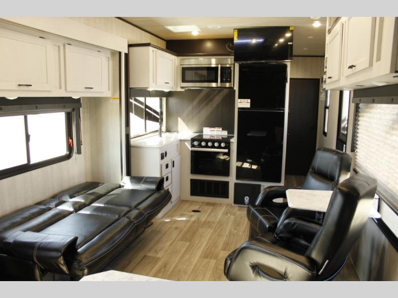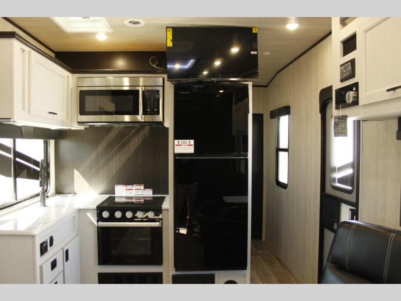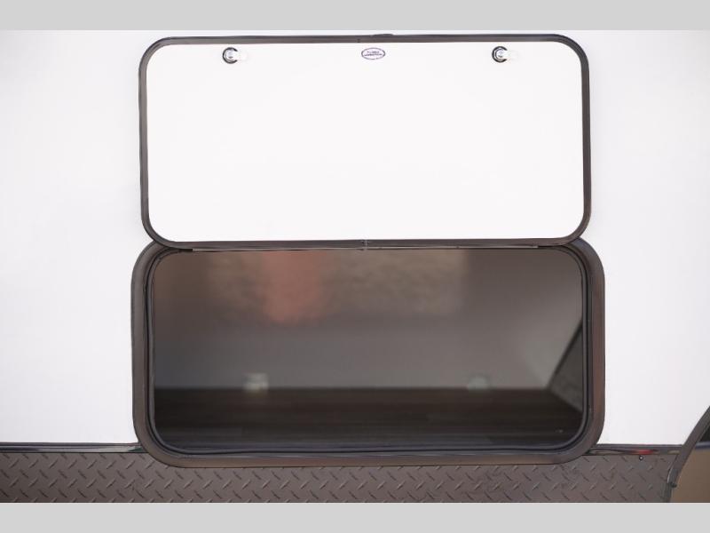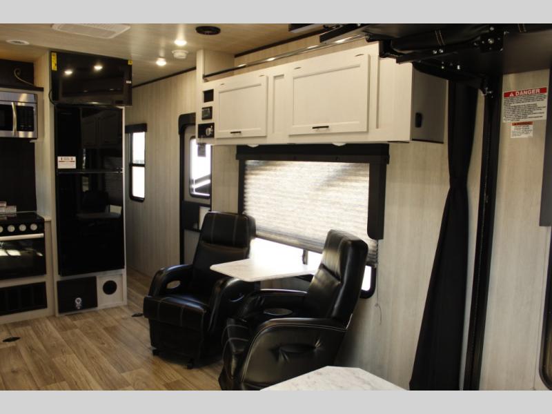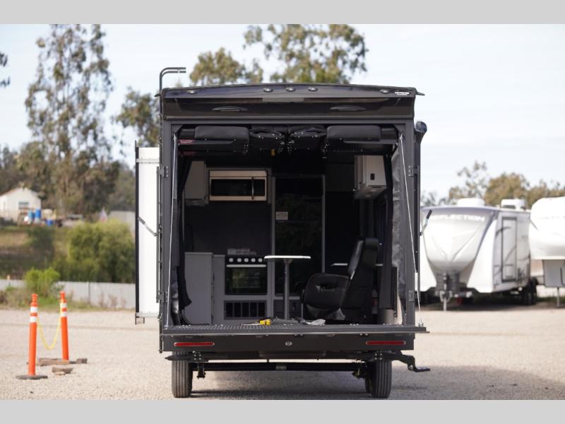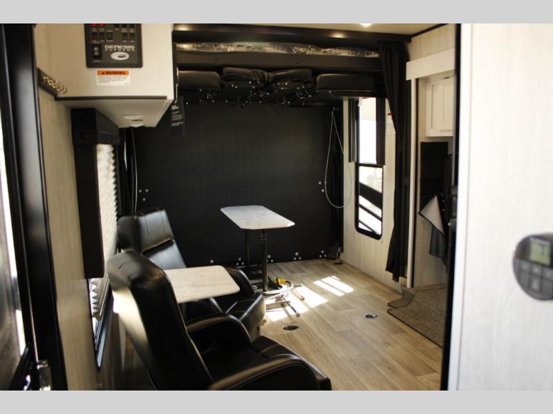 Looking for plenty of cargo space for your toys, a private bedroom for yourself with a walk-around bed, and a spacious full bath? You have found it with this toy hauler! You will also find lots of storage in the bedroom wardrobes, the overhead cabinets and along the exterior to carry all of your clothing, food and gear. The L-shaped kitchen offers full amenities including a 10 cu. ft. 12V refrigerator and microwave to keep everyone fed. You can dine inside at the booth dinette or on the sofa, or head outdoors to relax under the power awning. This model also includes two powered rear queen beds for guests to sleep on!