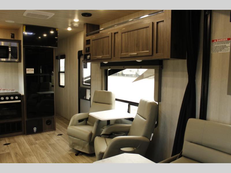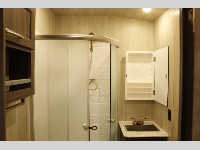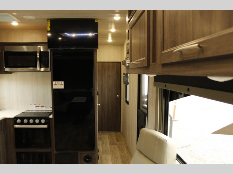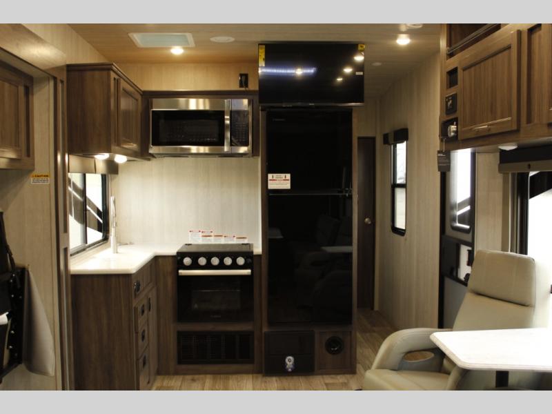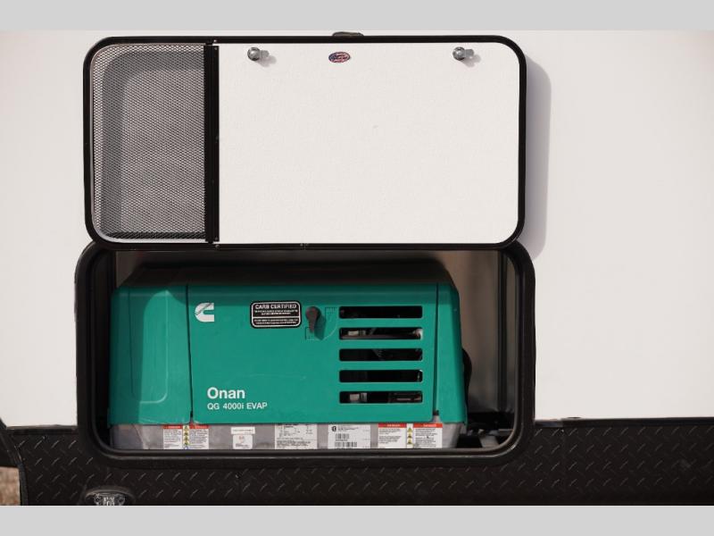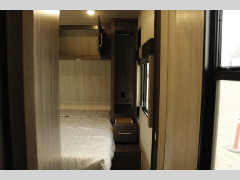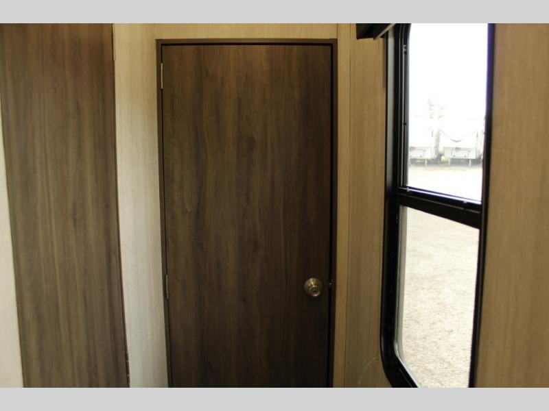 Looking for plenty of cargo space for your toys, a private bedroom for yourself with a walk-around bed, and a spacious full bath? You have found it with this toy hauler! You will also find lots of storage in the bedroom wardrobes, the overhead cabinets and along the exterior to carry all of your clothing, food and gear. The L-shaped kitchen offers full amenities including a 10 cu. ft. 12V refrigerator and microwave to keep everyone fed. You can dine inside at the booth dinette or on the sofa, or head outdoors to relax under the power awning. This model also includes two powered rear queen beds for guests to sleep on!