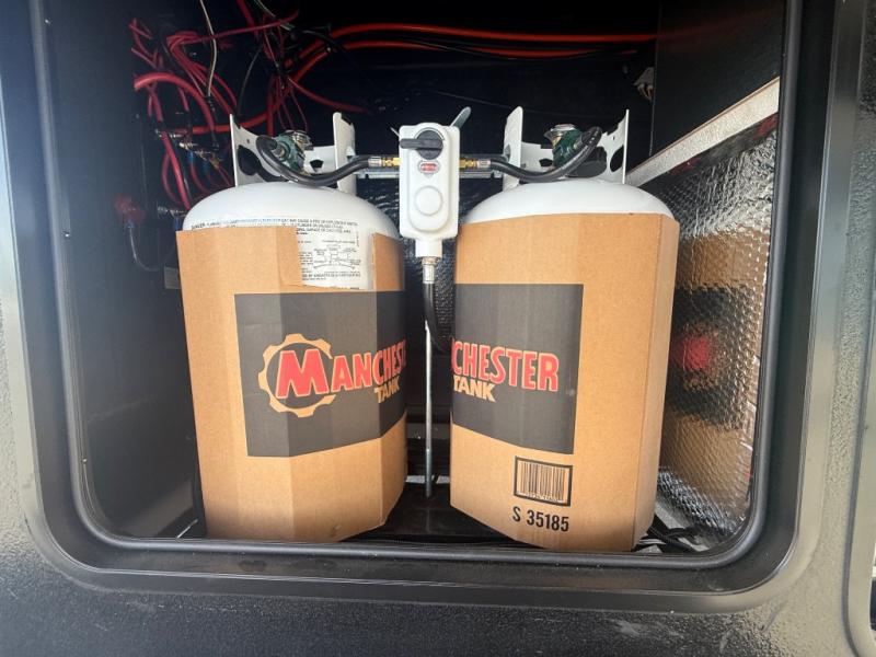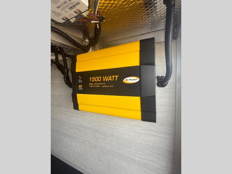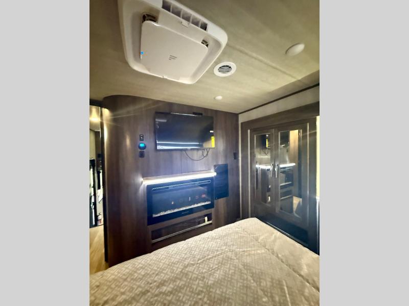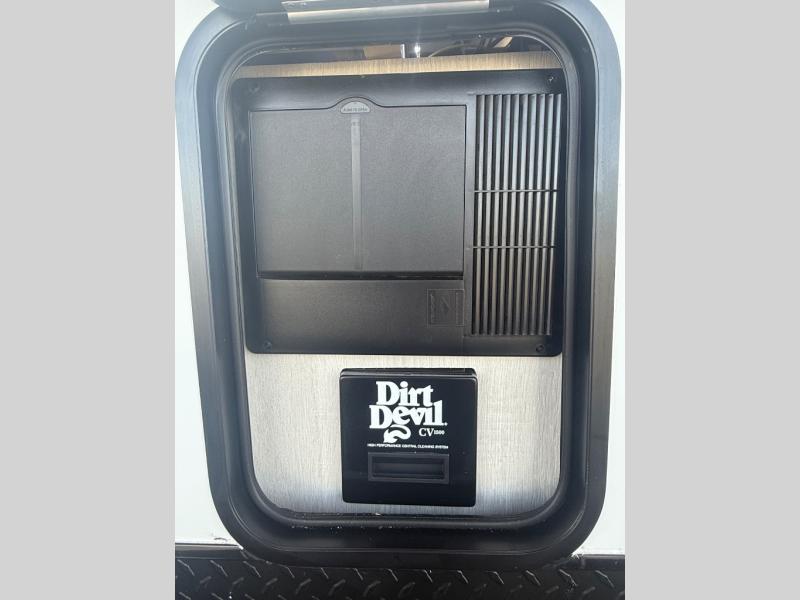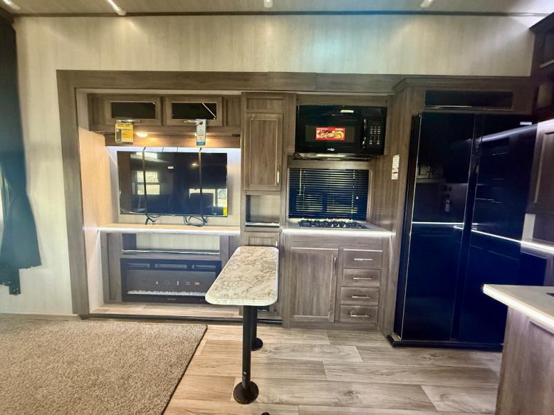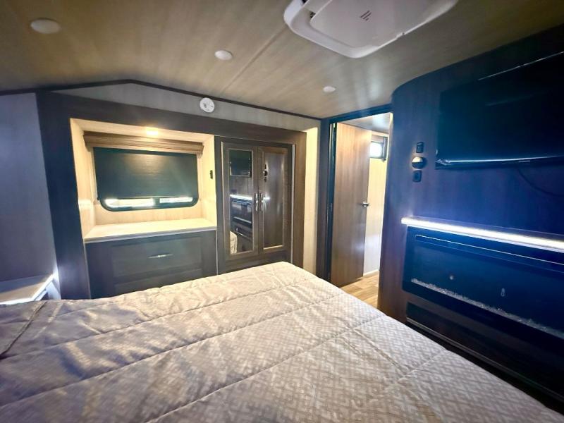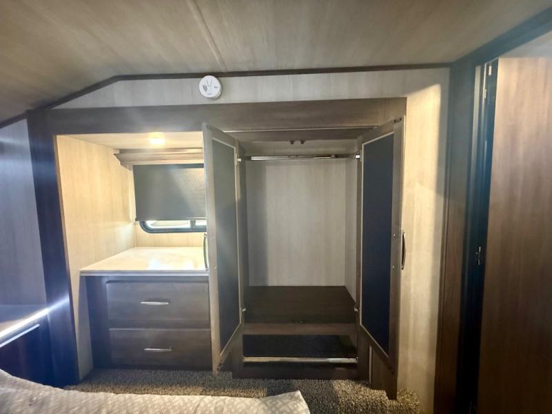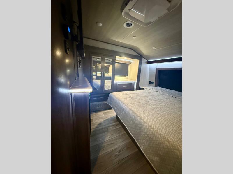 You will love camping in this spacious toy hauler. There is a three burner cooktop to cook meals each day, plus a 12V refrigerator for food storage. The dual lounge chairs give you a place to relax each day, and the drop down bed will give your guests a place to sleep at night. And don't overlook the front private bedroom with a king bed with memory foam for added comfort!