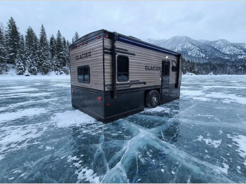 Each RV Explorer ice house by Glacier Ice House comes with a trussed roof for a greater snow load, a voltage meter, black diamond plate wheel wells and front nose, a reflective graphics package, LED speakers, and LED ice hole lights. Inside, you will find a microwave oven, a forced-air furnace, a non-ducted A/C, dual-pane windows, LED interior and exterior lighting, and cedar interior. Choose the model that fits your fishing or camping needs, and experience the ultimate way to play!