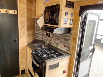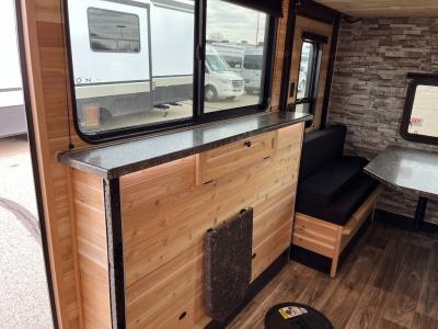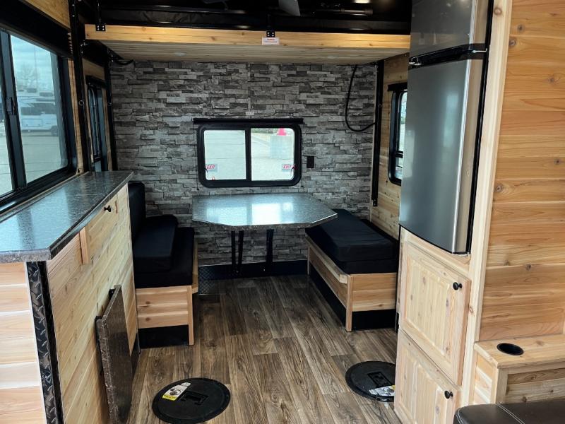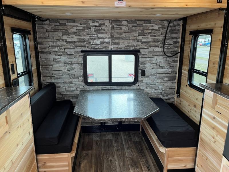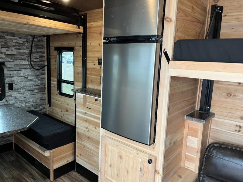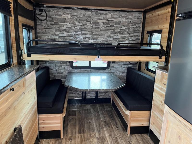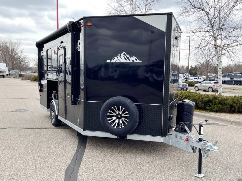 Six ice holes with lights, two bunk beds, and furniture to relax and dine on are calling you to the perfect spot for the weekend. You will appreciate the forced-air furnace during the cooler months and the non-ducted A/C when it gets a little too hot inside. The cook can make meals on the three-burner range with an oven, store leftovers in the 4.5-cu. ft. 12V refrigerator, and there is dining space on the rear sofa with a table. The front full bathroom will allow you to stay inside longer unless you want to relax under the power awning outside, and you will find storage throughout in the overhead cabinets, on the countertops, and inside the bathroom.