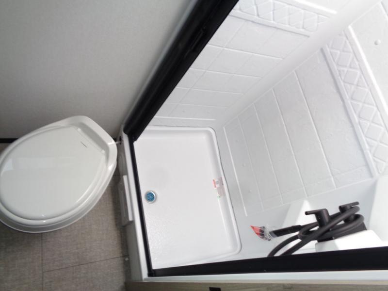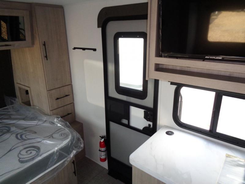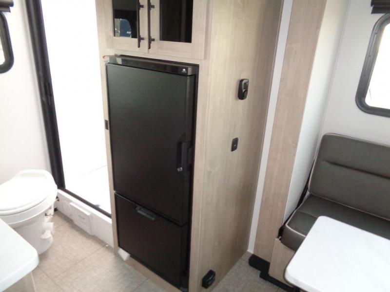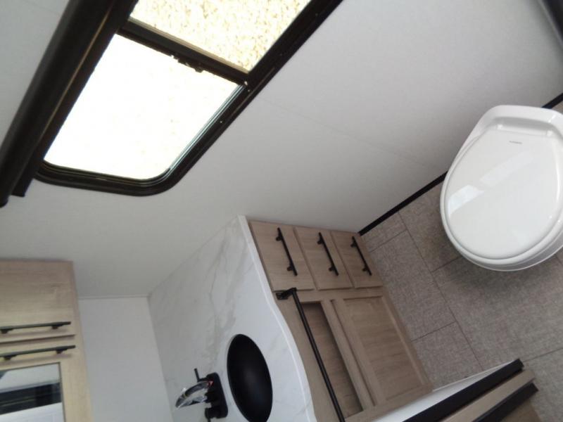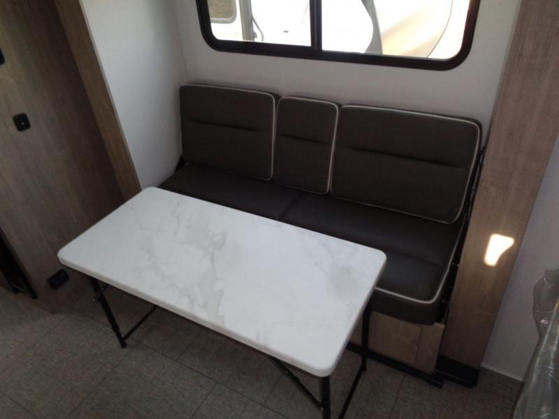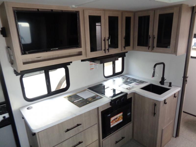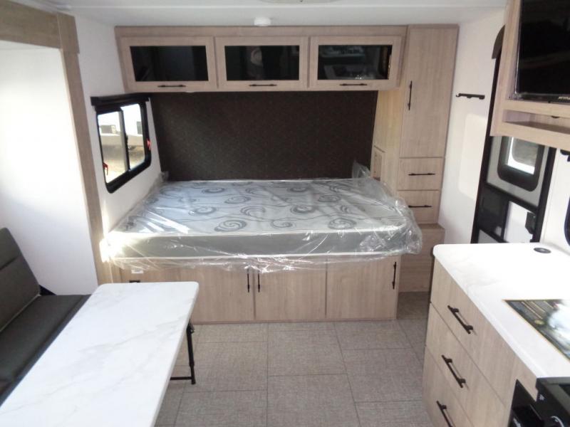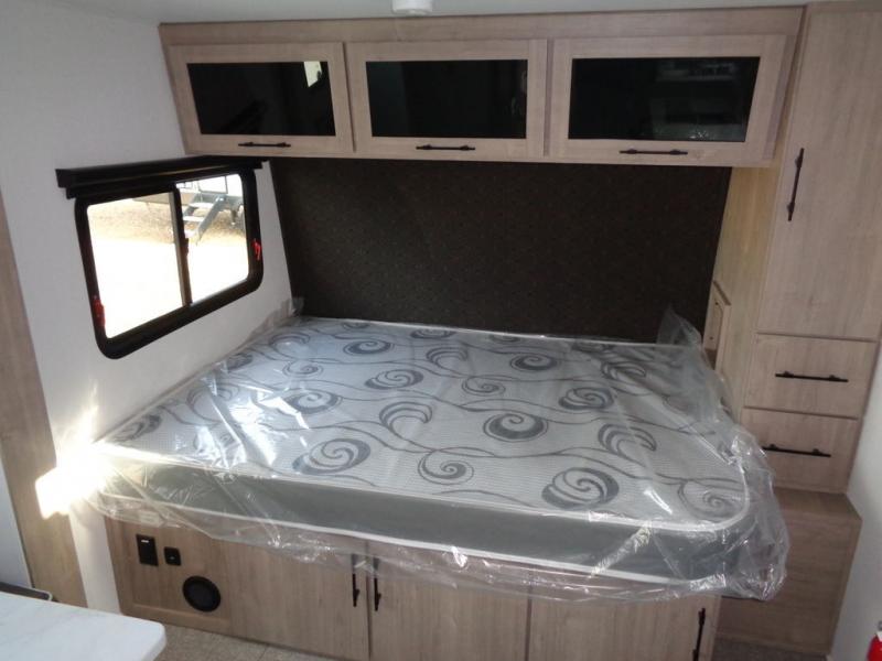 Pack your bags and head out on a fun camping trip in this travel trailer! The front queen bed offers a comfortable place to sleep at night, as well as the roll-over sleeper sofa slide with drawers for storage. You can hang your jacket up on one of the coat hooks when you enter, and then start preparing a delicious meal on the two burner cooktop. You even have an outside griddle to fry up the catch of the day. The full rear bathroom has a walk-in shower with skylight to freshen up in and overhead cabinets for your toiletries!