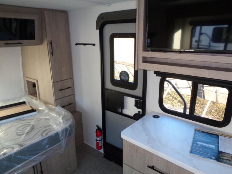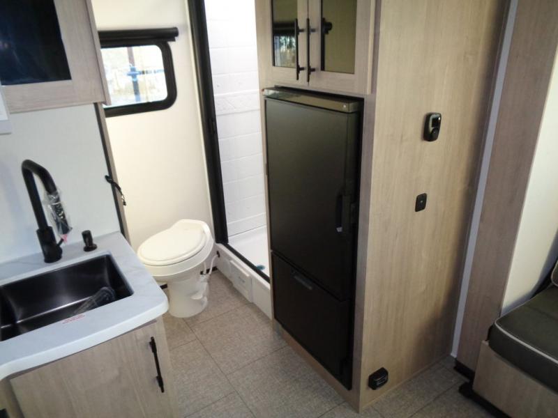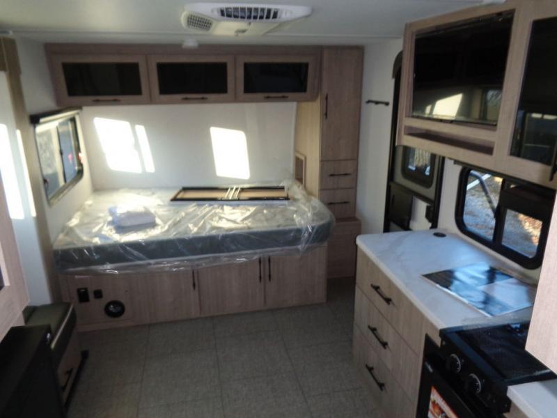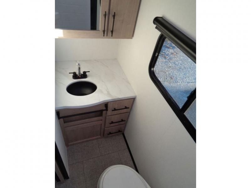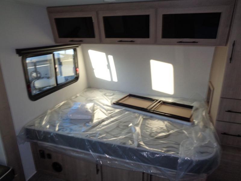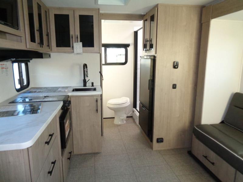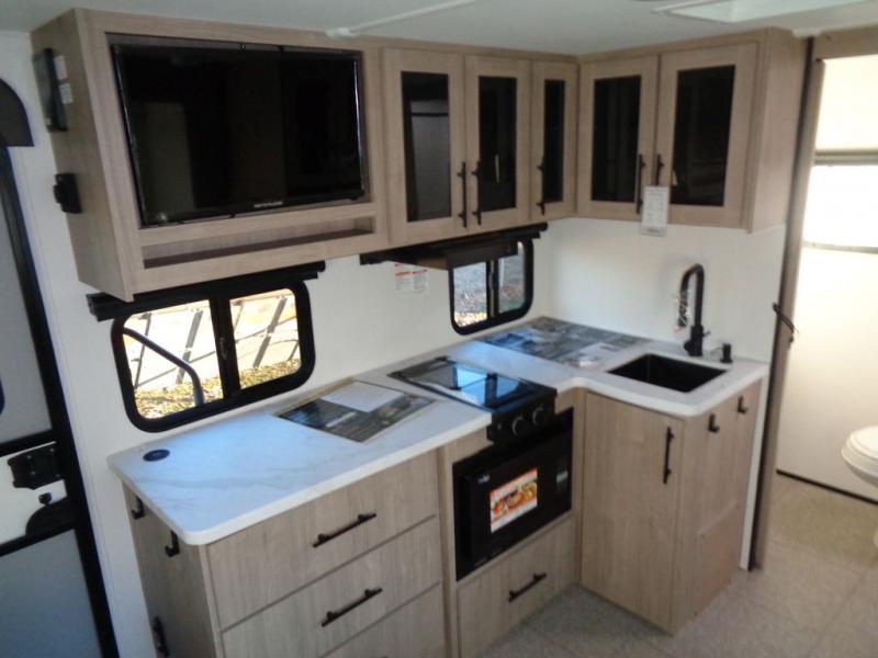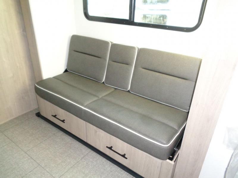 Pack your bags and head out on a fun camping trip in this travel trailer! The front queen bed offers a comfortable place to sleep at night, as well as the roll-over sleeper sofa slide with drawers for storage. You can hang your jacket up on one of the coat hooks when you enter, and then start preparing a delicious meal on the two burner cooktop. You even have an outside griddle to fry up the catch of the day. The full rear bathroom has a walk-in shower with skylight to freshen up in and overhead cabinets for your toiletries!