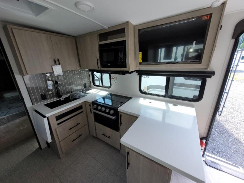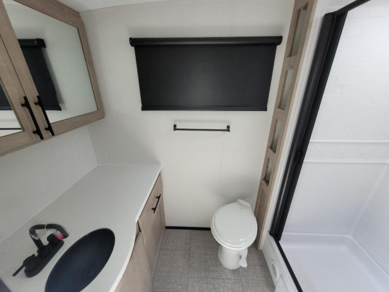 Escape to adventure with this fantastic travel trailer! The private bedroom features a plush 60" x 80" queen bed, spacious wardrobe, and TV prep for entertainment. The kitchen area is fitted with a pull-out pantry, 10 cu. refrigerator, microwave, and three-burner cooktop for gourmet meal prep. Enjoy extra counter space with the flip-up countertop extension, ideal for easy and comfortable cooking. Gather with family and friends at the theater dinette, featuring an LED HDTV for movie nights and game days after that, you can take a relaxing bath in the full rear bathroom, with ample storage. Stay organized on the go with pass-thru storage, 20” x 20” baggage door/trash can storage, and a spacious interior. Enjoy outdoor living under the shade of the 18’ awning, perfect for weekend getaways, or outdoor activities for the adventure-seekers.
