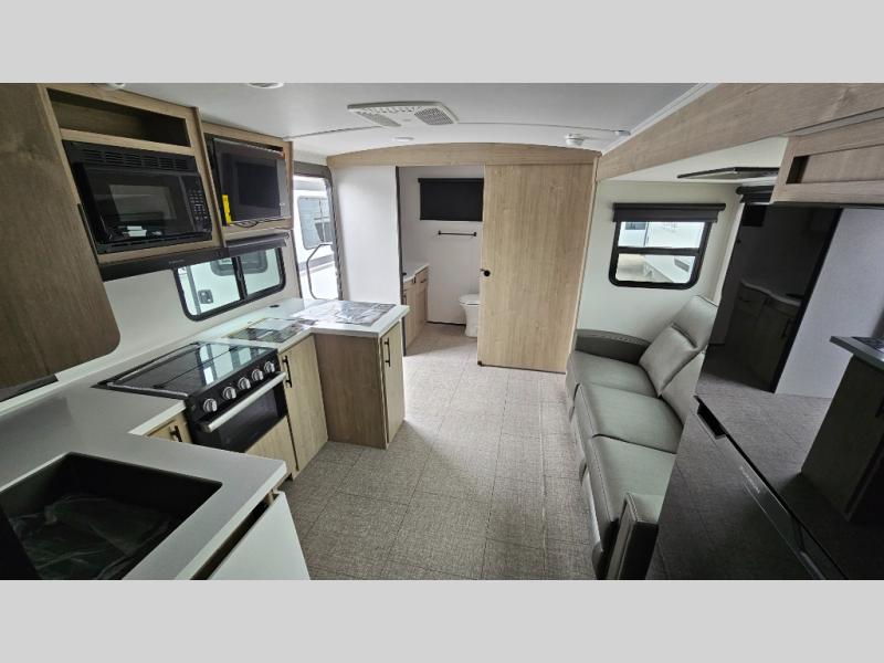 Escape to adventure with this fantastic travel trailer! The private bedroom features a plush 60" x 80" queen bed, spacious wardrobe, and TV prep for entertainment. The kitchen area is fitted with a pull-out pantry, 10 cu. refrigerator, microwave, and three-burner cooktop for gourmet meal prep. Enjoy extra counter space with the flip-up countertop extension, ideal for easy and comfortable cooking. Gather with family and friends at the theater dinette, featuring an LED HDTV for movie nights and game days after that, you can take a relaxing bath in the full rear bathroom, with ample storage. Stay organized on the go with pass-thru storage, 20” x 20” baggage door/trash can storage, and a spacious interior. Enjoy outdoor living under the shade of the 18’ awning, perfect for weekend getaways, or outdoor activities for the adventure-seekers.