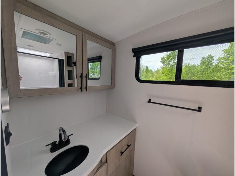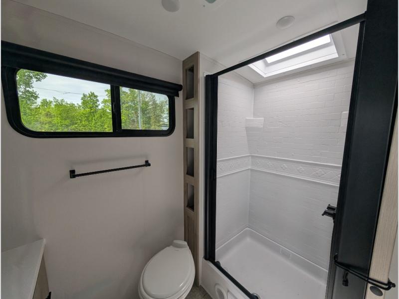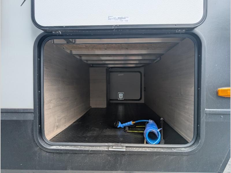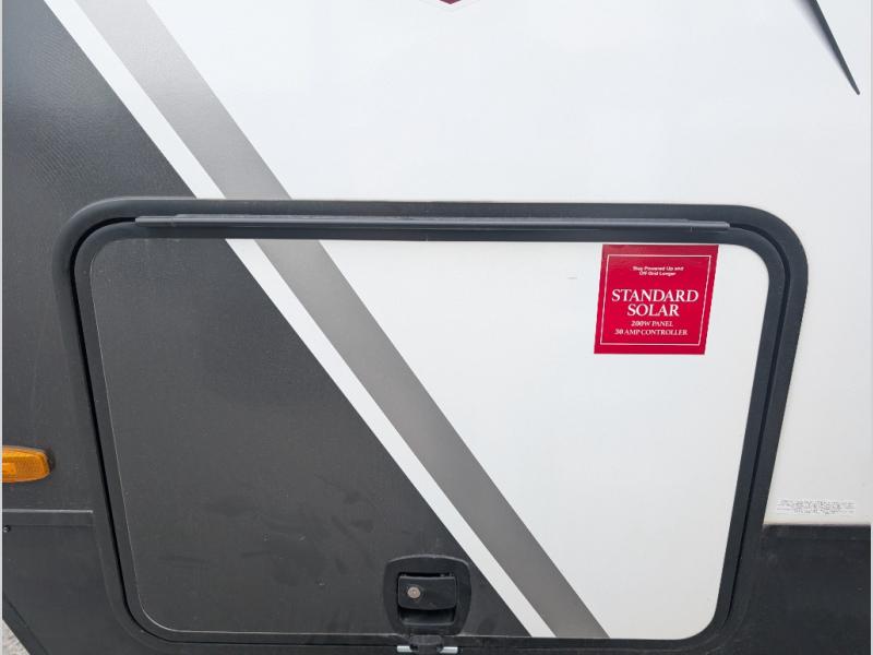 Escape to adventure with this fantastic travel trailer! The private bedroom features a plush 60" x 80" queen bed, spacious wardrobe, and TV prep for entertainment. The kitchen area is fitted with a pull-out pantry, 10 cu. refrigerator, microwave, and three-burner cooktop for gourmet meal prep. Enjoy extra counter space with the flip-up countertop extension, ideal for easy and comfortable cooking. Gather with family and friends at the theater dinette, featuring an LED HDTV for movie nights and game days after that, you can take a relaxing bath in the full rear bathroom, with ample storage. Stay organized on the go with pass-thru storage, 20” x 20” baggage door/trash can storage, and a spacious interior. Enjoy outdoor living under the shade of the 18’ awning, perfect for weekend getaways, or outdoor activities for the adventure-seekers.