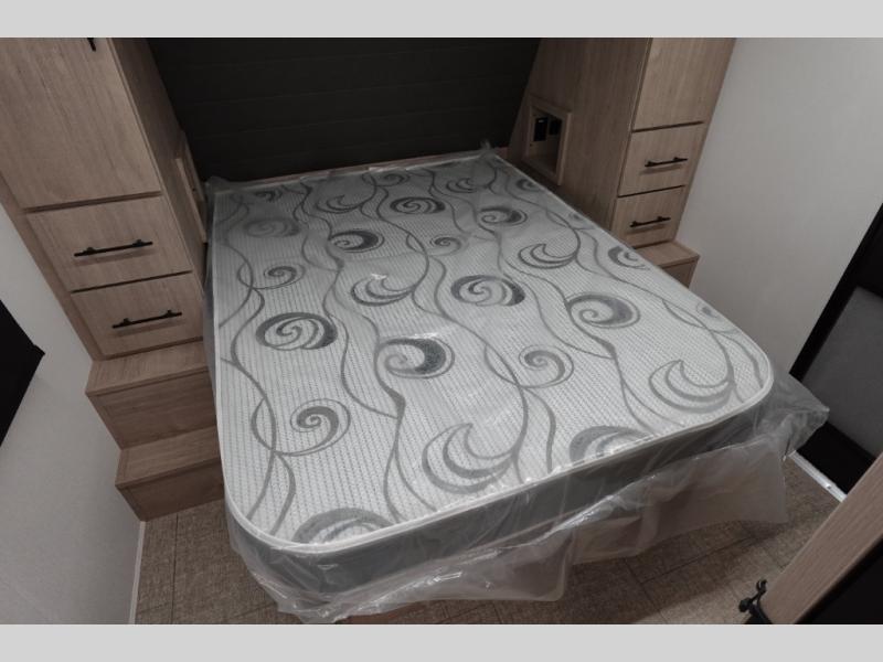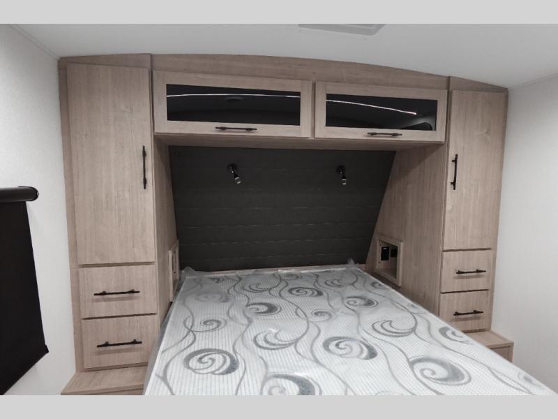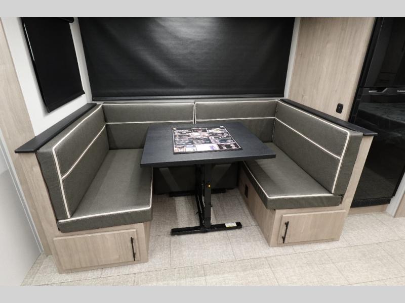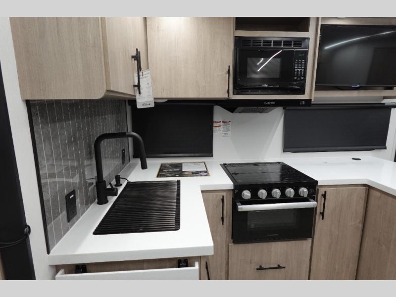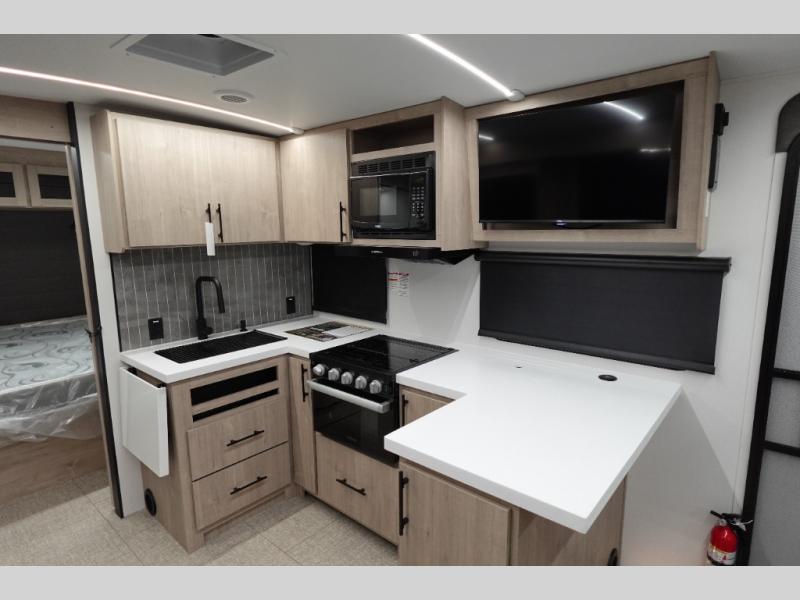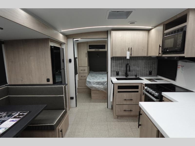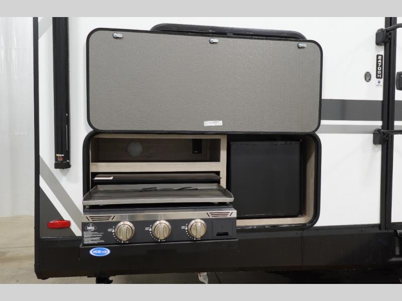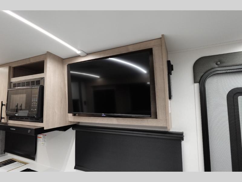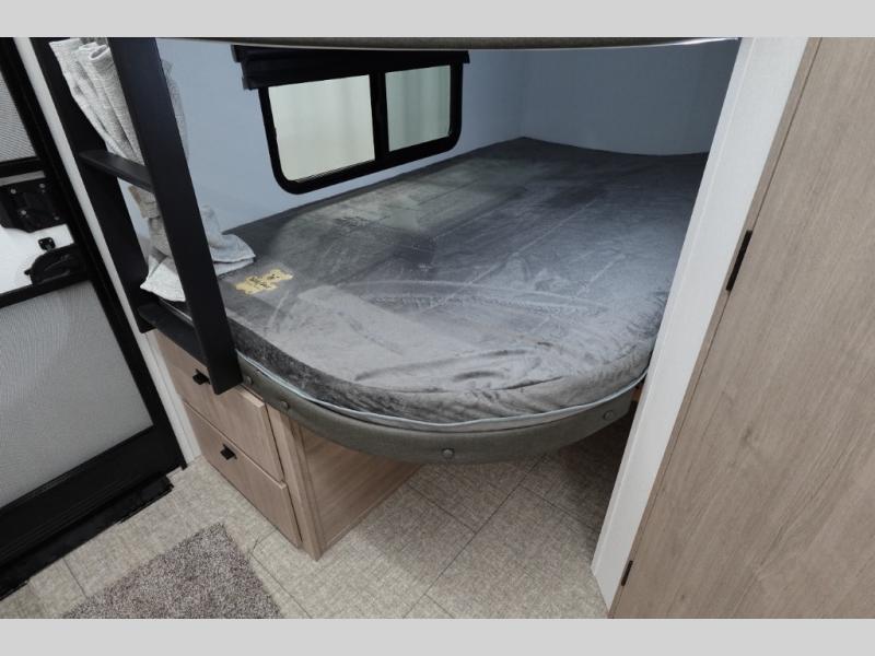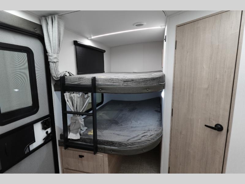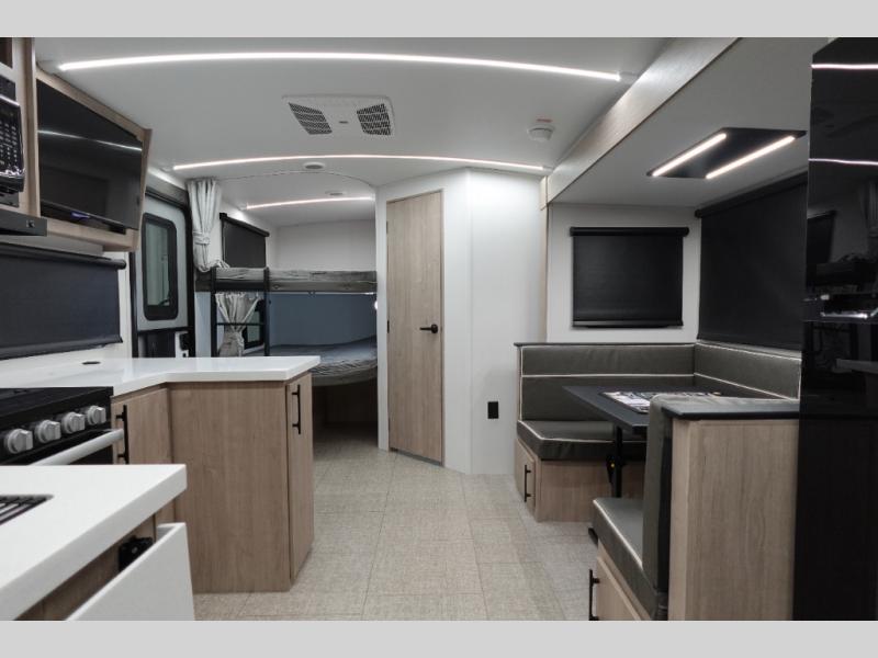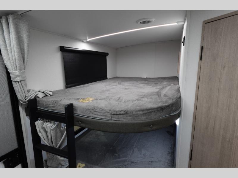 Unleash adventure with this incredible travel trailer! Sleep in style in the serene bedroom, featuring a plush queen bed, spacious wardrobe, and TV prep for entertainment. The kitchen is equipped with a pull-out pantry, 10 cu. refrigerator, microwave, and three-burner cooktop for delicious meal prep. Enjoy extra counter space with the flip-up countertop extension, optimal for easy and comfortable cooking. Family and friends can dine at the U-shaped dinette while watching the LED HDTV for added entertainment. The full bathroom offers a shower, and linen closet. Kids will love the double bunk bed, perfect for taking a nap. On the exterior, you will find the outdoor kitchen, pass-thru storage, and 20” x 20” baggage door/trash can storage, ideal for a better organization of your belongings. Finally, create outdoor activities without worrying about the weather thanks to the 19’ awning.
