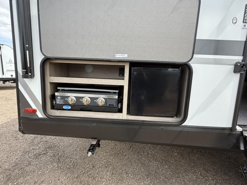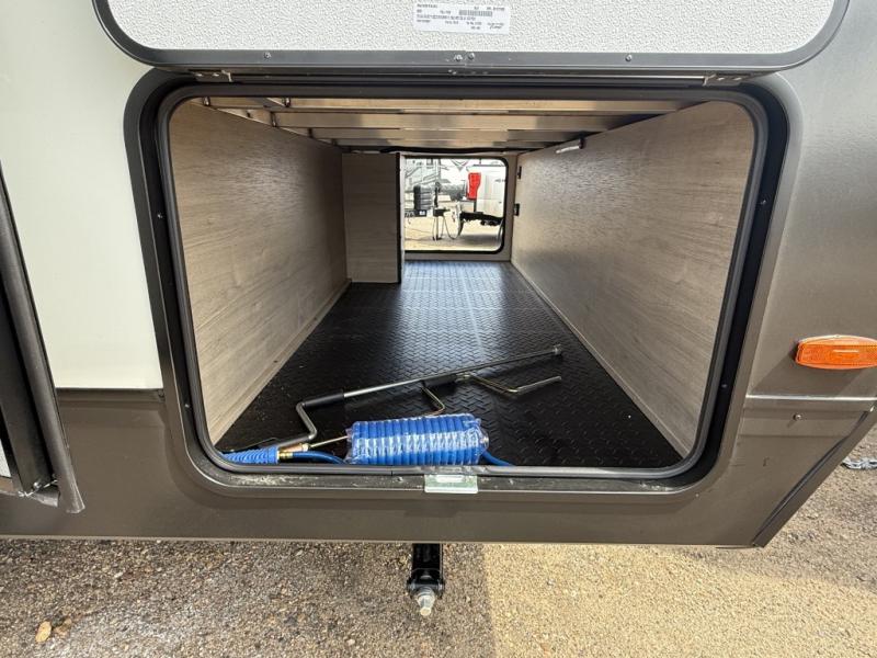 Unleash adventure with this incredible travel trailer! Sleep in style in the serene bedroom, featuring a plush queen bed, spacious wardrobe, and TV prep for entertainment. The kitchen is equipped with a pull-out pantry, 10 cu. refrigerator, microwave, and three-burner cooktop for delicious meal prep. Enjoy extra counter space with the flip-up countertop extension, optimal for easy and comfortable cooking. Family and friends can dine at the U-shaped dinette while watching the LED HDTV for added entertainment. The full bathroom offers a shower, and linen closet. Kids will love the double bunk bed, perfect for taking a nap. On the exterior, you will find the outdoor kitchen, pass-thru storage, and 20” x 20” baggage door/trash can storage, ideal for a better organization of your belongings. Finally, create outdoor activities without worrying about the weather thanks to the 19’ awning.