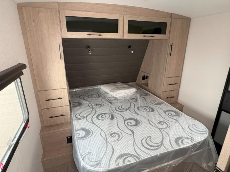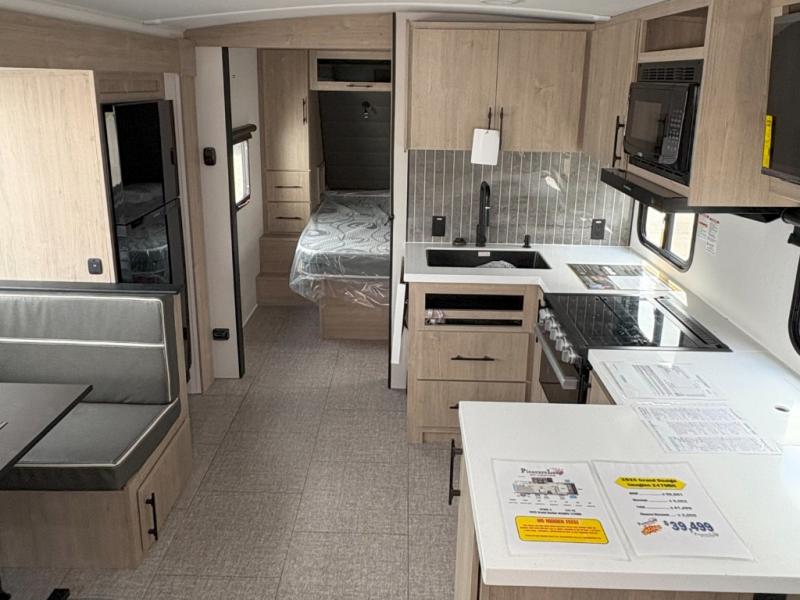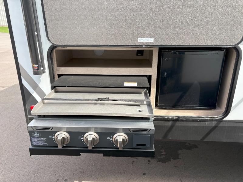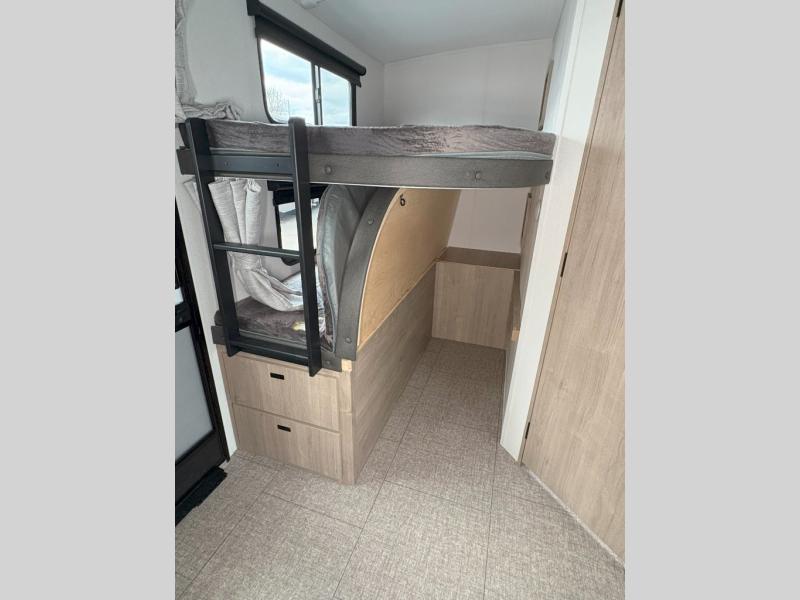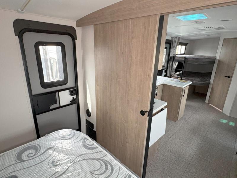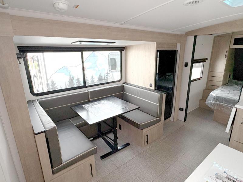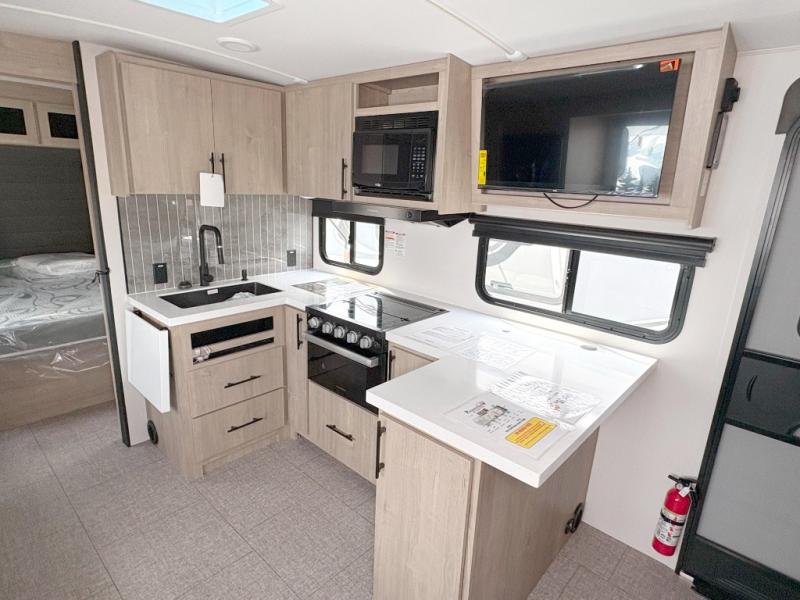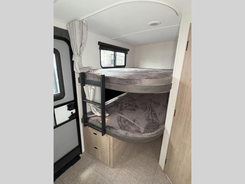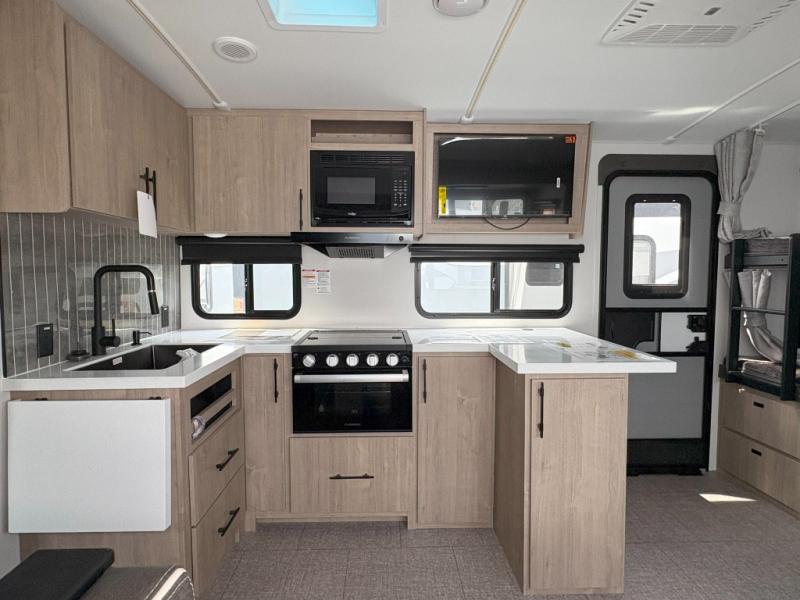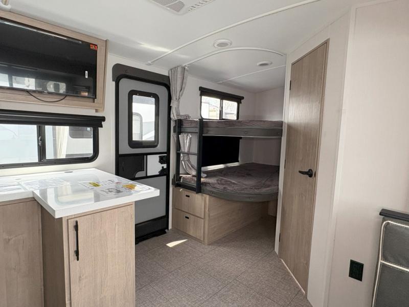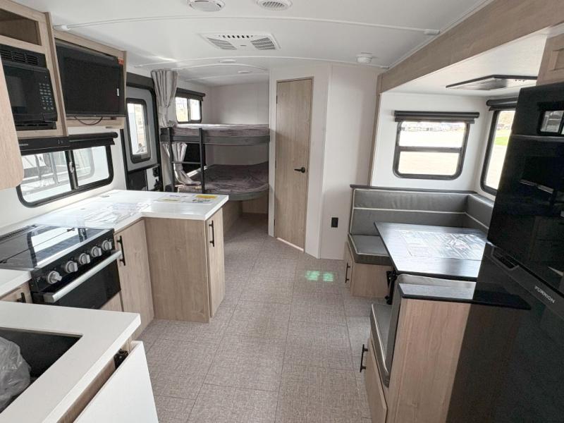 Unleash adventure with this incredible travel trailer! Sleep in style in the serene bedroom, featuring a plush queen bed, spacious wardrobe, and TV prep for entertainment. The kitchen is equipped with a pull-out pantry, 10 cu. refrigerator, microwave, and three-burner cooktop for delicious meal prep. Enjoy extra counter space with the flip-up countertop extension, optimal for easy and comfortable cooking. Family and friends can dine at the U-shaped dinette while watching the LED HDTV for added entertainment. The full bathroom offers a shower, and linen closet. Kids will love the double bunk bed, perfect for taking a nap. On the exterior, you will find the outdoor kitchen, pass-thru storage, and 20” x 20” baggage door/trash can storage, ideal for a better organization of your belongings. Finally, create outdoor activities without worrying about the weather thanks to the 19’ awning.