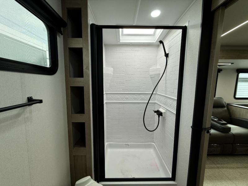 - The rear full bath includes a 30" x 36" shower with a skylight, providing a spacious and bright experience.