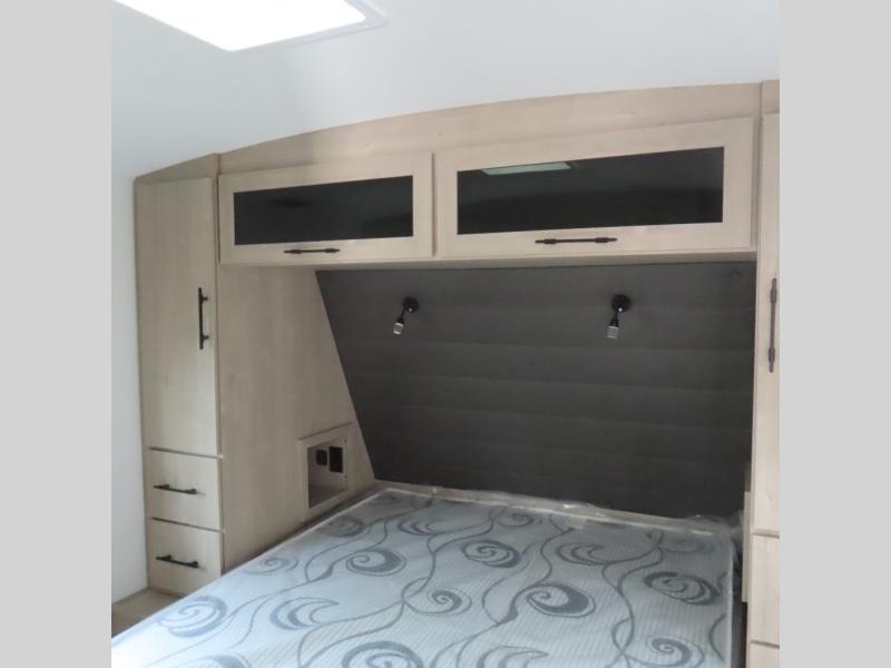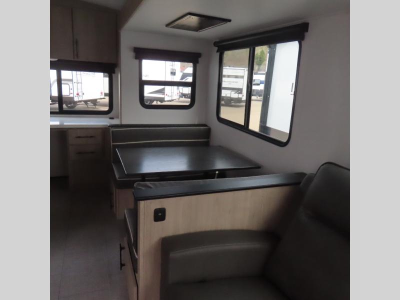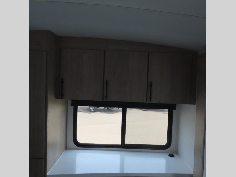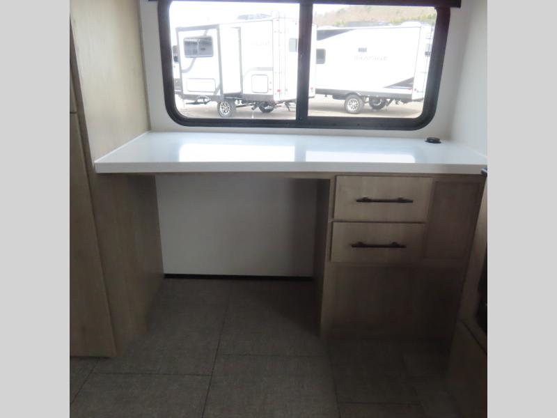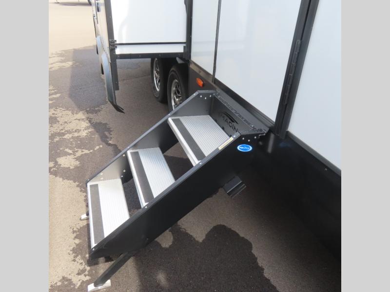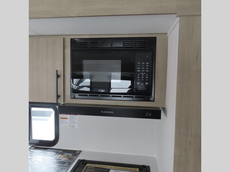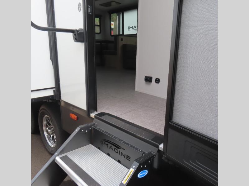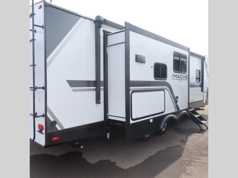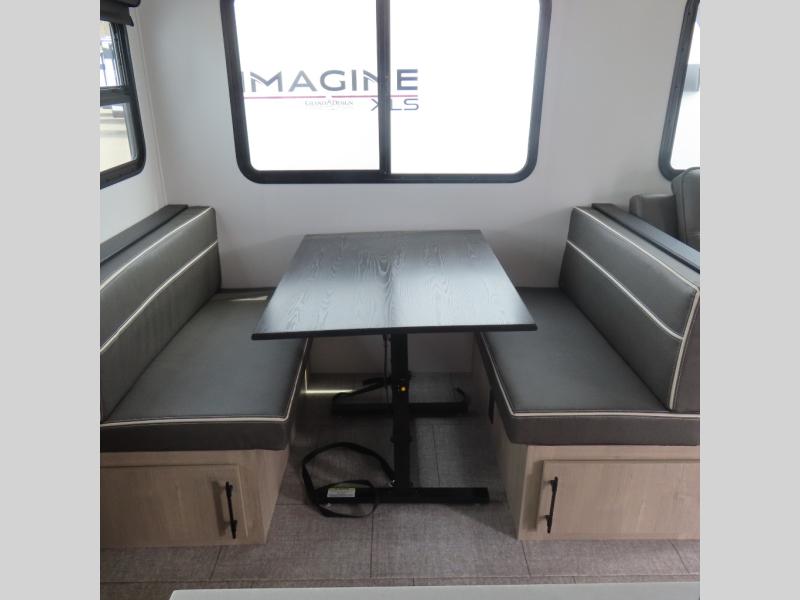With this Imagine travel trailer, you can work while you're on the road because it offers you a desk in the main living area. You won't have to miss out on the action since you'll be right next to the booth dinette and tri-fold sofa, and there is even a pantry directly to the left of the desk for you to grab a quick snack while you're working. Once you're done with work, you can relax on the tri-fold sofa while you watch the telescoping LED HDTV, and the private bedroom offers you a 60" x 80" queen bed to rest on when you're ready to call it a night.