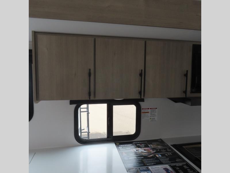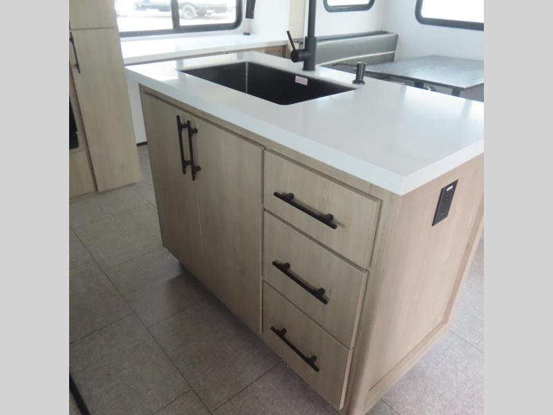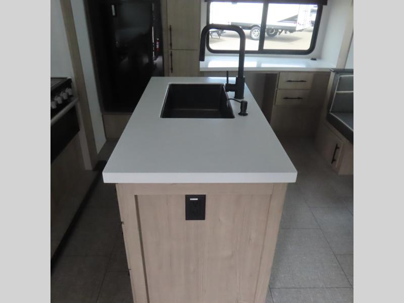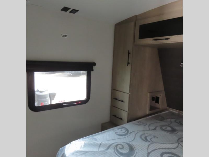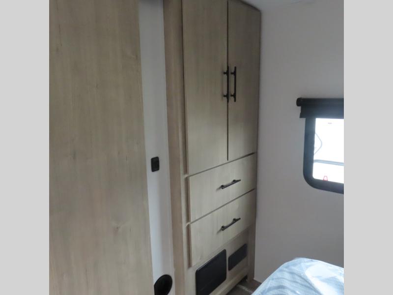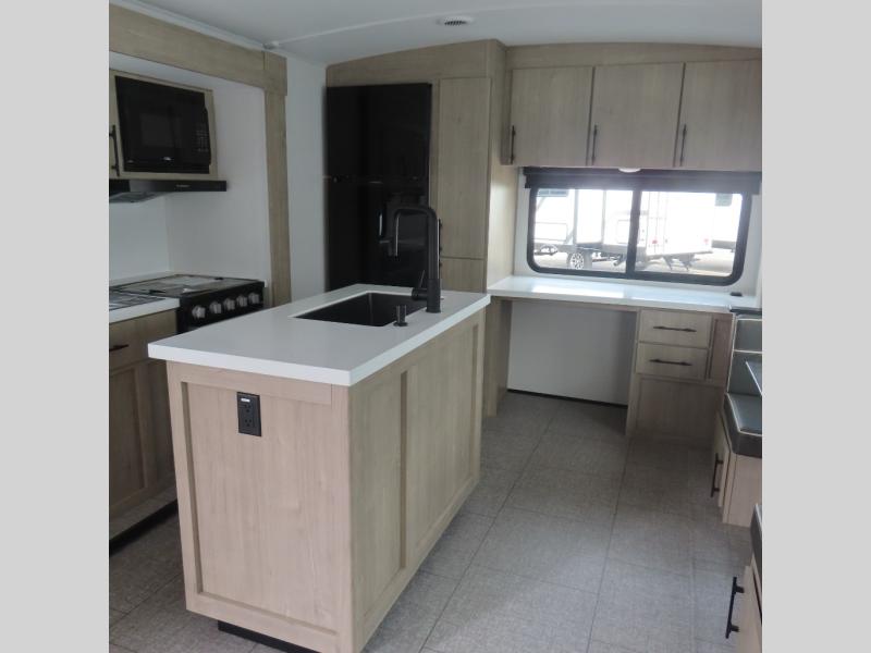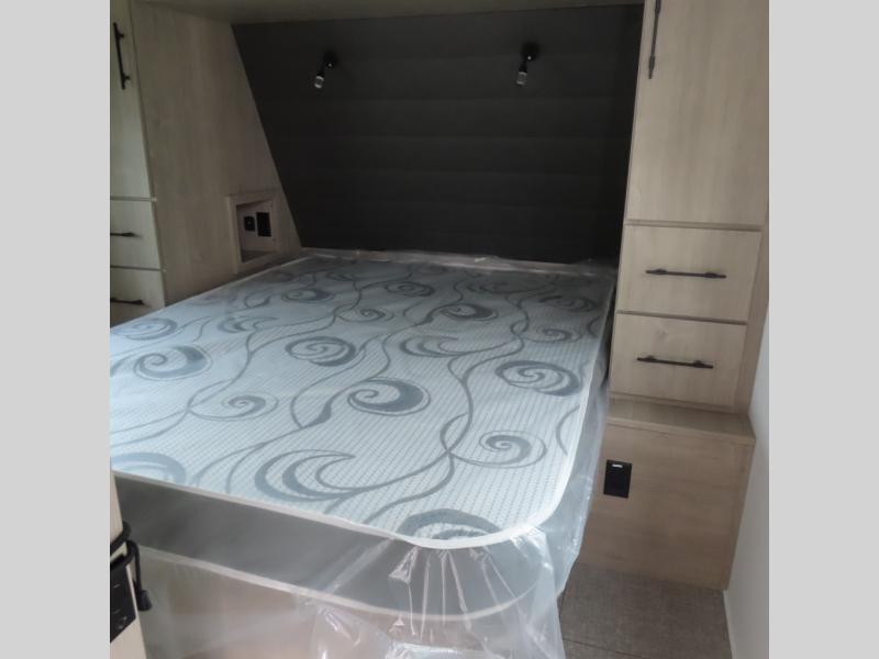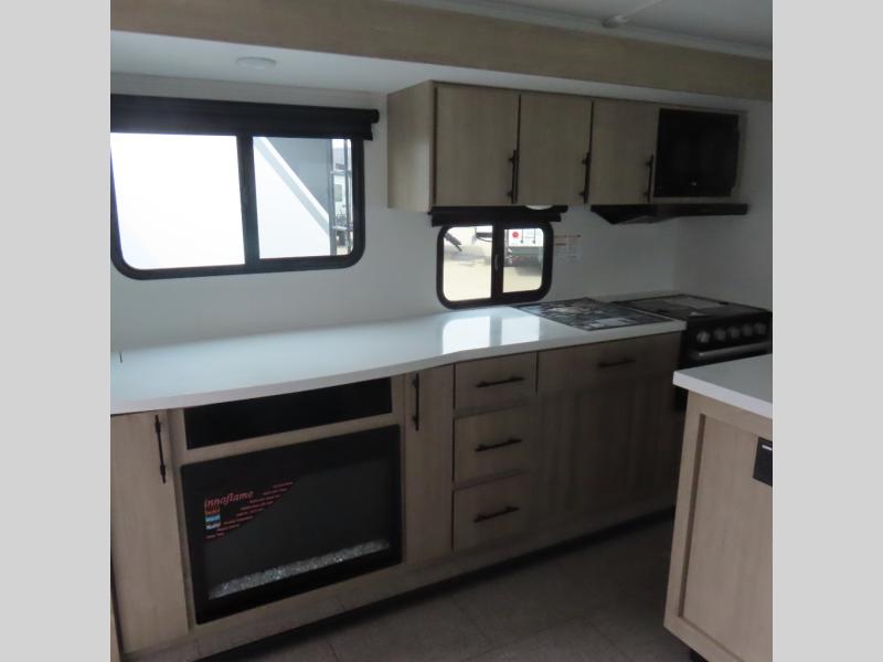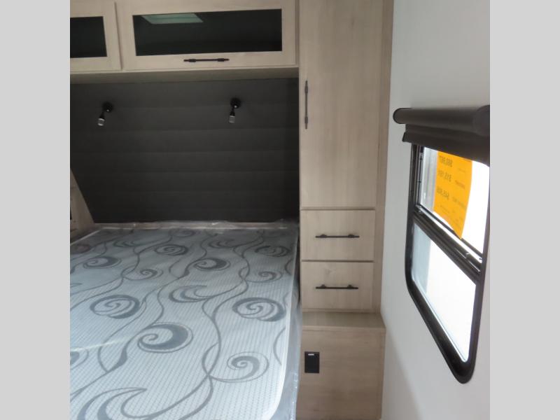With this Imagine travel trailer, you can work while you're on the road because it offers you a desk in the main living area. You won't have to miss out on the action since you'll be right next to the booth dinette and tri-fold sofa, and there is even a pantry directly to the left of the desk for you to grab a quick snack while you're working. Once you're done with work, you can relax on the tri-fold sofa while you watch the telescoping LED HDTV, and the private bedroom offers you a 60" x 80" queen bed to rest on when you're ready to call it a night.