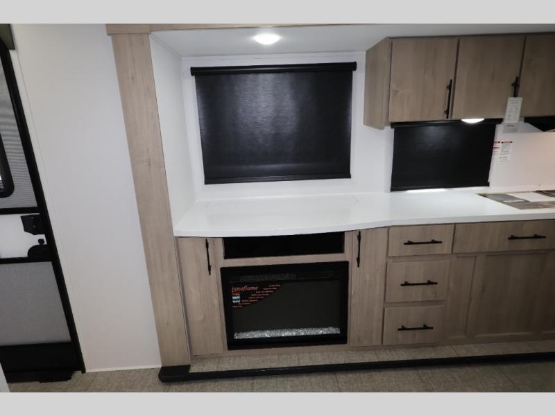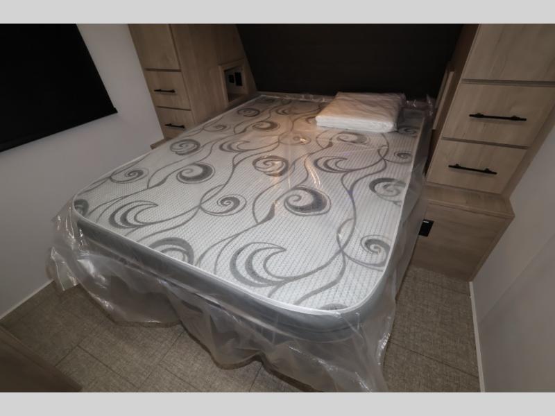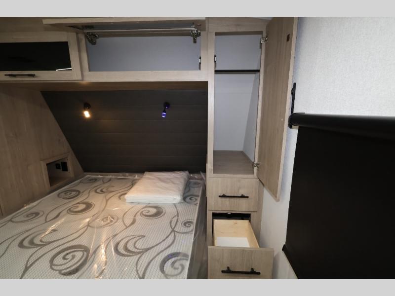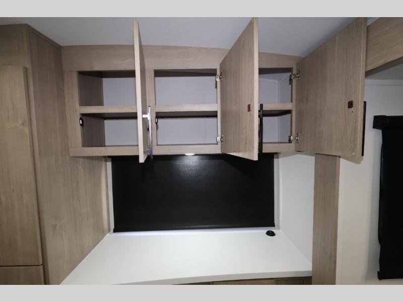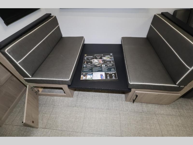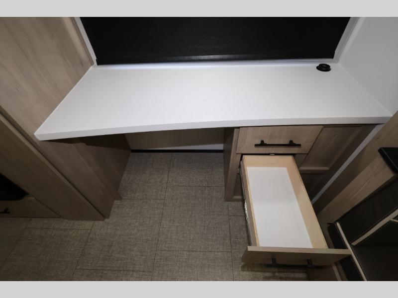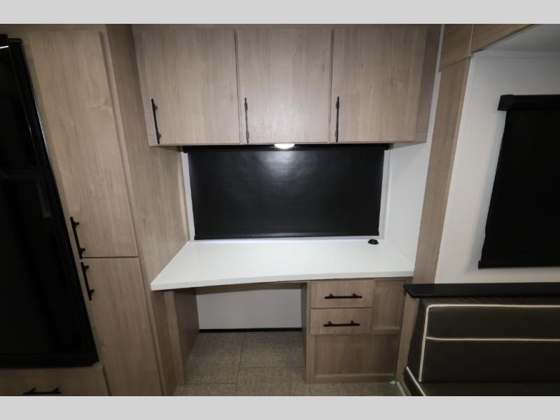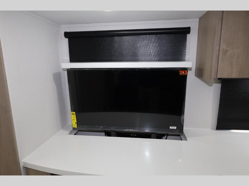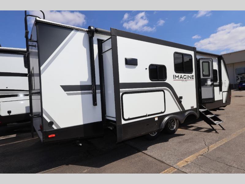 With this Imagine travel trailer, you can work while you're on the road because it offers you a desk in the main living area. You won't have to miss out on the action since you'll be right next to the booth dinette and tri-fold sofa, and there is even a pantry directly to the left of the desk for you to grab a quick snack while you're working. Once you're done with work, you can relax on the tri-fold sofa while you watch the telescoping LED HDTV, and the private bedroom offers you a 60" x 80" queen bed to rest on when you're ready to call it a night.