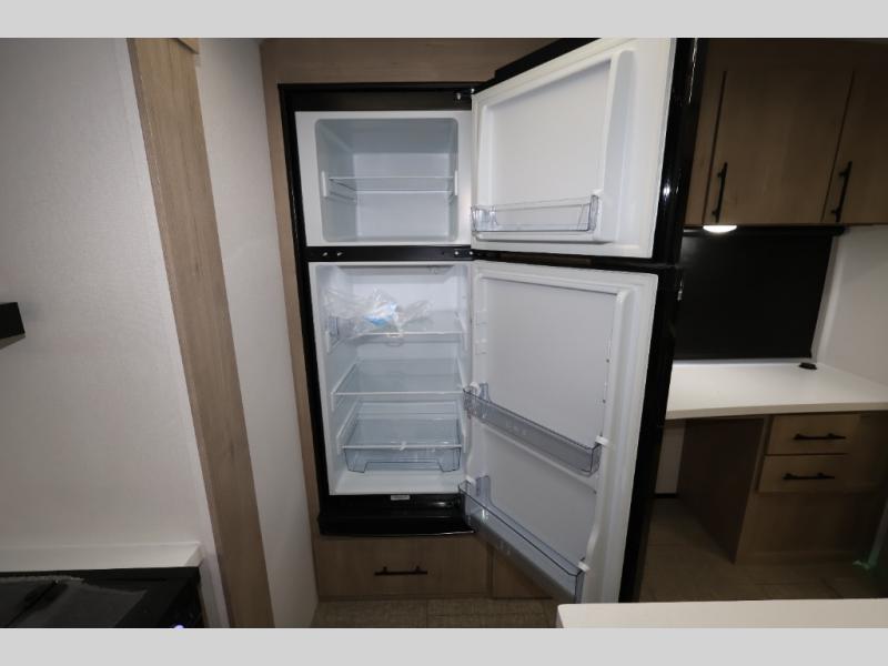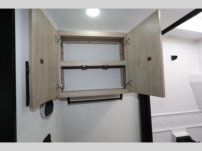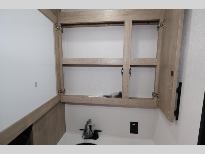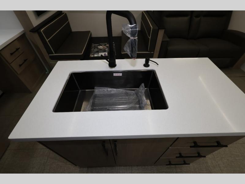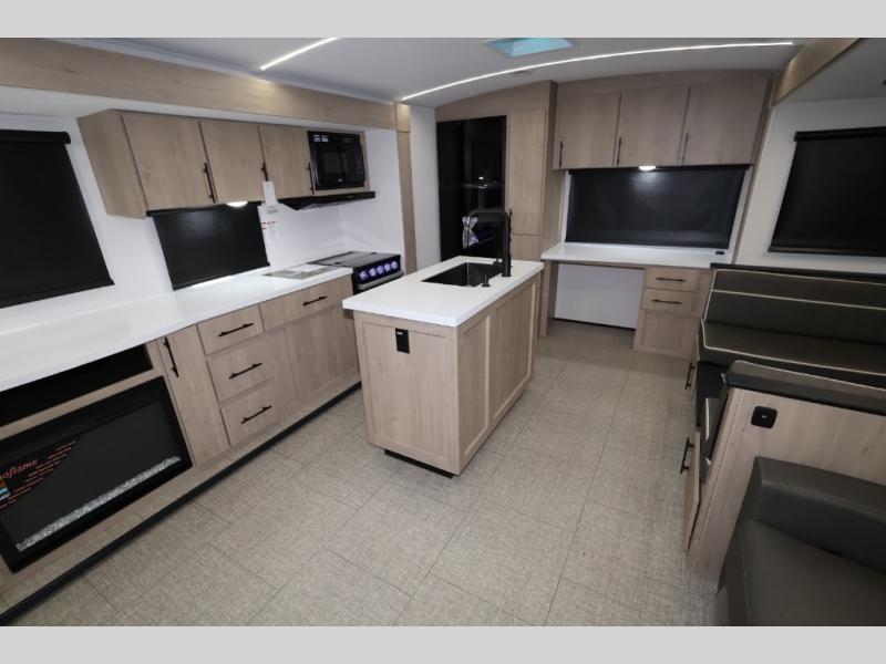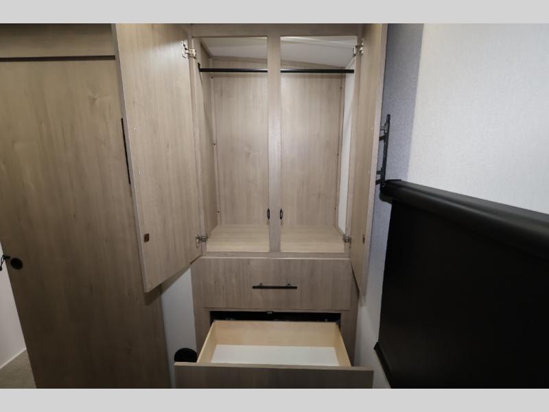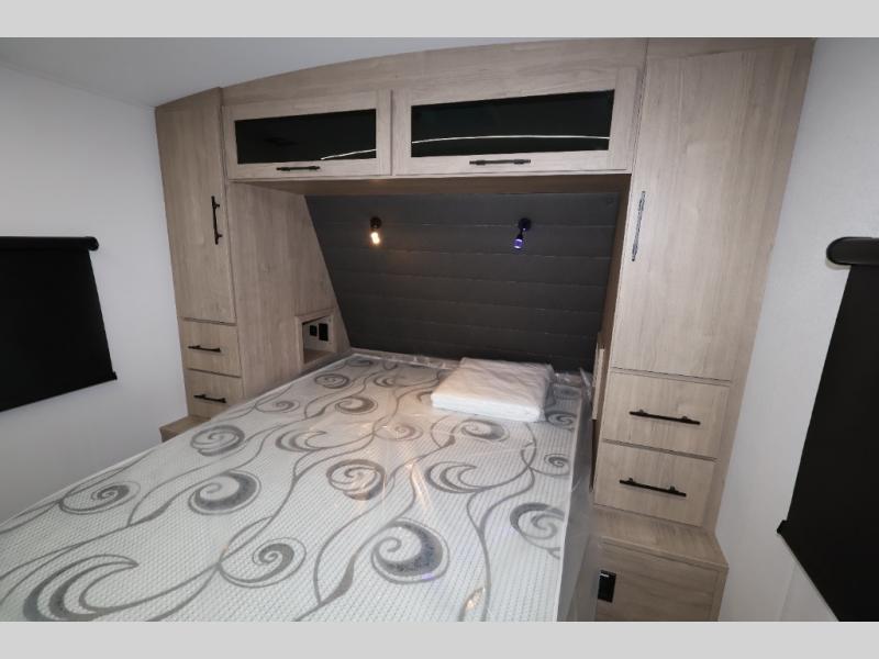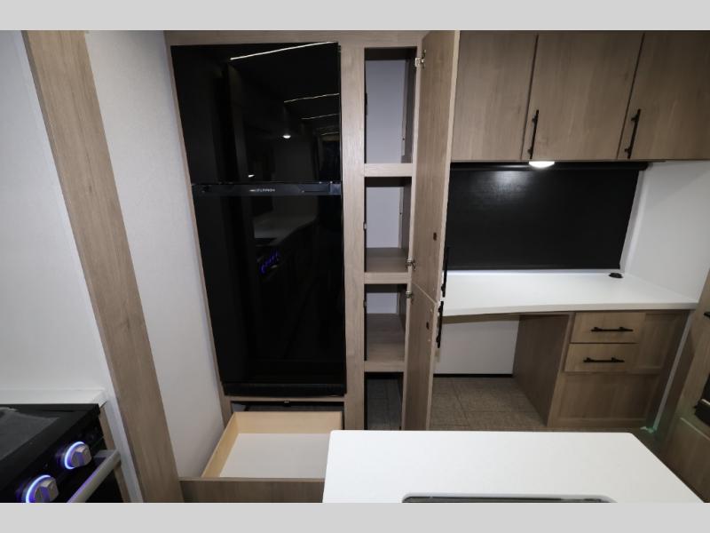 With this Imagine travel trailer, you can work while you're on the road because it offers you a desk in the main living area. You won't have to miss out on the action since you'll be right next to the booth dinette and tri-fold sofa, and there is even a pantry directly to the left of the desk for you to grab a quick snack while you're working. Once you're done with work, you can relax on the tri-fold sofa while you watch the telescoping LED HDTV, and the private bedroom offers you a 60" x 80" queen bed to rest on when you're ready to call it a night.