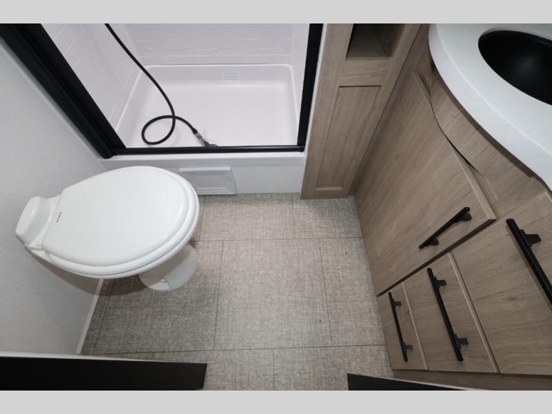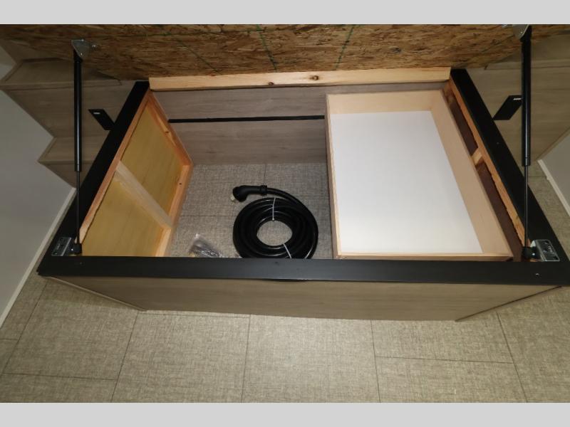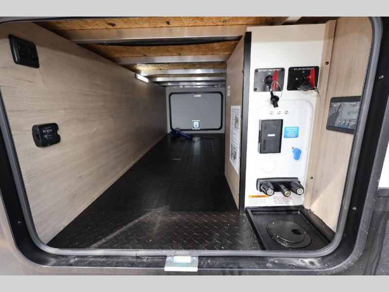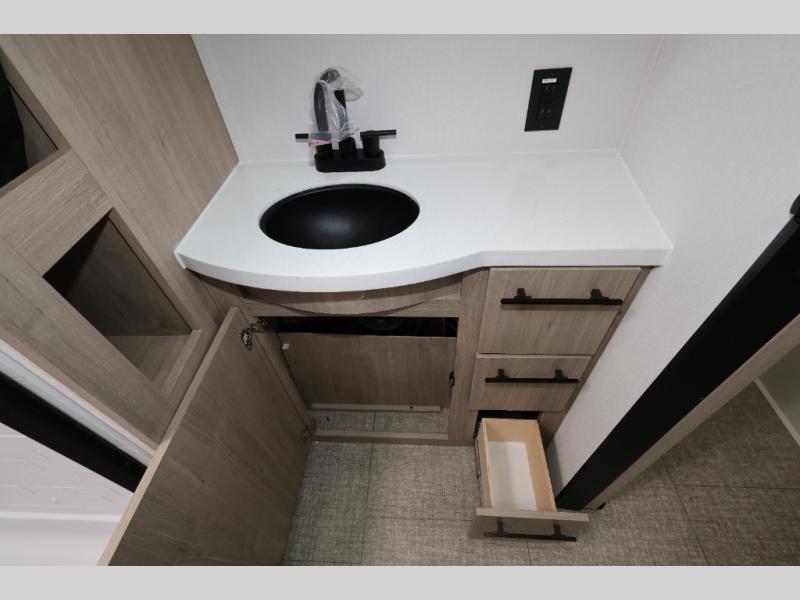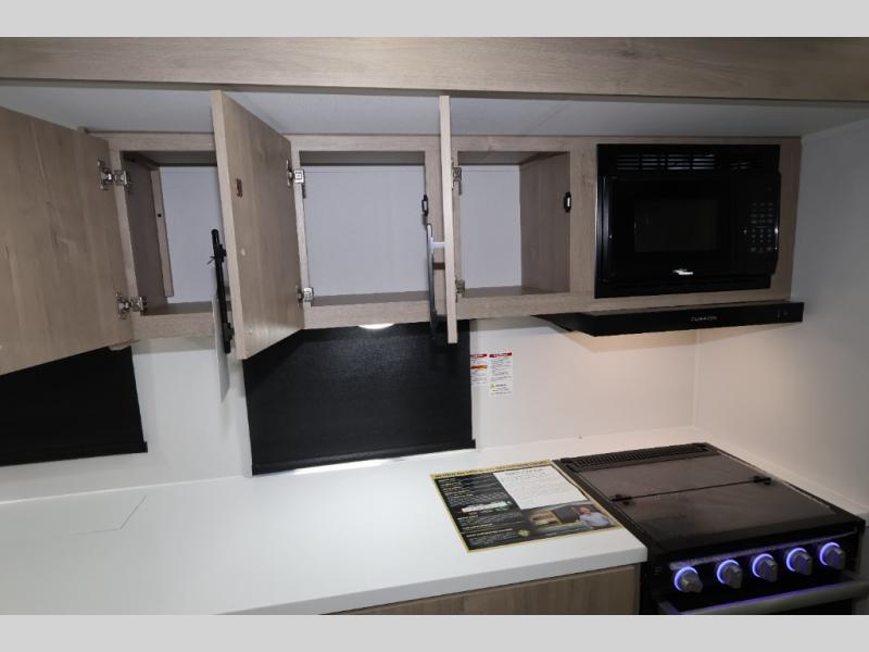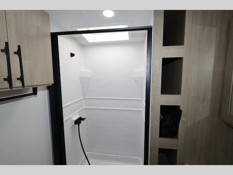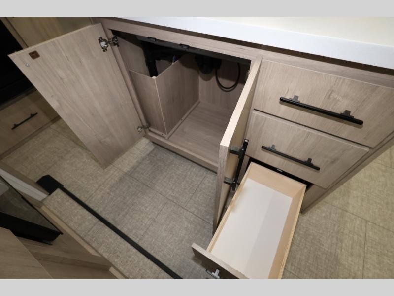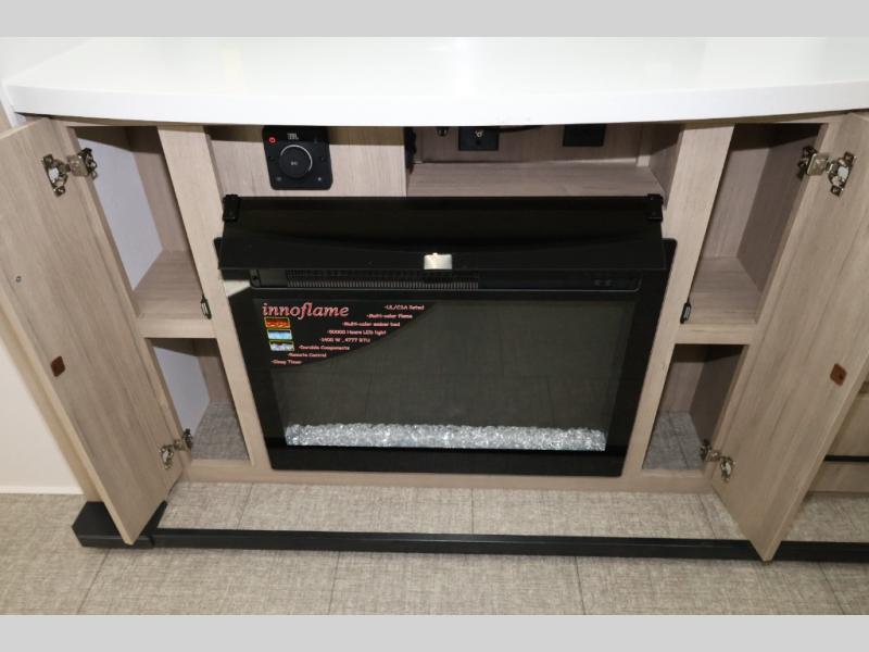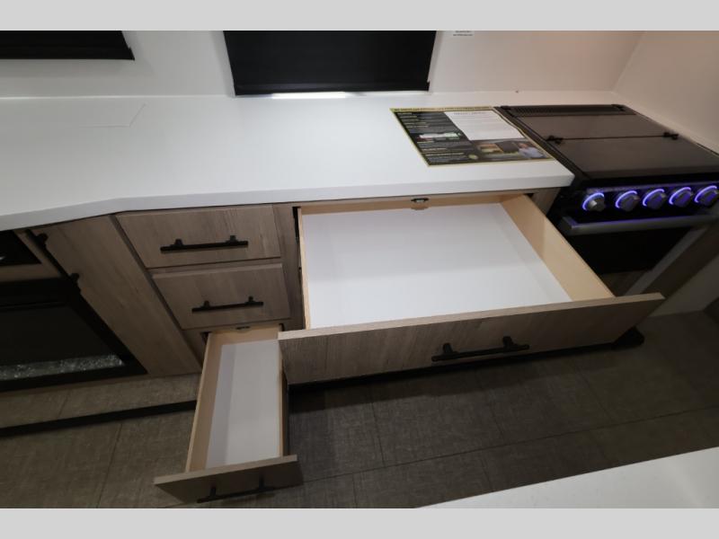 With this Imagine travel trailer, you can work while you're on the road because it offers you a desk in the main living area. You won't have to miss out on the action since you'll be right next to the booth dinette and tri-fold sofa, and there is even a pantry directly to the left of the desk for you to grab a quick snack while you're working. Once you're done with work, you can relax on the tri-fold sofa while you watch the telescoping LED HDTV, and the private bedroom offers you a 60" x 80" queen bed to rest on when you're ready to call it a night.