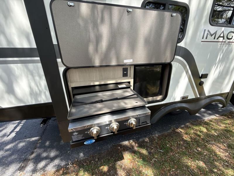 Just imagine leaving the world behind and secluding yourself away with your favorite people in your Grand Design Imagine travel trailer! The Imagine has been designed to enjoy extended season camping and includes a high-capacity furnace, a heated and enclosed underbelly with suspended tanks, a designated heat duct to the subfloor, and a high-density roof insulation with attic vent. You'll have maximum head room on the interior with 81" radius ceilings, and large panoramic windows to let in natural lighting. The exclusive drop-frame pass-through storage compartment is going to allow you to bring along lots of equipment, and the universal docking station is an all-in-one location for utilities and hook-ups. You'll also have oversized tank capacities so that you can fill and empty your tanks less often.