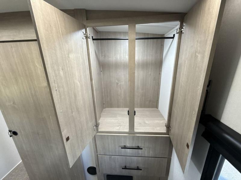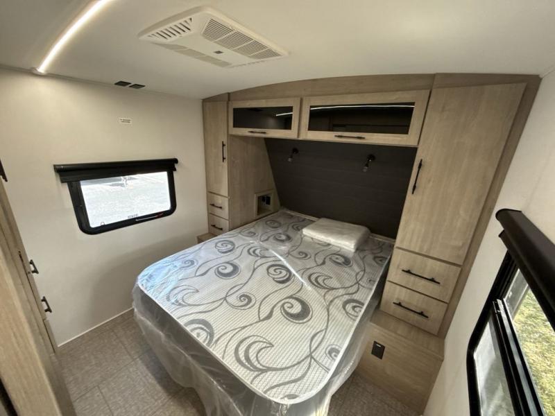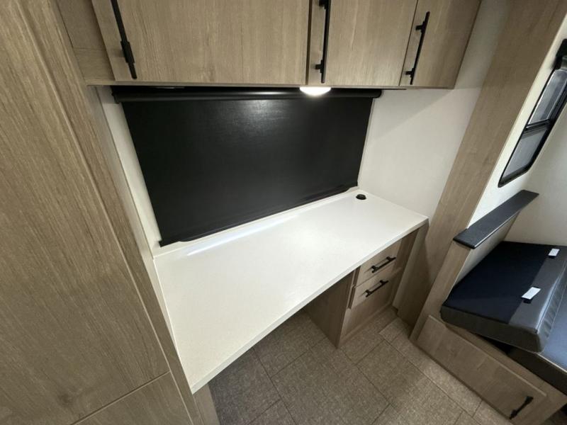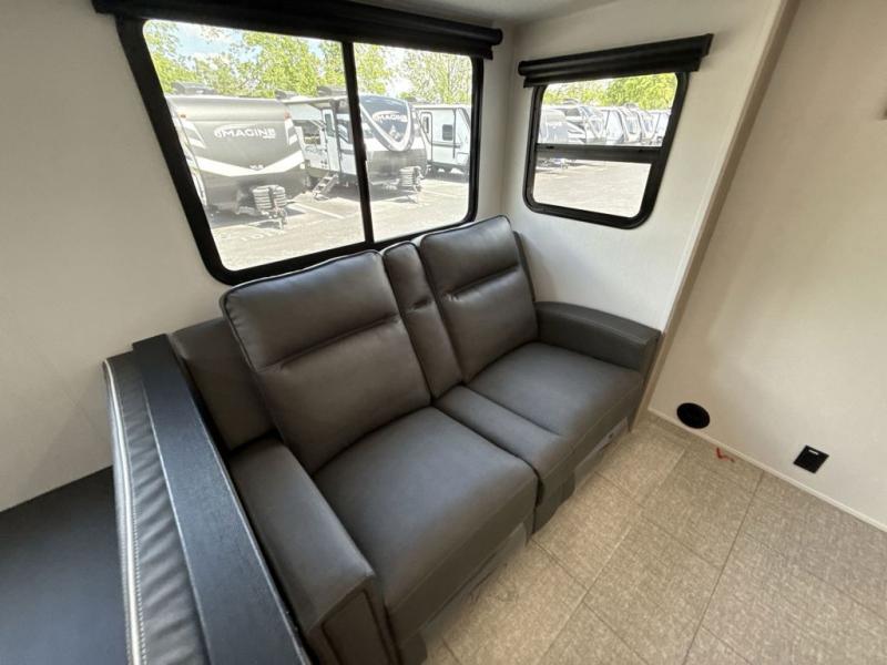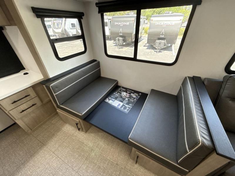 With this Imagine travel trailer, you can work while you're on the road because it offers you a desk in the main living area. You won't have to miss out on the action since you'll be right next to the booth dinette and tri-fold sofa, and there is even a pantry directly to the left of the desk for you to grab a quick snack while you're working. Once you're done with work, you can relax on the tri-fold sofa while you watch the telescoping LED HDTV, and the private bedroom offers you a 60" x 80" queen bed to rest on when you're ready to call it a night.