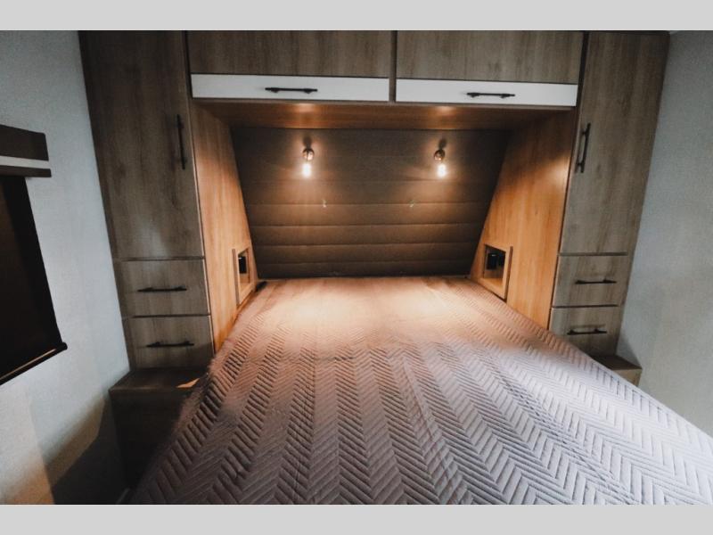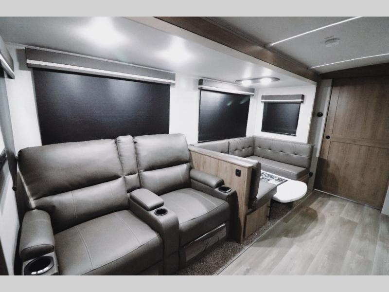 The exterior of the 2025 Grand Design Imagine 2800BH is designed to impress. The sleek, modern lines are complemented by premium gel-coat fiberglass siding, providing durability and a polished look. The large awning with LED lighting creates the perfect outdoor living space, while the pass-through storage compartment offers ample space for all your gear. Dual entry doors provide easy access to both the living area and the bathroom, ensuring convenience for all your adventures.
