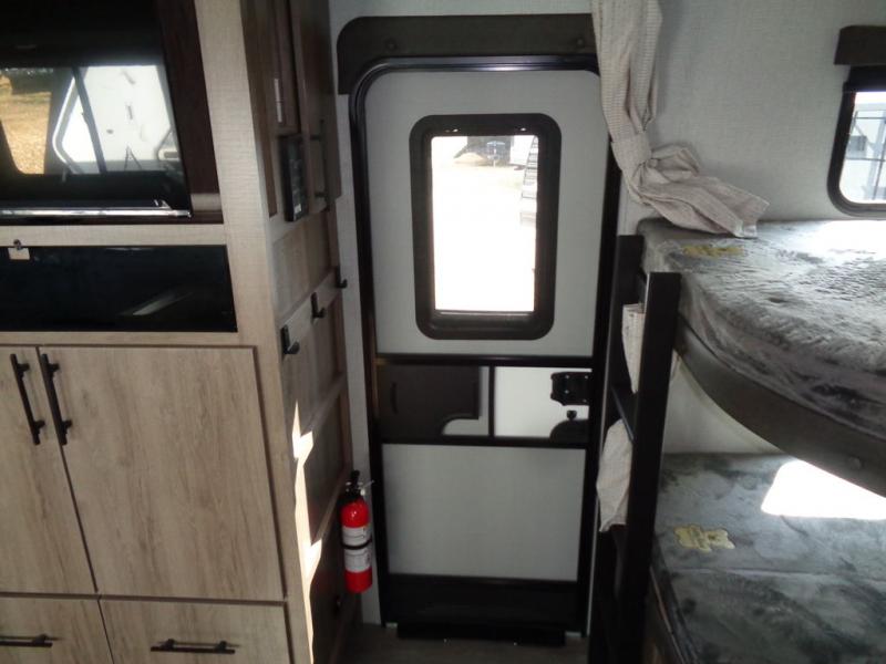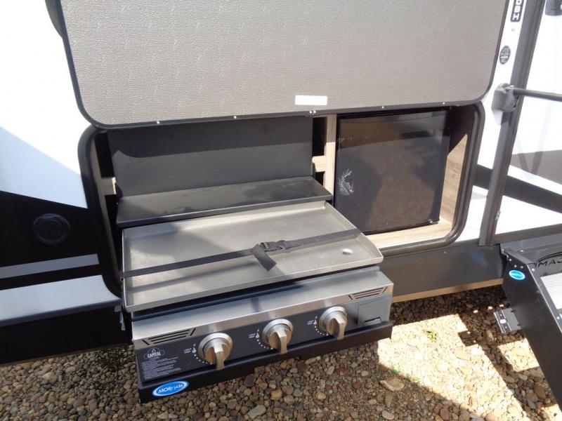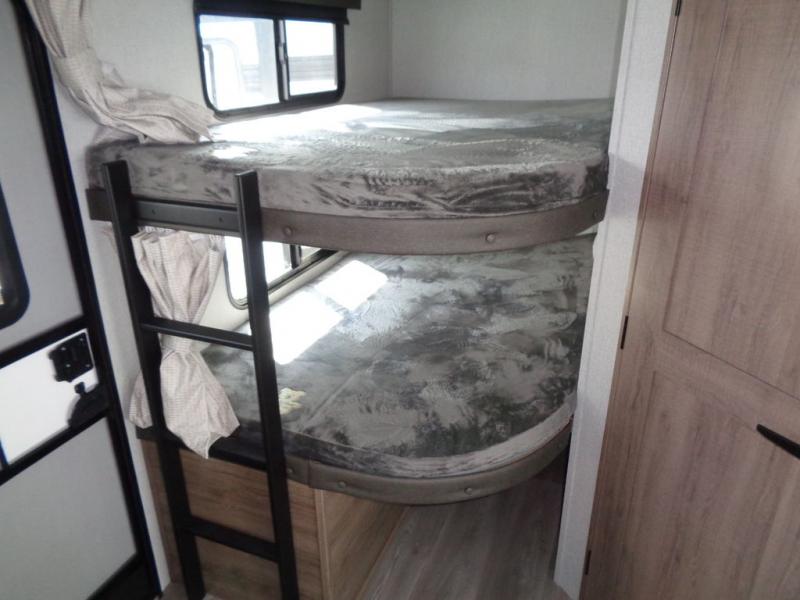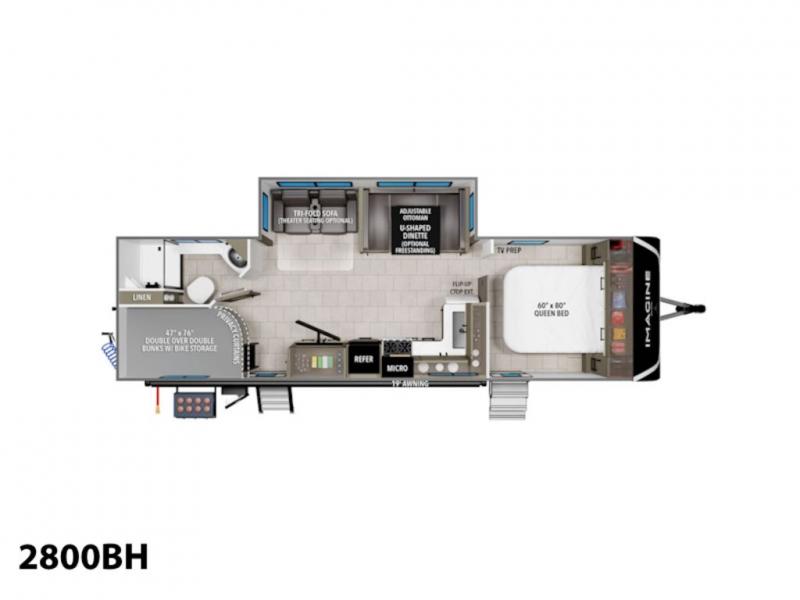Where will you go with this Imagine travel trailer? The possibilities are endless! You can take your family on an exciting excursion because this trailer has enough sleeping space for everyone with a 60" x 80" queen bed in the private bedroom, a U-shaped dinette and tri-fold sofa in the main living area, and there is a set of 47" x 76" bunk beds with privacy curtains in the rear corner. You can come and go as you please with two entry doors, and the outdoor griddle and refrigerator will be fun to use when the weather is nice. The flip-up countertop extension will make it easier to prepare delicious home cooked meals and the shoe storage area helps to keep things neat and tidy.
