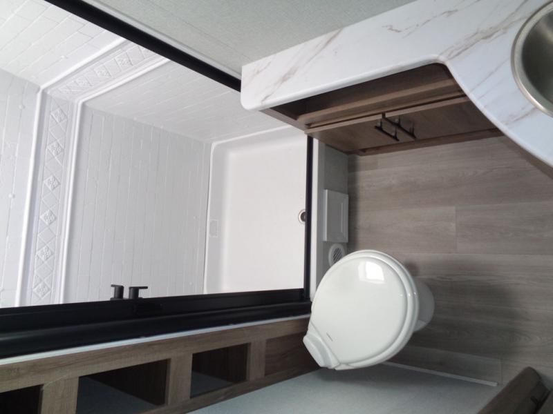 What I liked most: Bunk area area lifts up for additional storage which is very unique. Place for shoes. The bathroom shower surround has a brick molded design look.