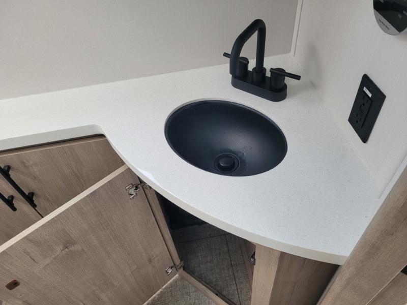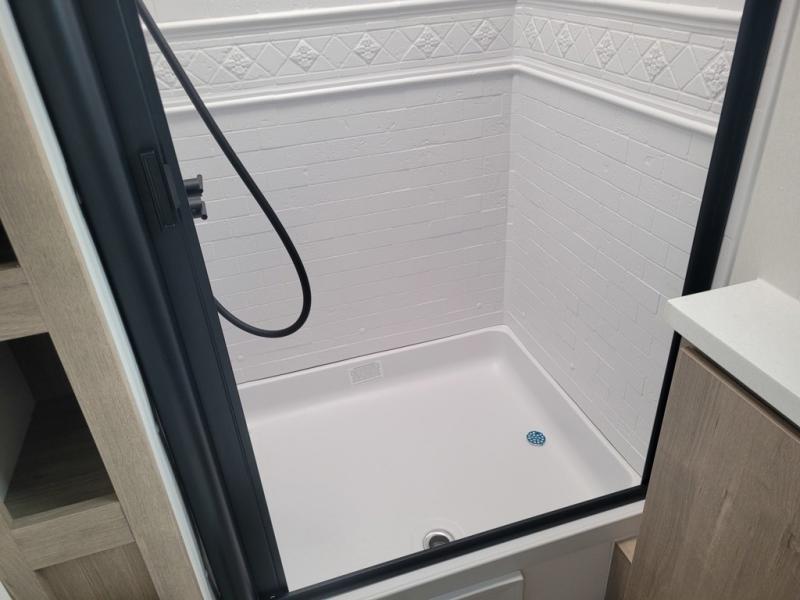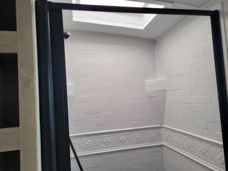 What I liked most: Bunk area area lifts up for additional storage which is very unique. Place for shoes. The bathroom shower surround has a brick molded design look.