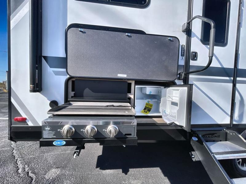 Where will you go with this Imagine travel trailer? The possibilities are endless! You can take your family on an exciting excursion because this trailer has enough sleeping space for everyone with a 60" x 80" queen bed in the private bedroom, a U-shaped dinette and tri-fold sofa in the main living area, and there is a set of 47" x 76" bunk beds with privacy curtains in the rear corner. You can come and go as you please with two entry doors, and the outdoor griddle and refrigerator will be fun to use when the weather is nice. The flip-up countertop extension will make it easier to prepare delicious home cooked meals and the shoe storage area helps to keep things neat and tidy.
