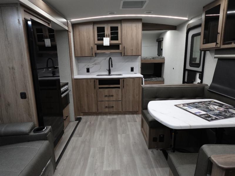 You will love this family bunkhouse trailer with dual entry/exit doors with one door leading directly into your rear private bedroom featuring a slide out queen bed, desk, and storage! A walk-through bath is also nearby for convenience and offers plenty of space being stretched across the width of the trailer. The second entry, closest to the front, leads directly into your spacious combined kitchen and living area. Here you will enjoy counter prep space for cooking, a three burner range and oven, plus overhead storage and drawers for all of your necessities. Your refrigerator is within the large slide that also houses theater seating for relaxing. A large pantry for all of your dry goods and snacks is next to the u-shaped dinette which can seat all occupants easily. In front, a private bunkhouse with a 40" x 76" top bunk and 53" x 76" bottom bunk easily sleeping three. On the outside, a spray port to rinse off feet or your furry pal, LP quick connect, and a 21' awning to provide added living space to enjoy outdoors!
