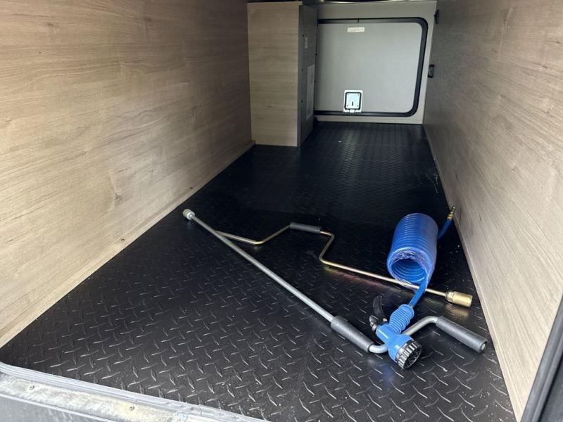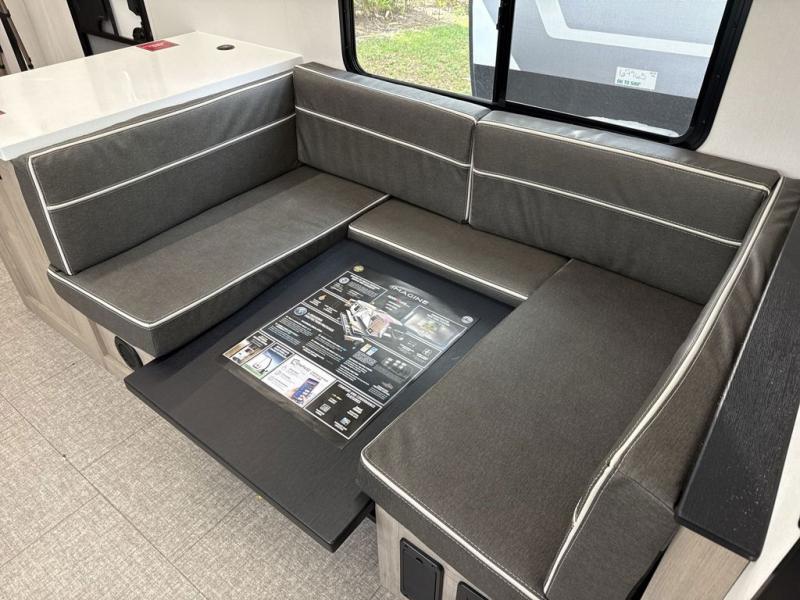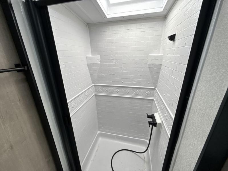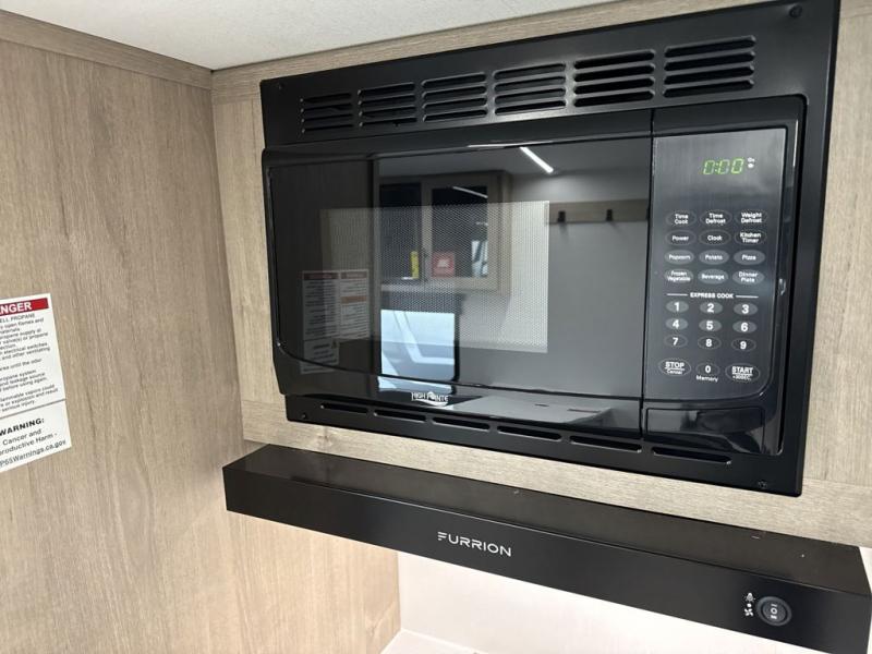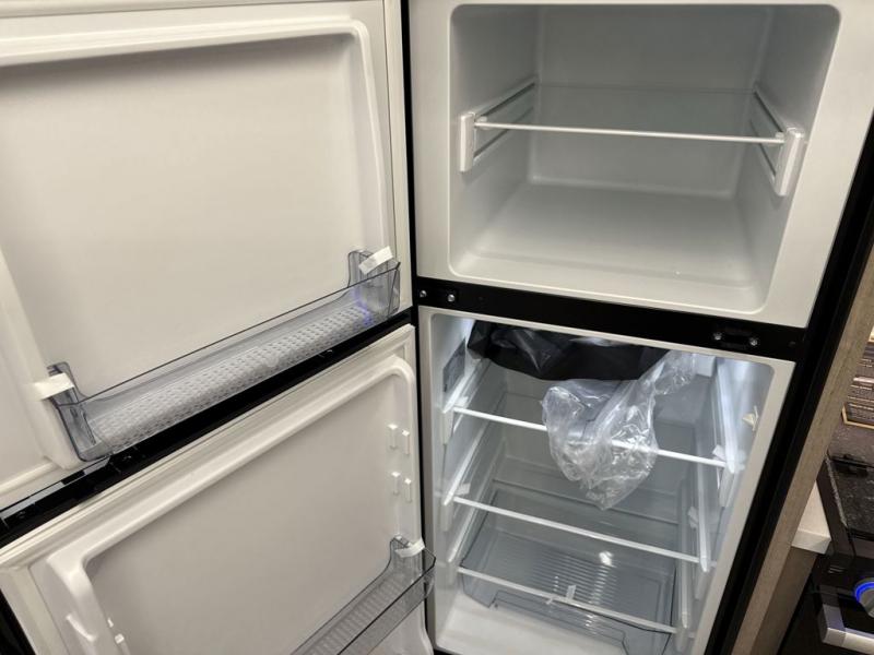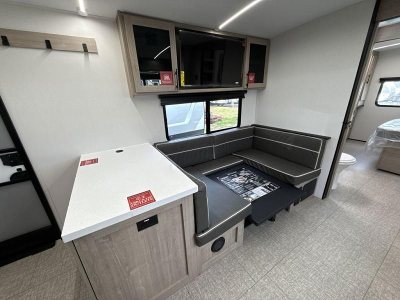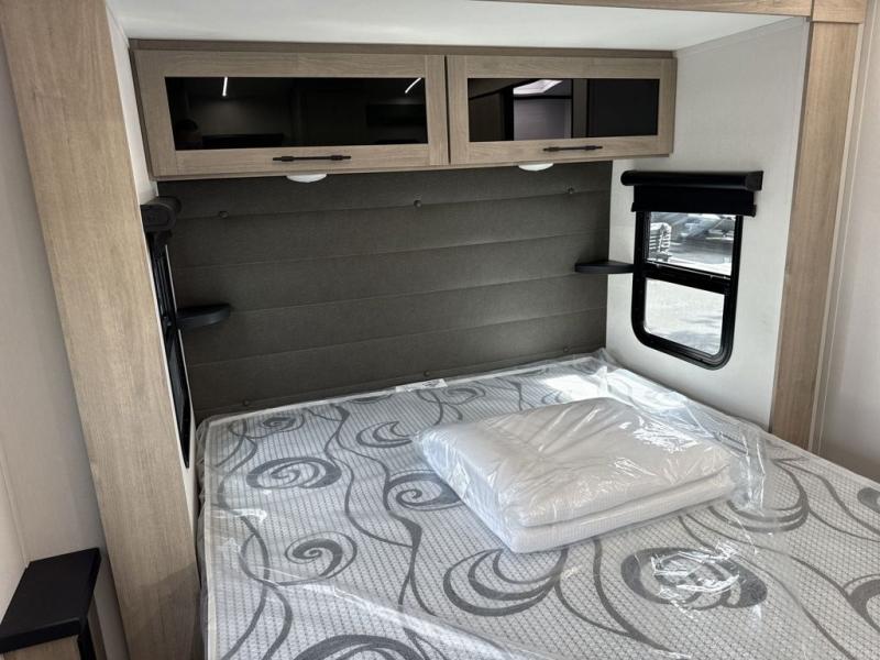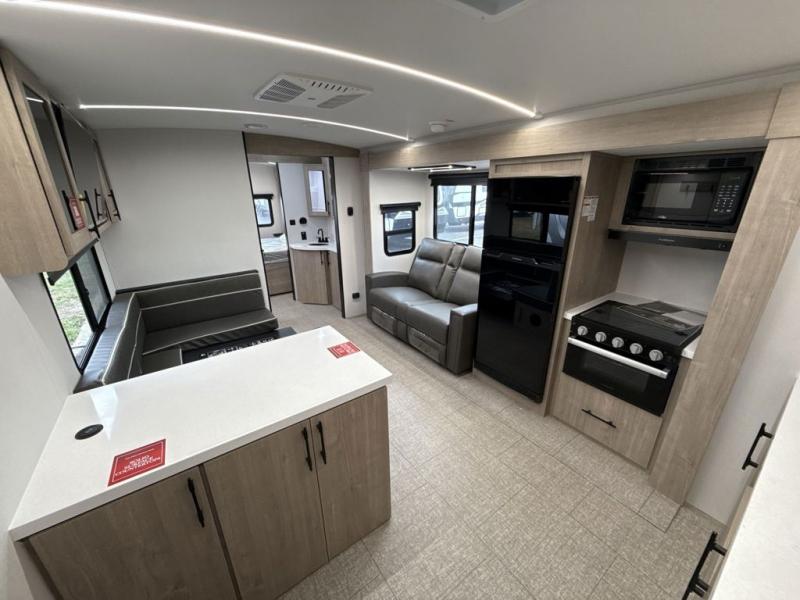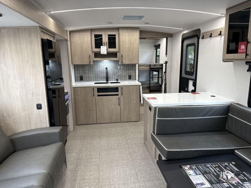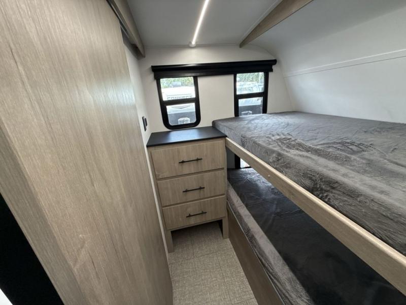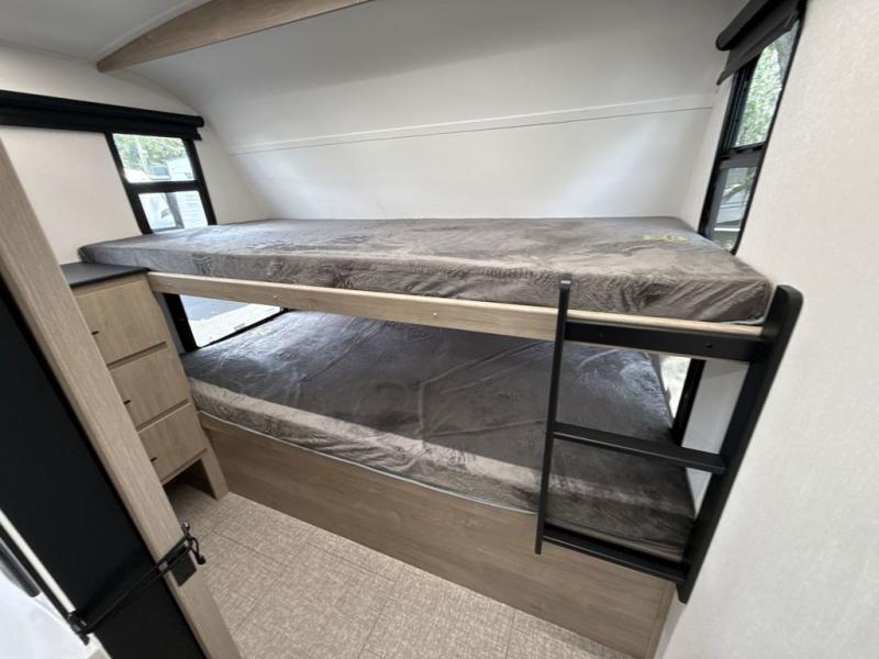 You will love this family bunkhouse trailer with dual entry/exit doors with one door leading directly into your rear private bedroom featuring a slide out queen bed, desk, and storage! A walk-through bath is also nearby for convenience and offers plenty of space being stretched across the width of the trailer. The second entry, closest to the front, leads directly into your spacious combined kitchen and living area. Here you will enjoy counter prep space for cooking, a three burner range and oven, plus overhead storage and drawers for all of your necessities. Your refrigerator is within the large slide that also houses theater seating for relaxing, or you could choose the optional tri-fold sofa if you are used to having overnight guests. This unit has a U-shaped dinette which can seat all occupants easily. In front, a private bunkhouse with a 42" x 93" top bunk and 52" x 93" bottom bunk easily sleeping three. On the outside, a spray port to rinse off feet or your furry pal, LP quick connect, and a 21' awning to provide added living space to enjoy outdoors!